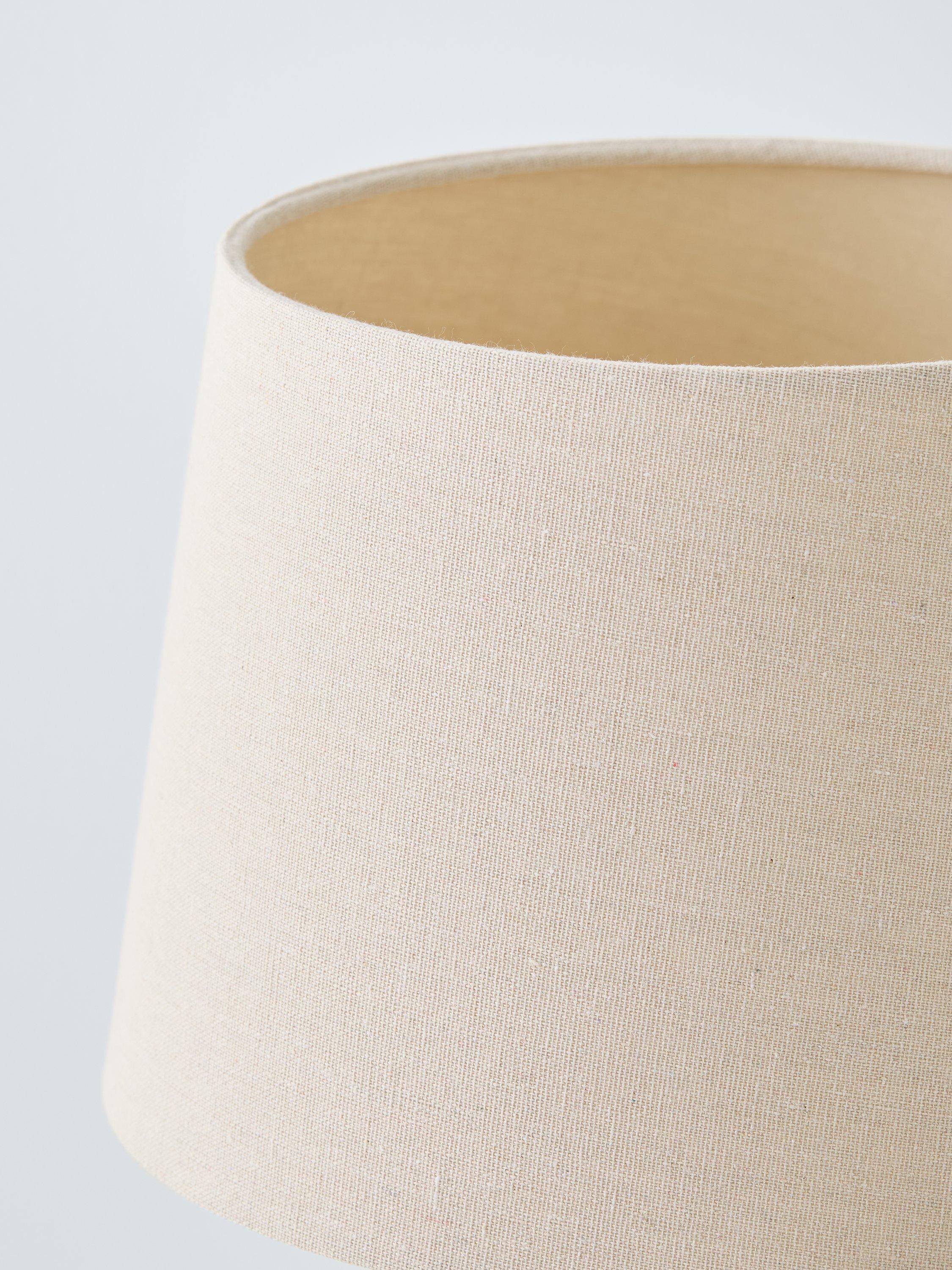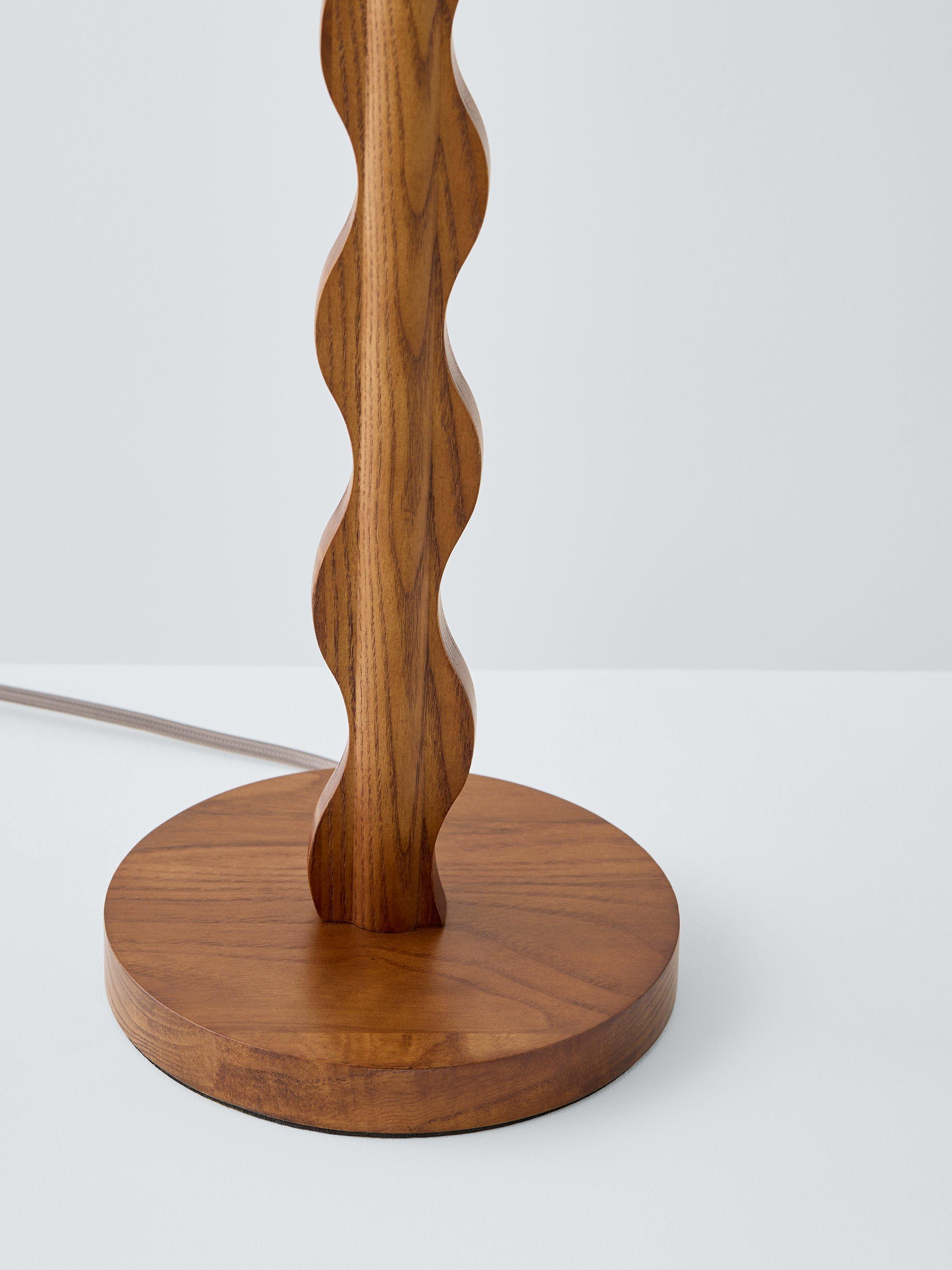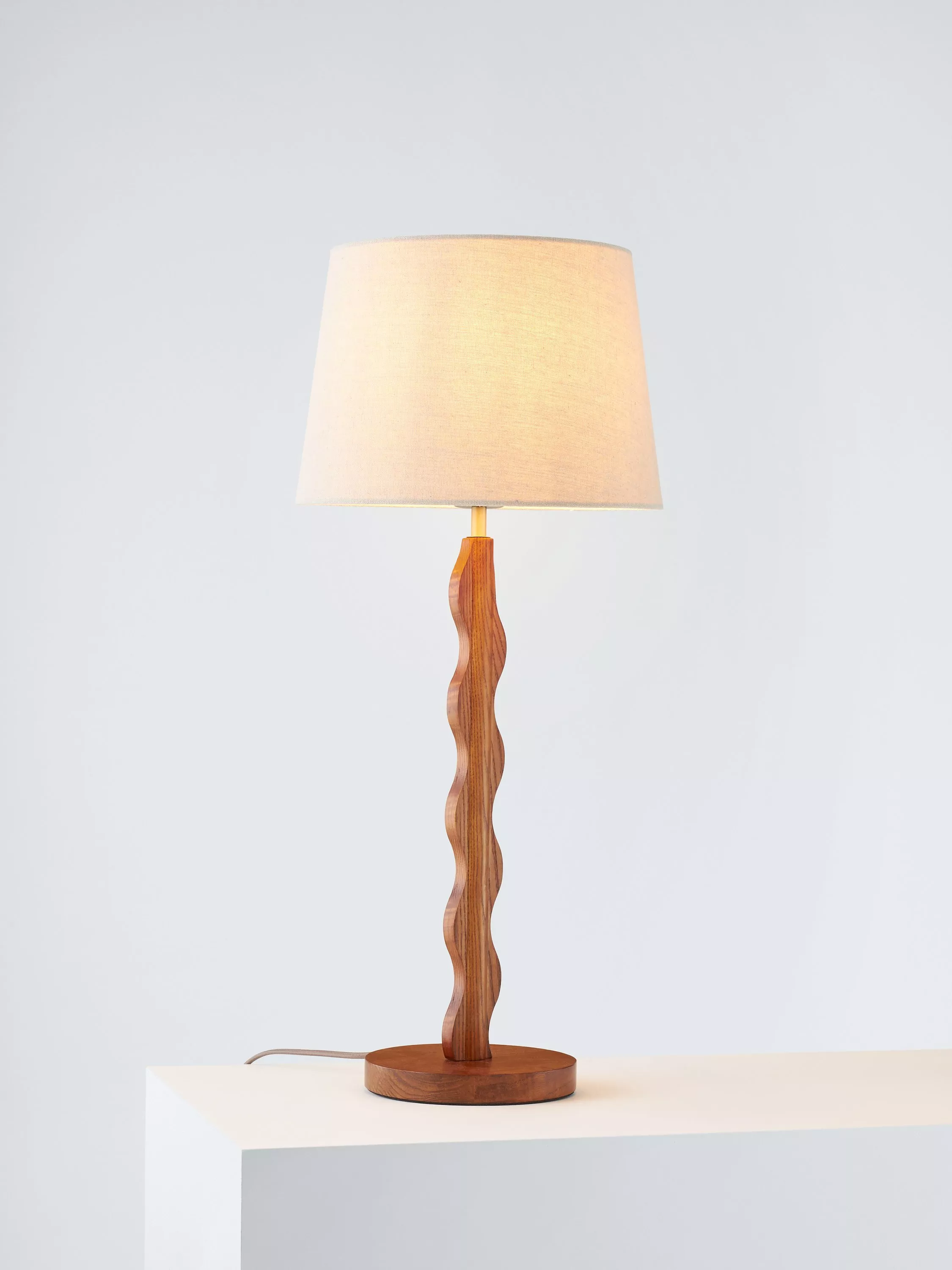 The Wiggle table lamp is designed with a contemporary wiggly silhouette. The staining on the wooden stem and cylindrical plinth enhances the natural grain of the ash wood. A soft tapered linen lampshade adds a warm wash of light to suit a variety of living spaces.