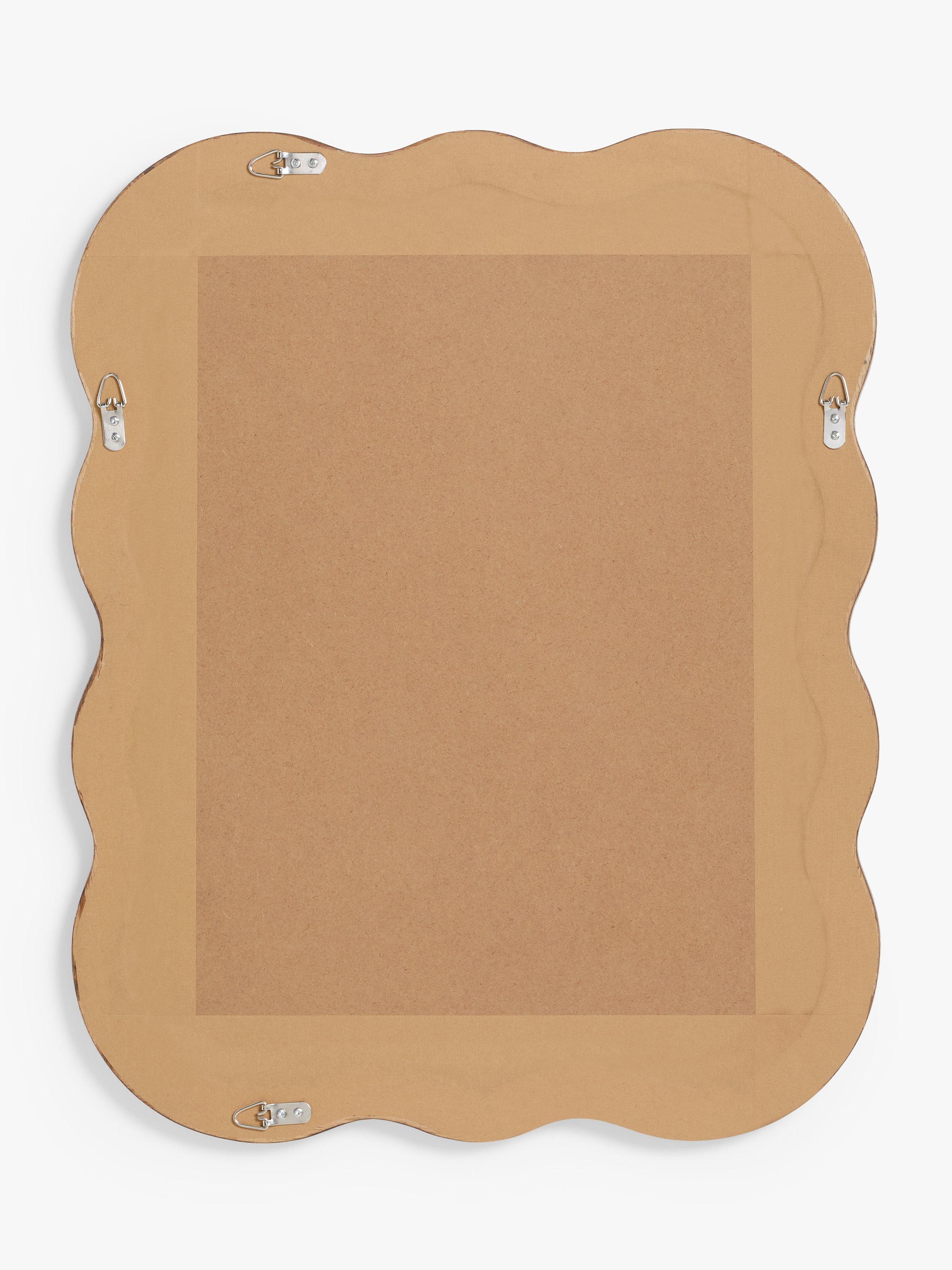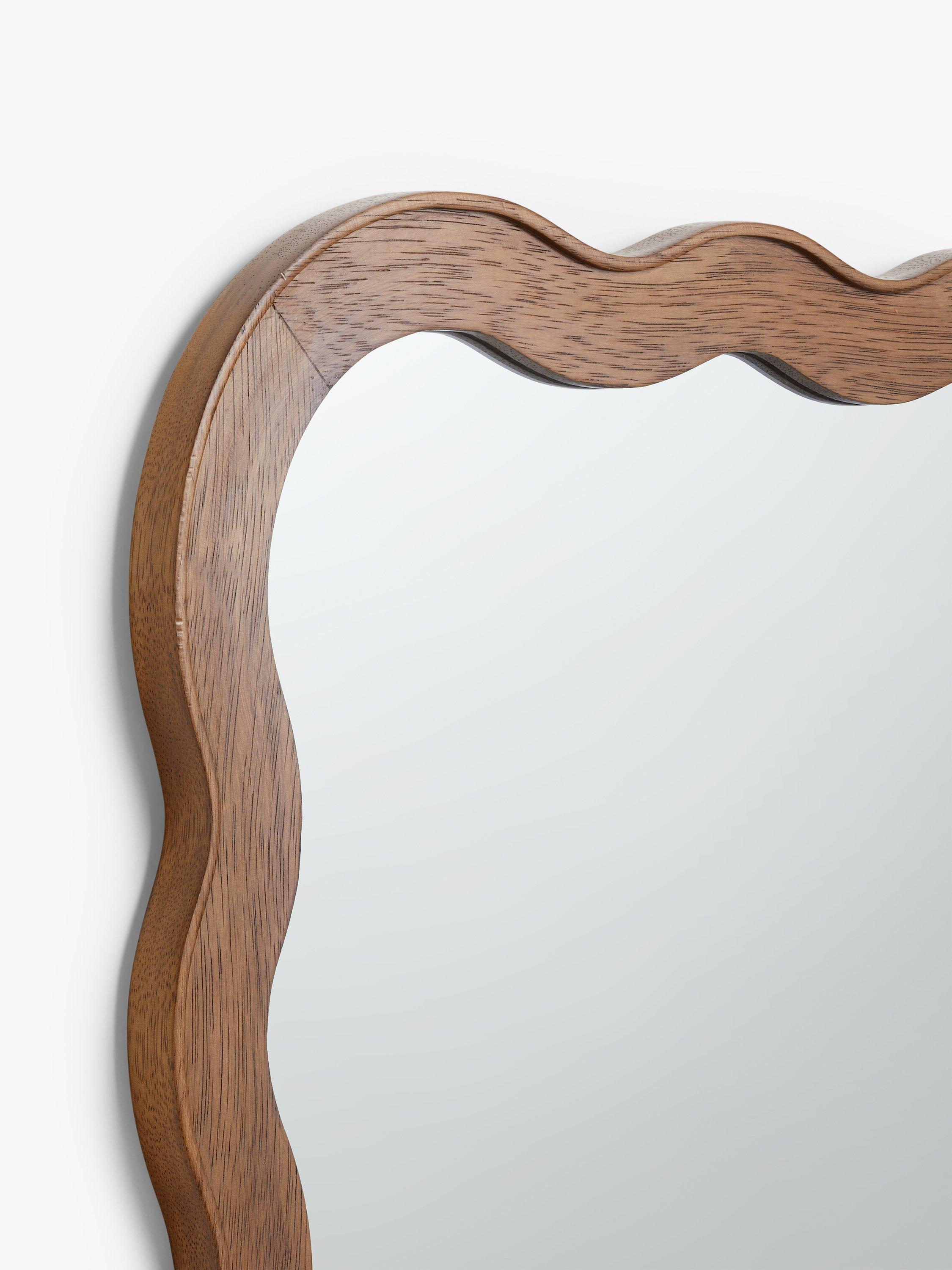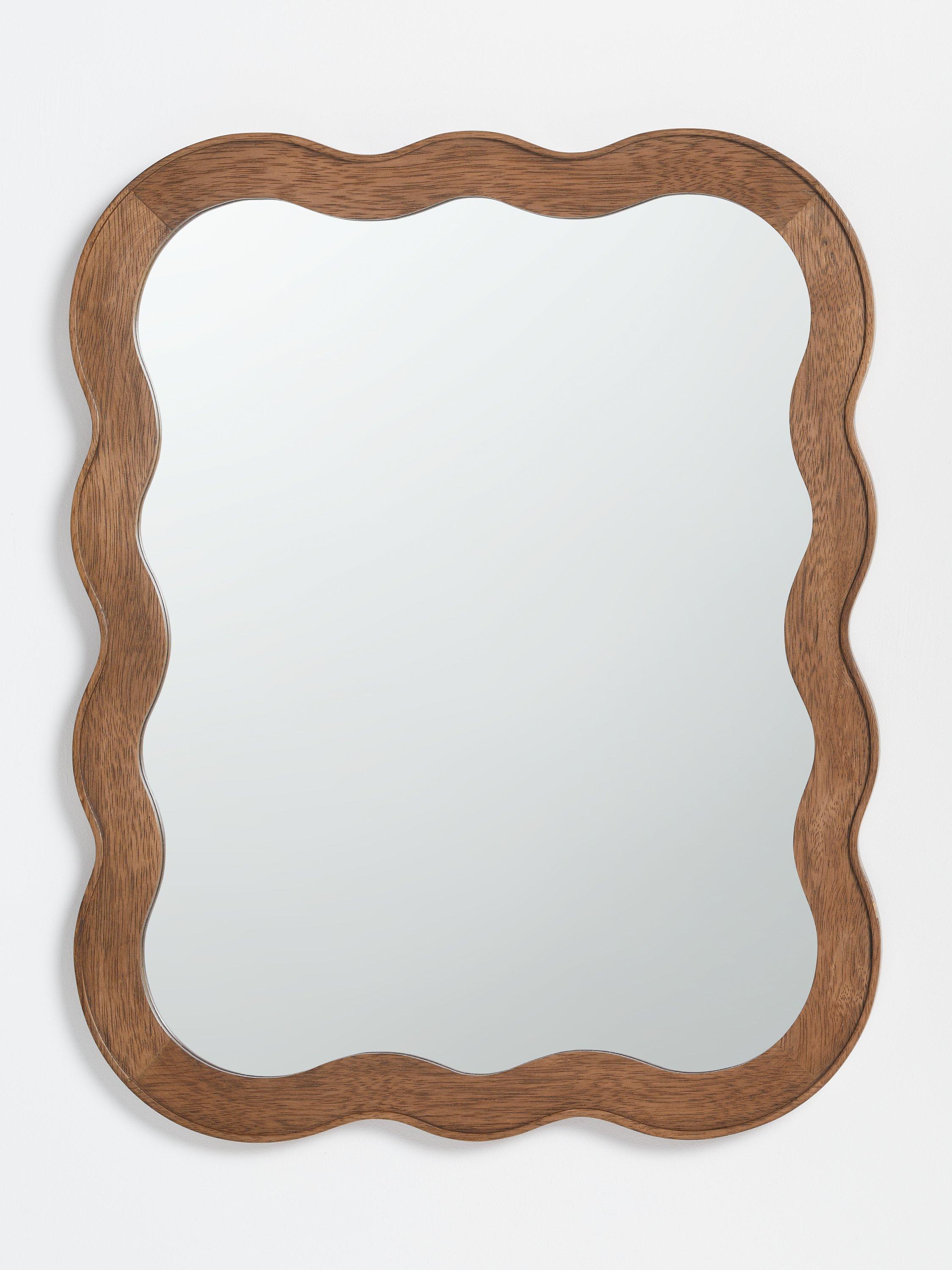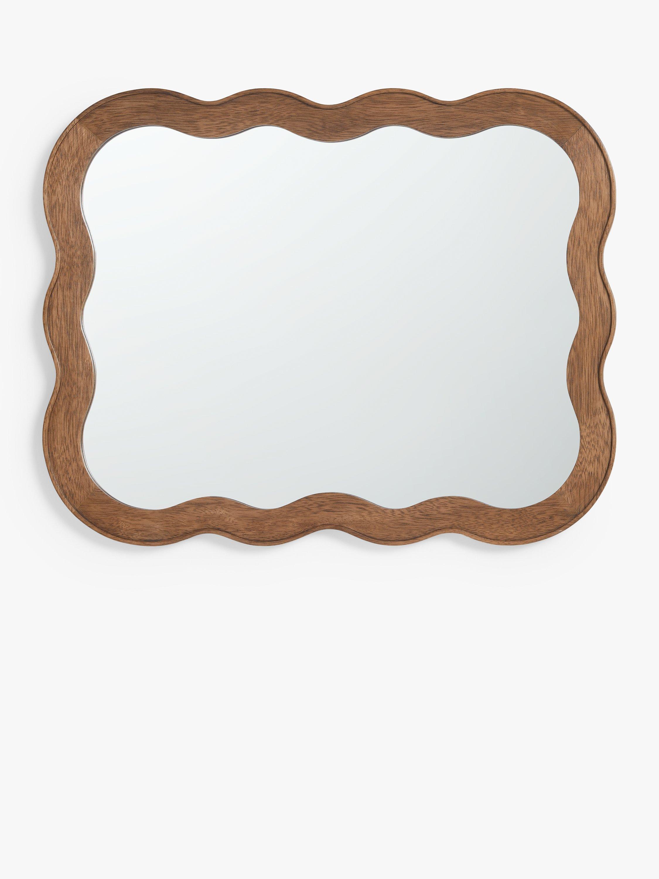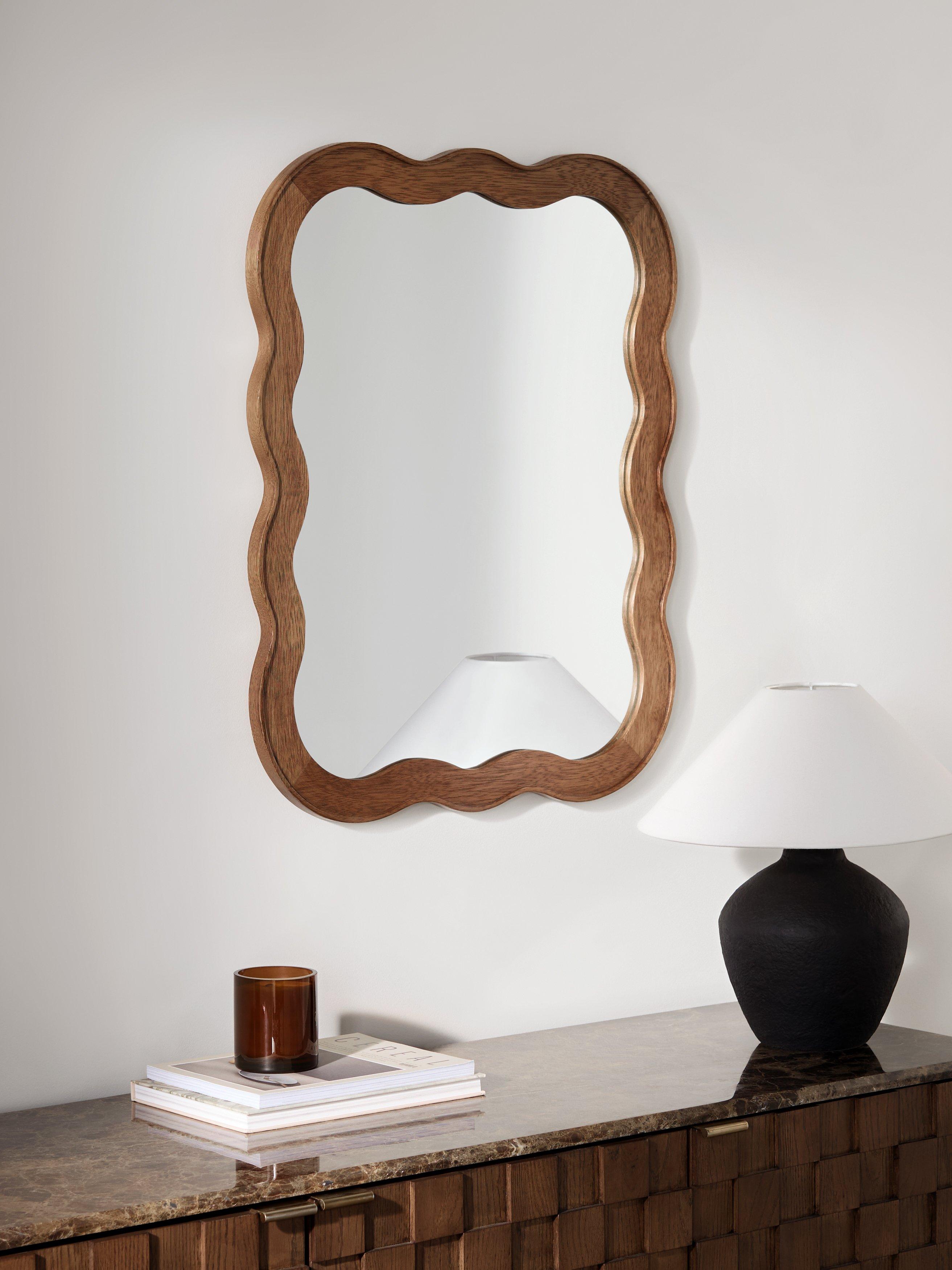 Solid pine wood wall mirror with a dark walnut-stained finish. A contemporary shape and updated take on Mid-century design. Ready to hang on your wall, horizontally or vertically, using the D-ring fittings on the back.