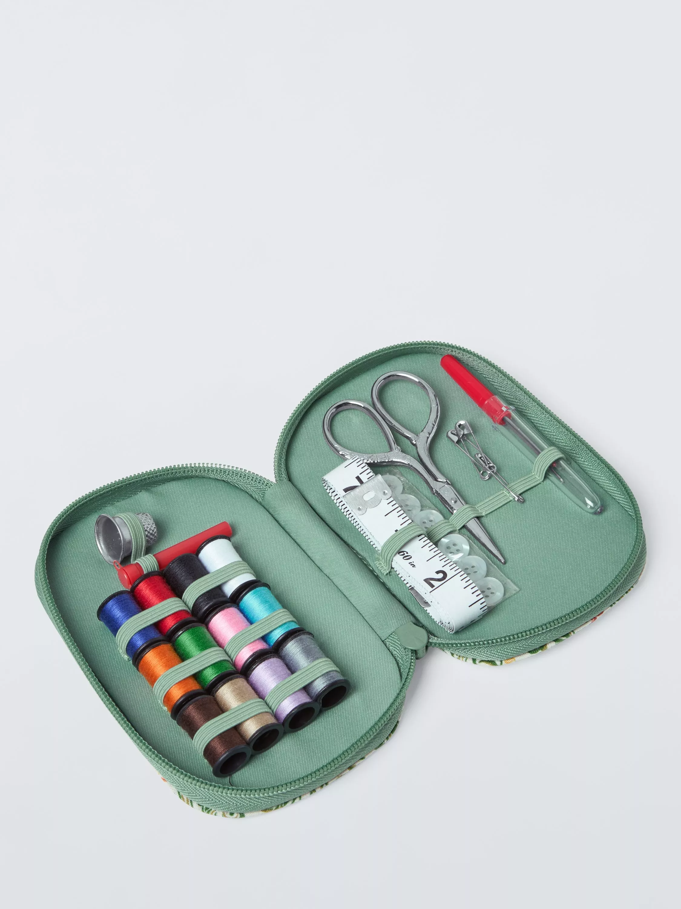 Crafted in soft printed cotton, this zipped kit contains 12 thread reels, embroidery scissors, tape measure, safety pins, seam ripper, buttons and needles. Just pop it in your bag to prepare for everyday emergencies.