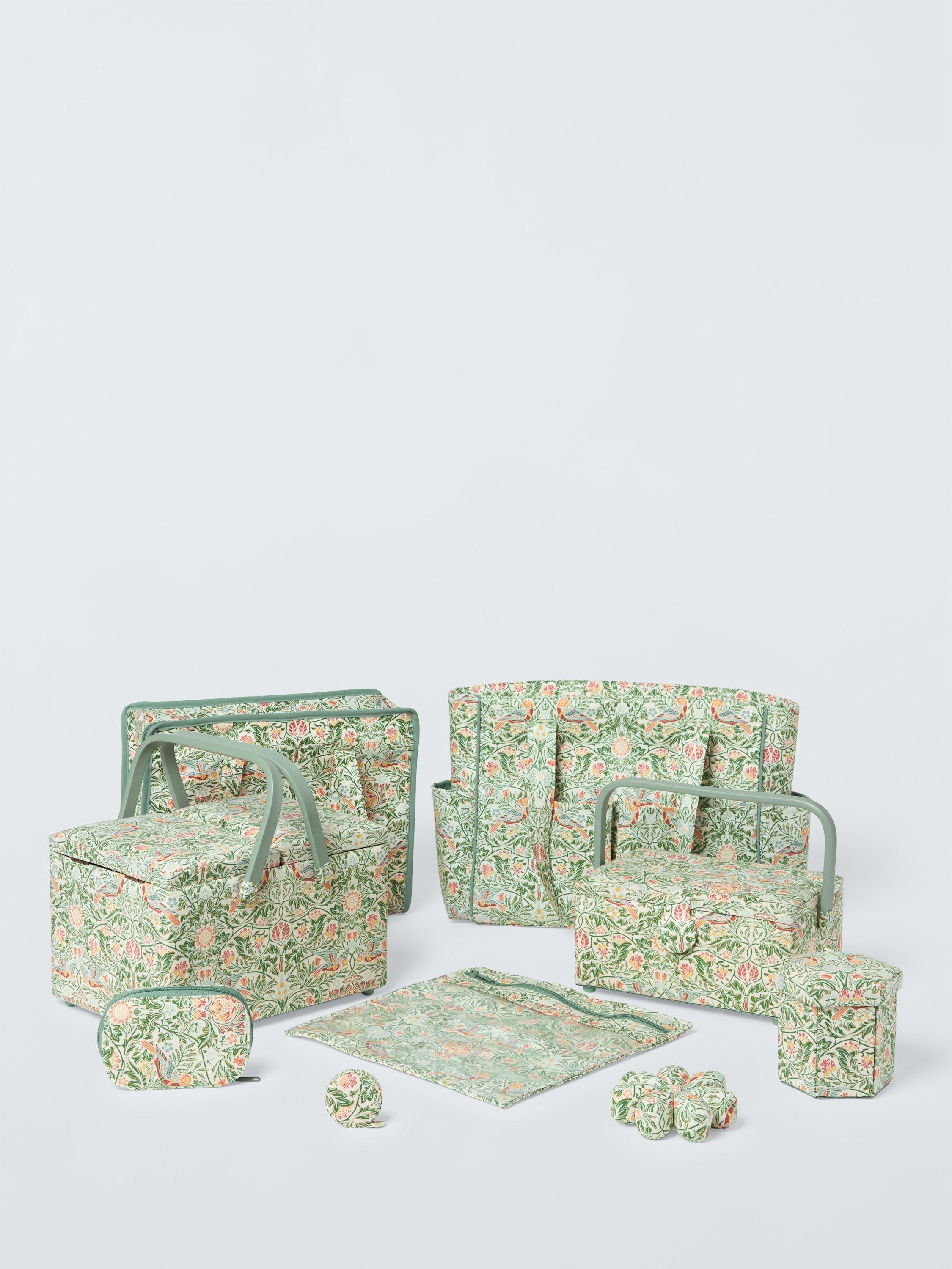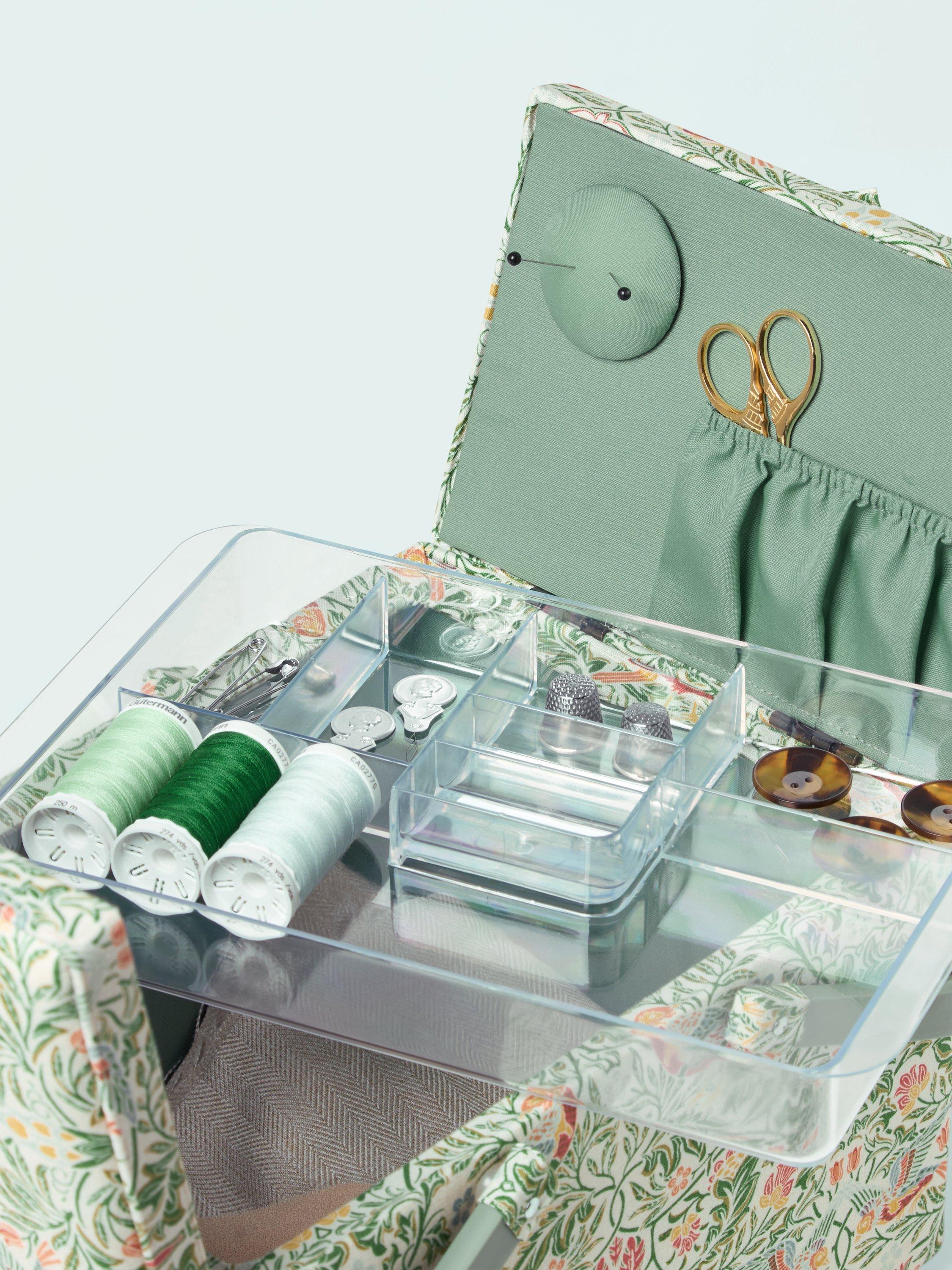 Covered in soft printed cotton, this twin lid sewing basket has a double grab handle that allows for ease of transport enabling you to sew on the go. It also has a removable plastic tray with plenty of compartment space for needles, thimbles and threads allowing you to organise your sewing kit in preparation for your next project. The removable tray lifts to reveal a spacious compartment that can be used for storing fabrics and other essential equipment. This basket is an essential for serious sewers.