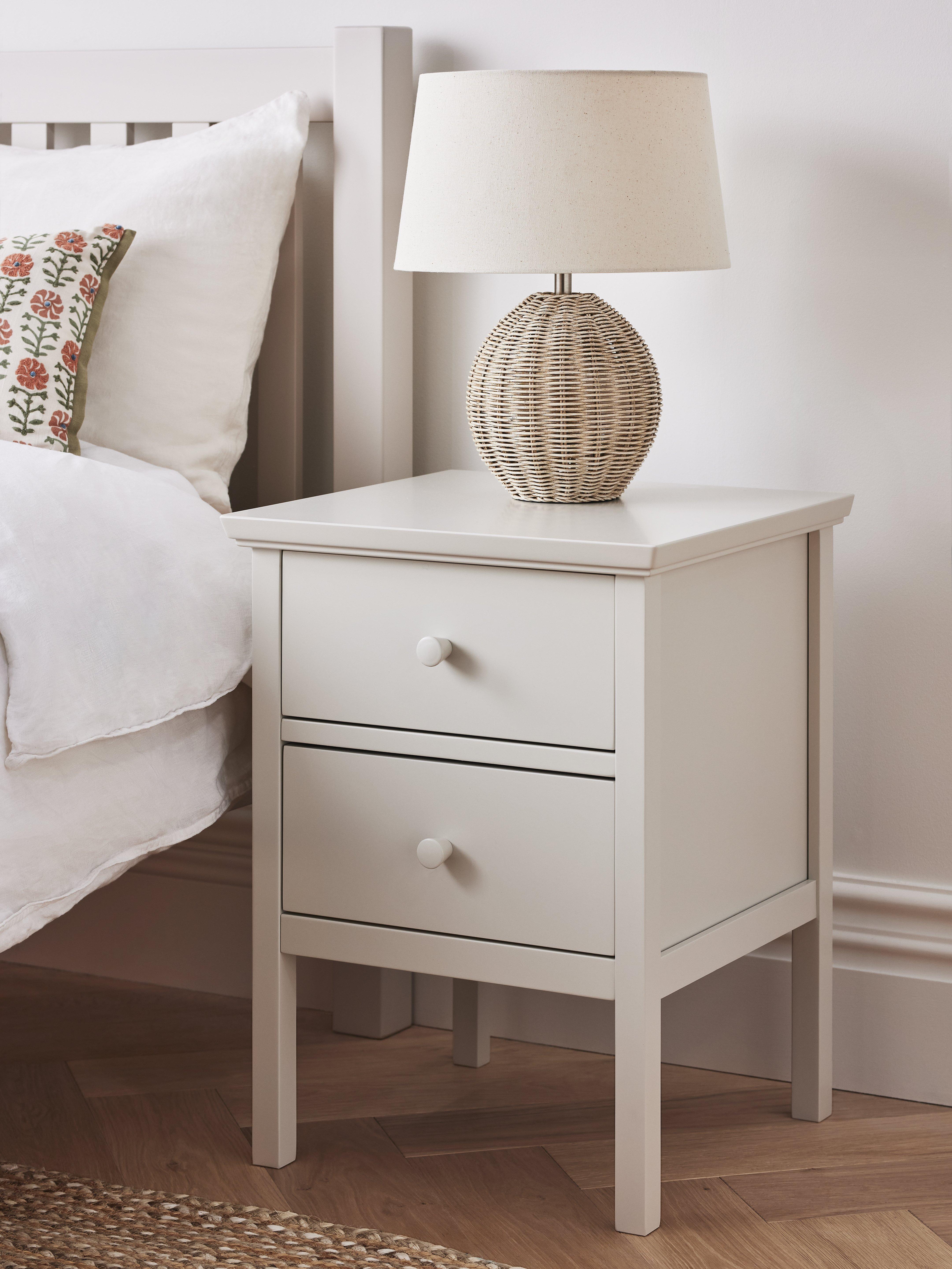 This petite bedside table is a brilliant option for smaller bedrooms. We've made it from robust pine wood and veneers and kept the design simple, but timeless. Two drawers provide convenient storage space and it's available in a painted finish for a more modern look or a natural finish that highlights the authentic wood grains.