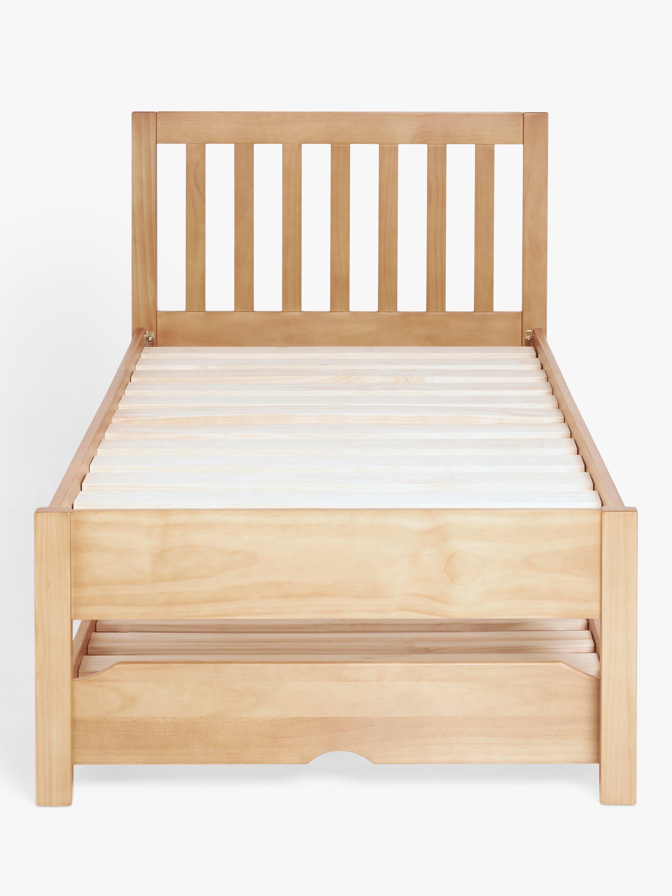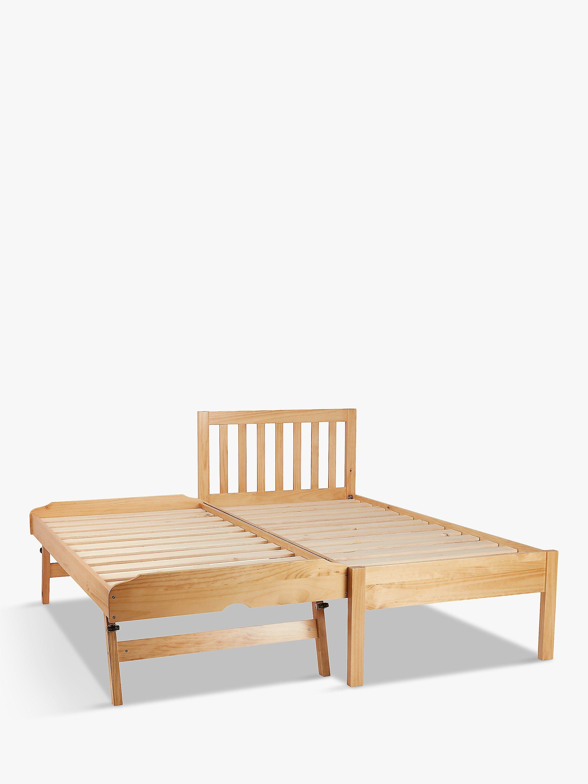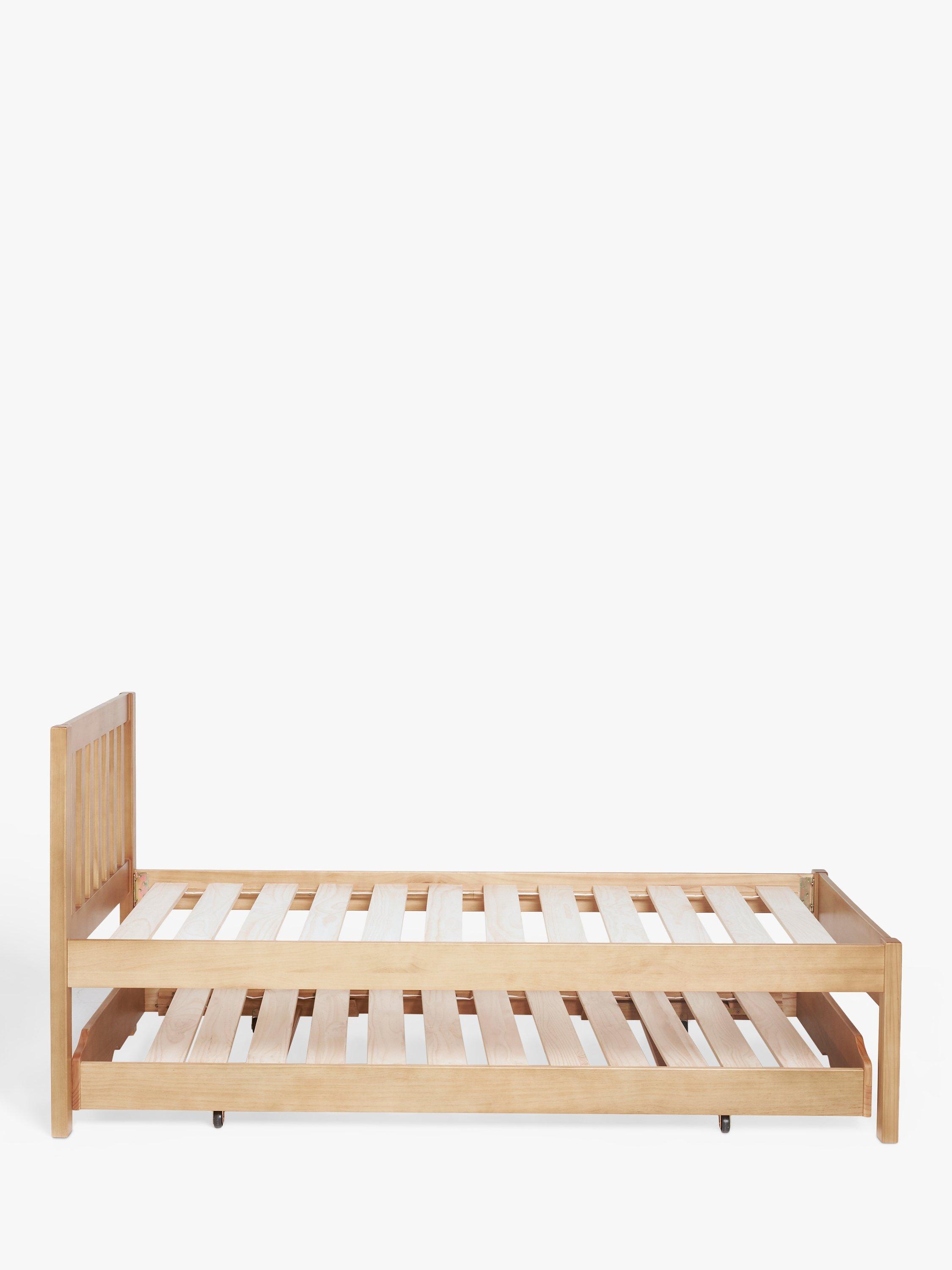 We've designed this useful bed frame with a trundle base that can be expanded to the height of the main frame. Ideal for hosting guests, it's easy to assemble and made from hard-wearing pine wood, with solid slats in the base of both frames providing a firm foundation for your mattresses. The trundle frame is easy to pull-out and it stores neatly underneath the main frame when not in use. Available in a Natural finish which highlights the real knots and grains in the wood, or in a painted finish for a cleaner, more modern look.