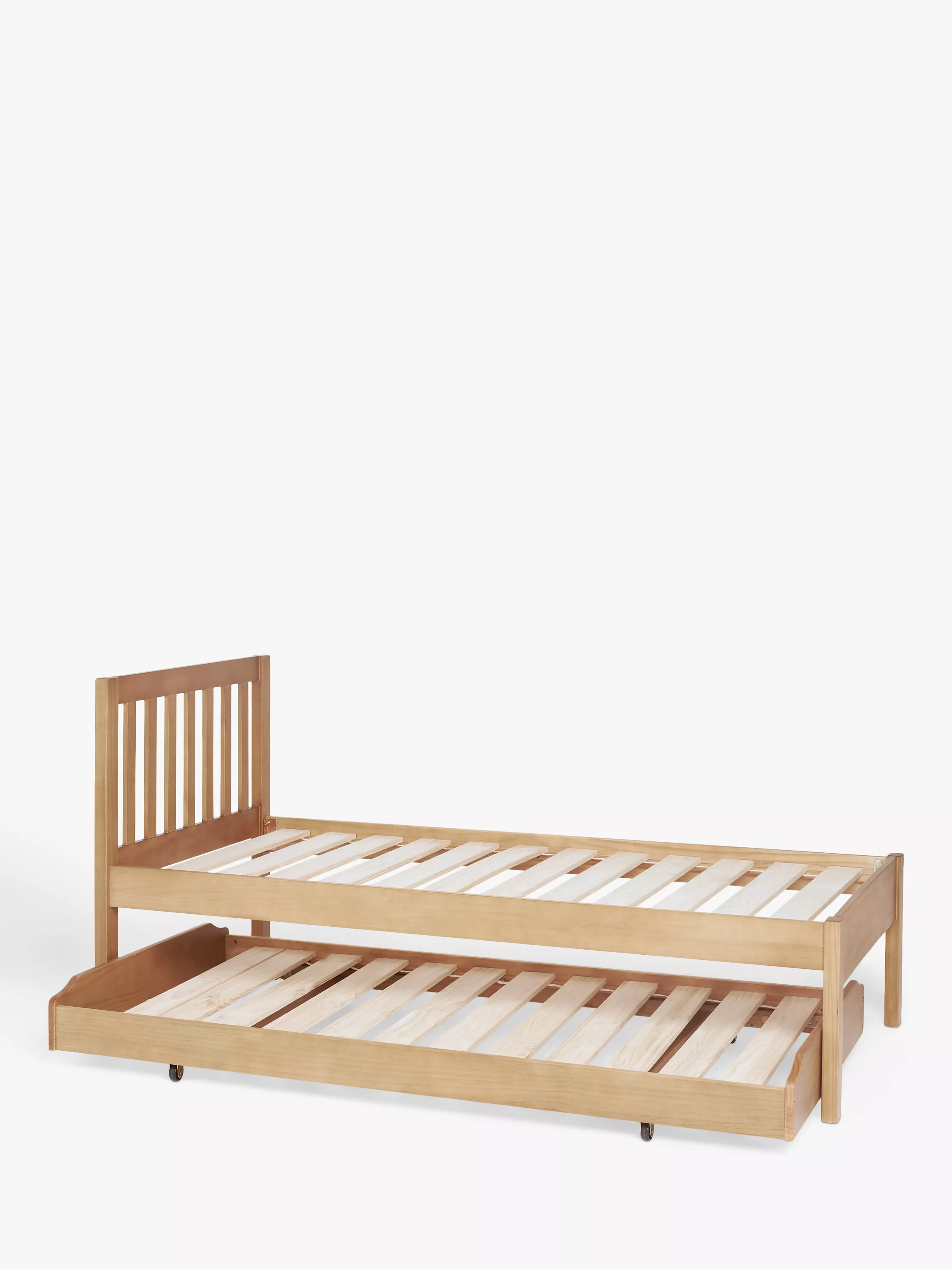 We've designed this useful bed frame with a trundle base that can be expanded to the height of the main frame. Ideal for hosting guests, it's easy to assemble and made from hard-wearing pine wood, with solid slats in the base of both frames providing a firm foundation for your mattresses. The trundle frame is easy to pull-out and it stores neatly underneath the main frame when not in use. Available in a Natural finish which highlights the real knots and grains in the wood, or in a painted finish for a cleaner, more modern look.