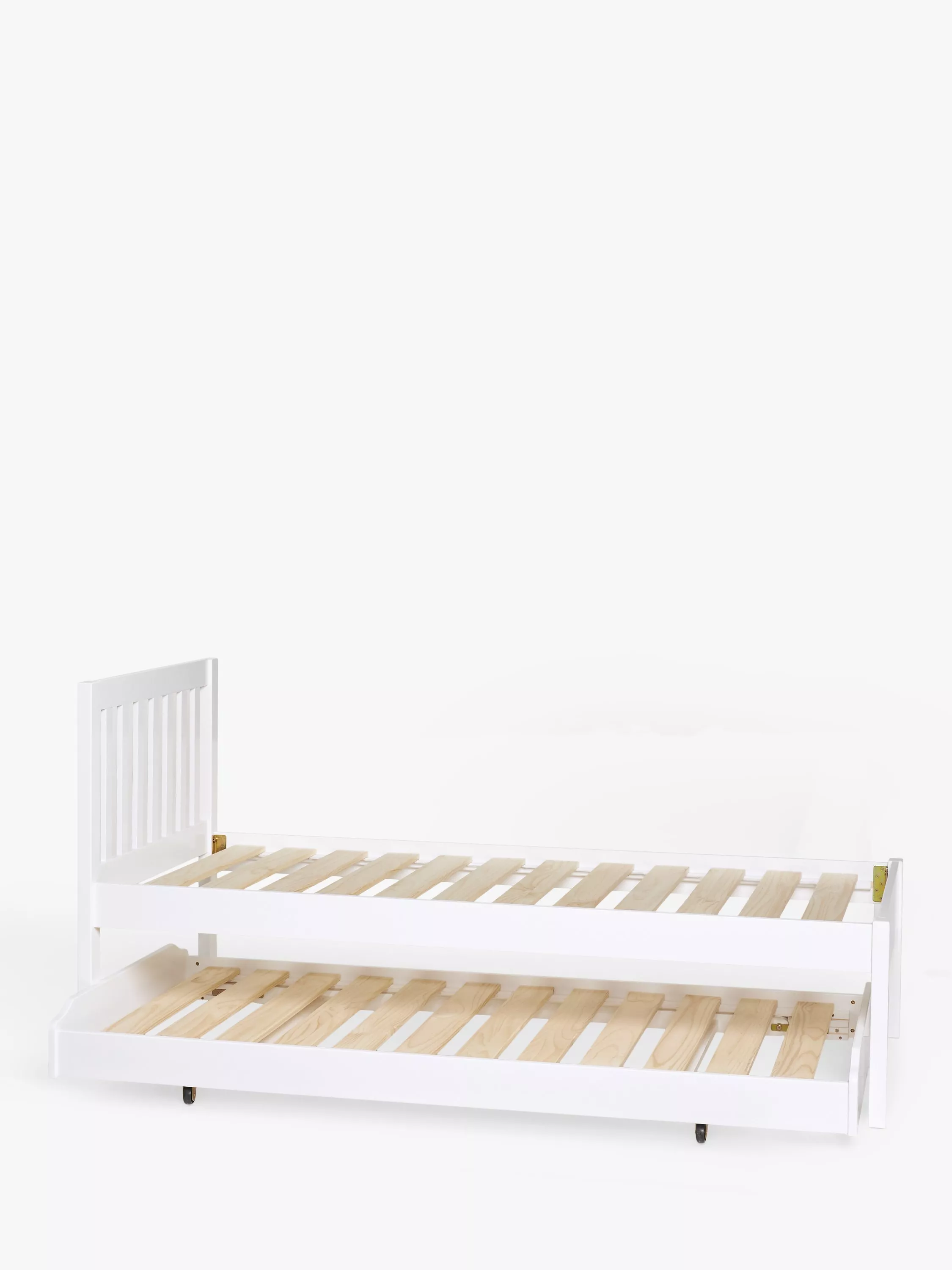 We've designed this useful bed frame with a trundle base that can be expanded to the height of the main frame. Ideal for hosting guests, it's easy to assemble and made from hard-wearing pine wood, with solid slats in the base of both frames providing a firm foundation for your mattresses. The trundle frame is easy to pull-out and it stores neatly underneath the main frame when not in use. Available in a Natural finish which highlights the real knots and grains in the wood, or in a painted finish for a cleaner, more modern look.