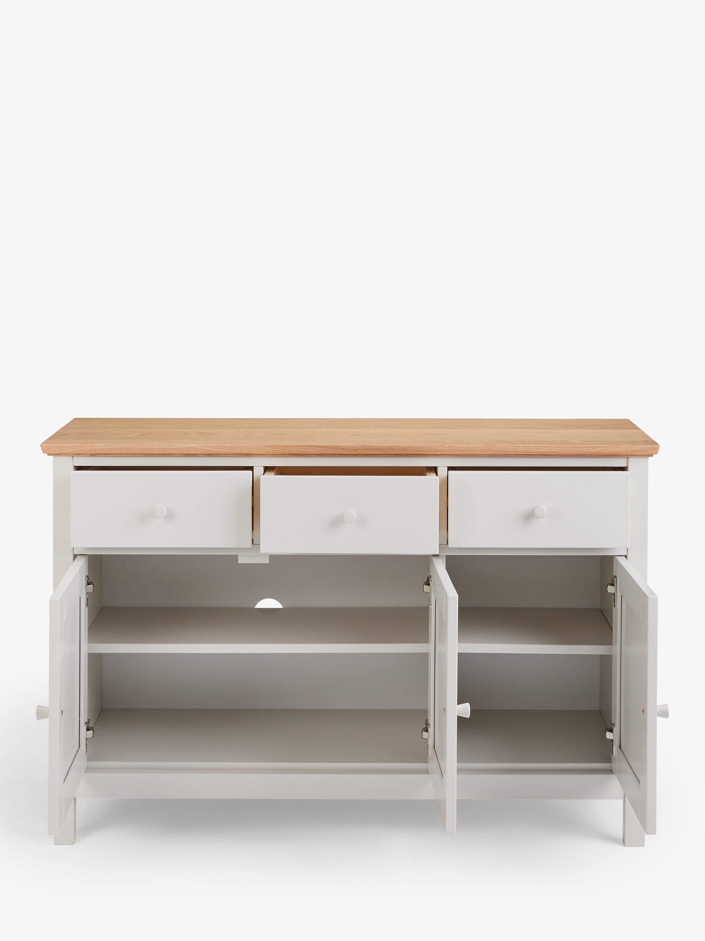 An elegant sideboard for storing and displaying all your dining essentials. It has three drawers and 3 doors opening onto a fixed shelf. Cable holes at the back also allow it to be used with a TV or other media.