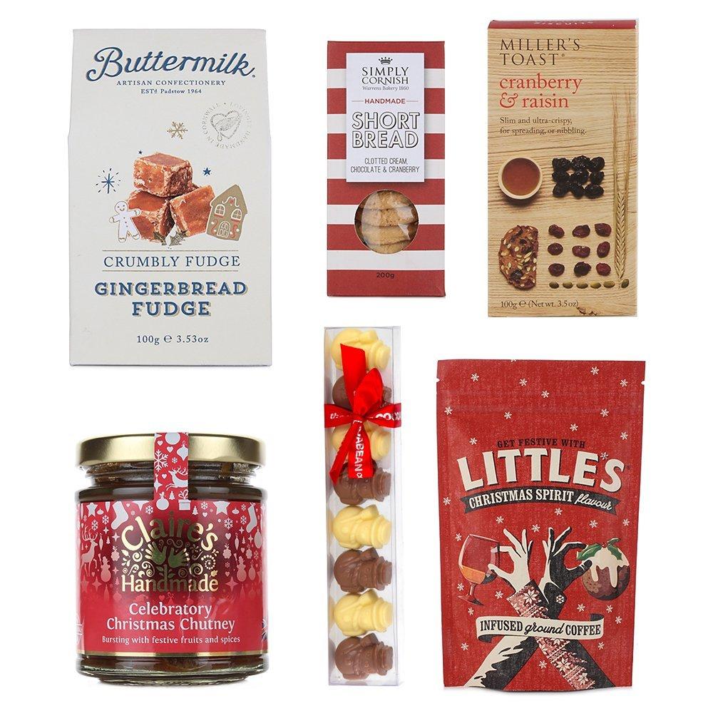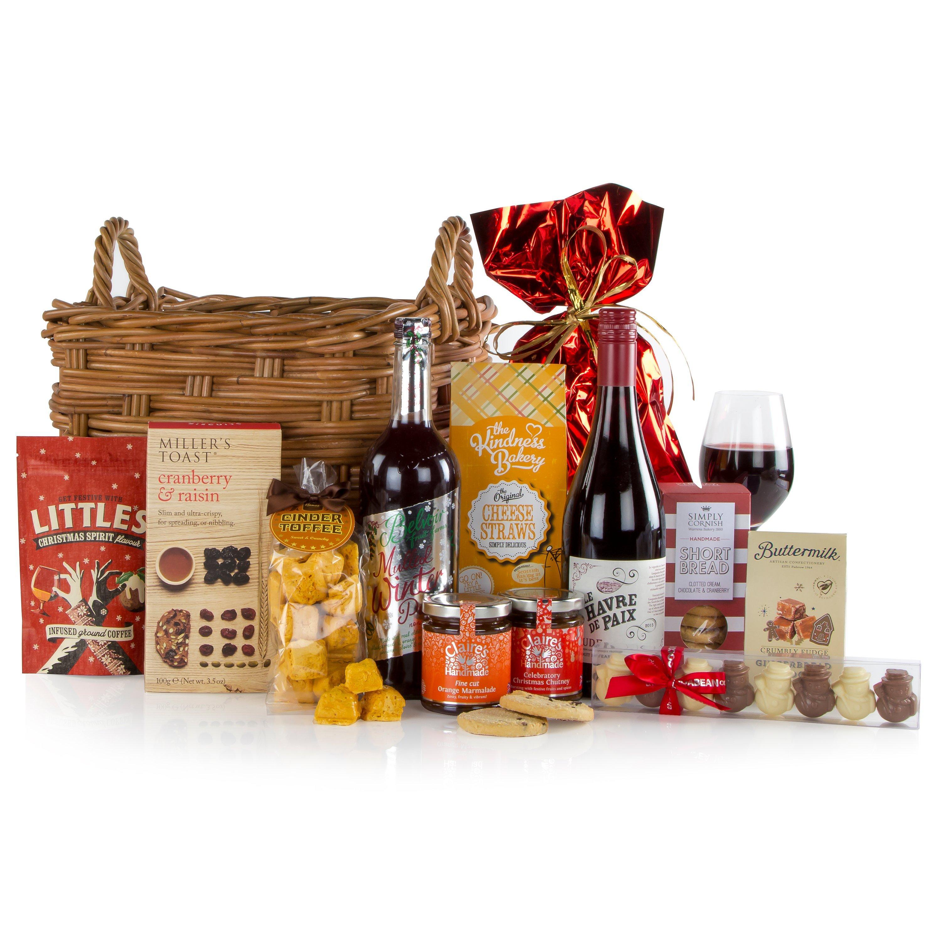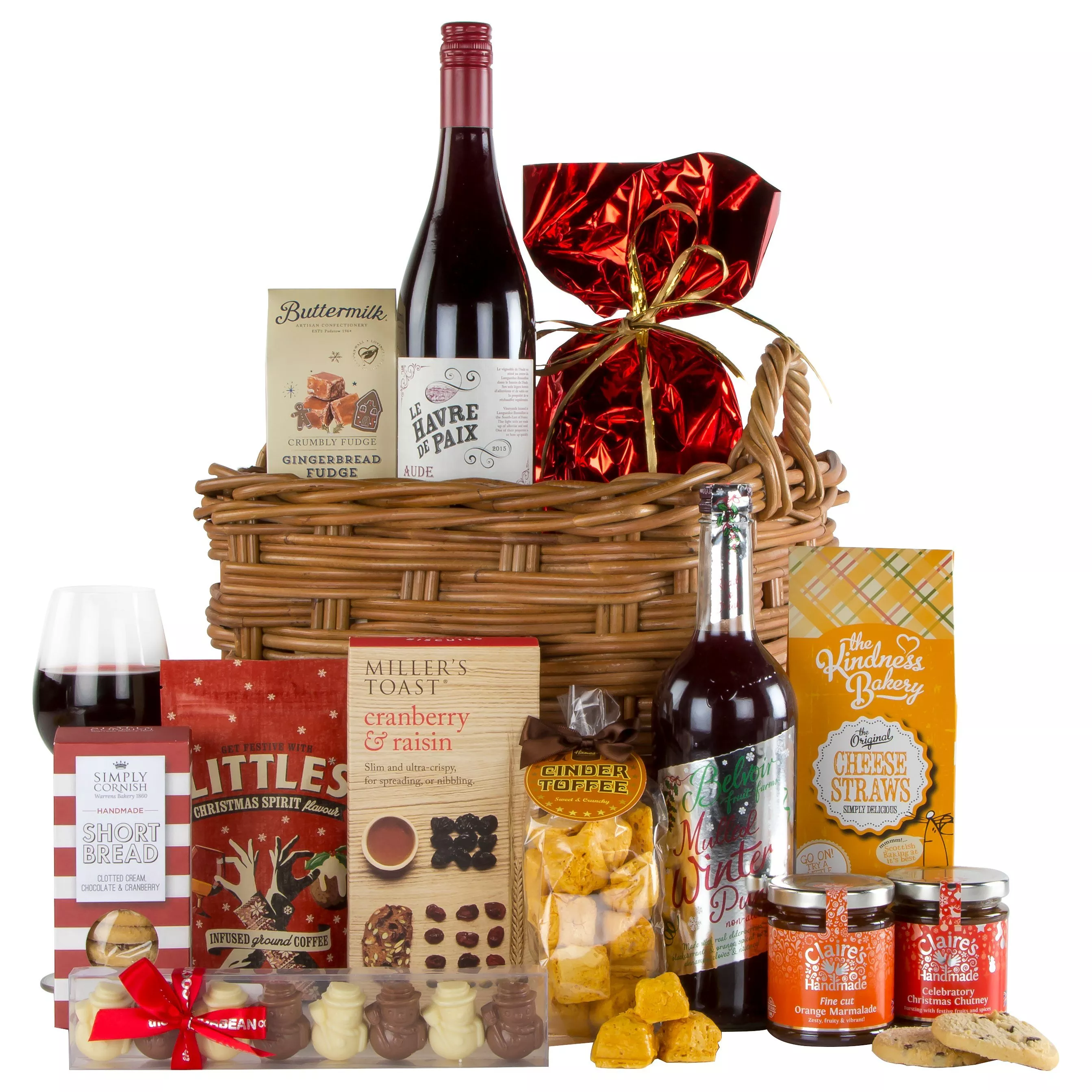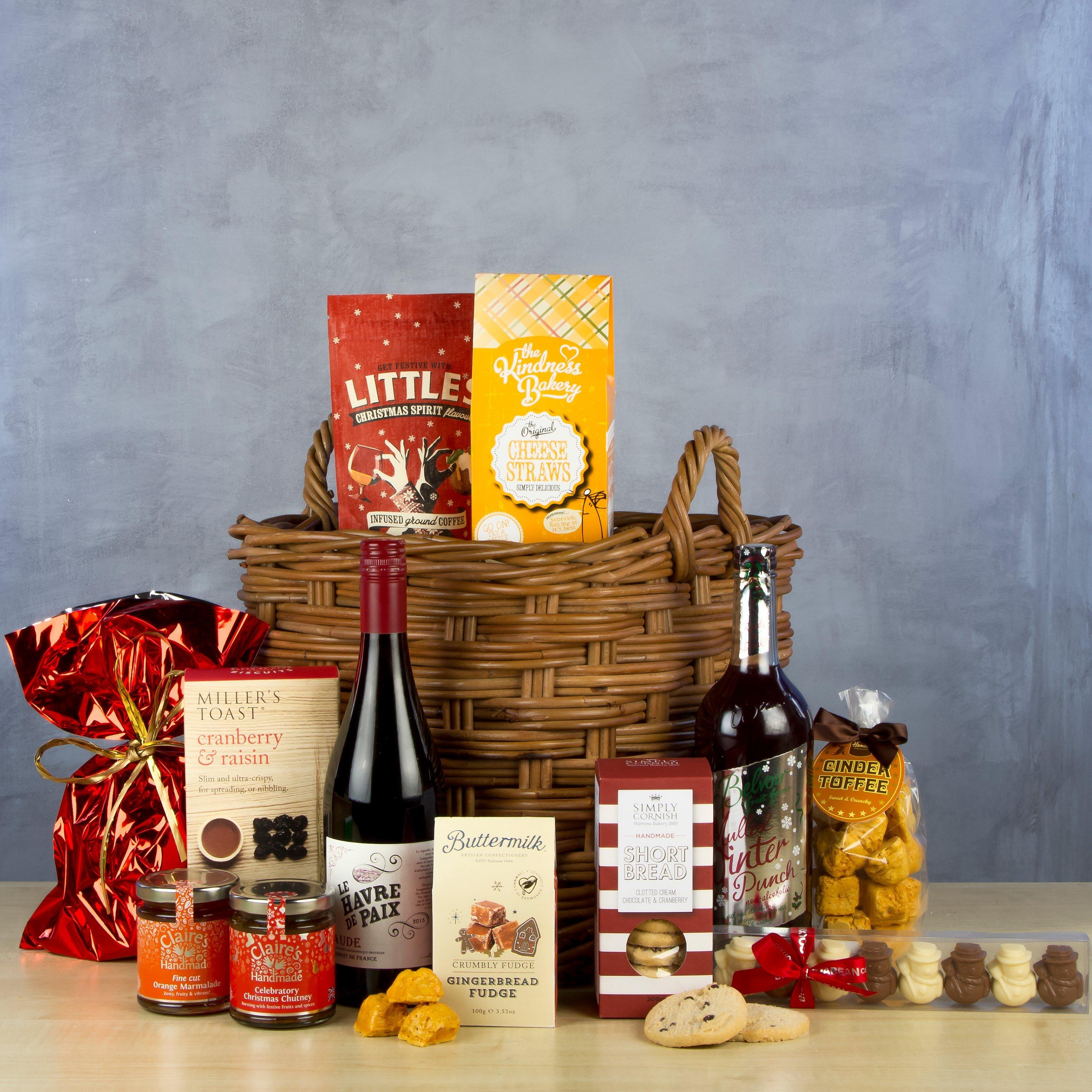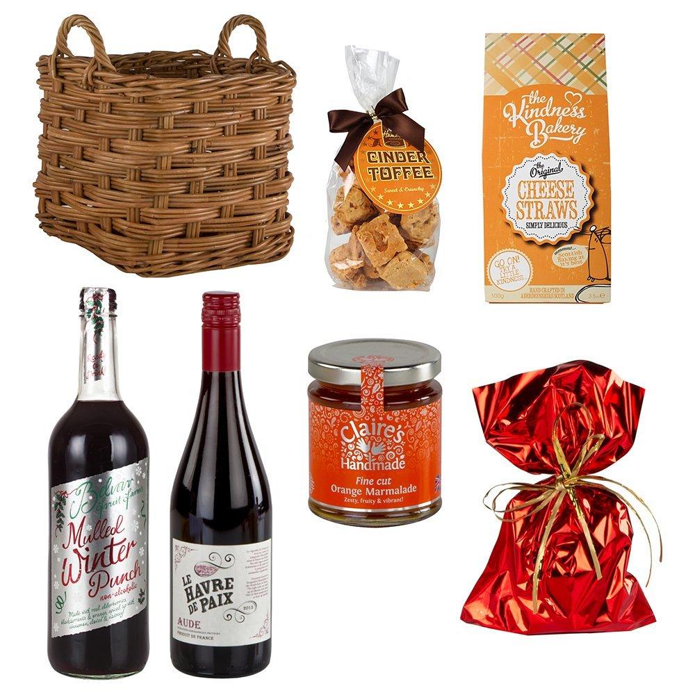 An assortment of sweet and savoury snacks to be enjoyed by the fireside. It includes a mulled winter punch, cheese straws, chutney and cinder toffee. Presented in a square triple weave rattan basket with handles.