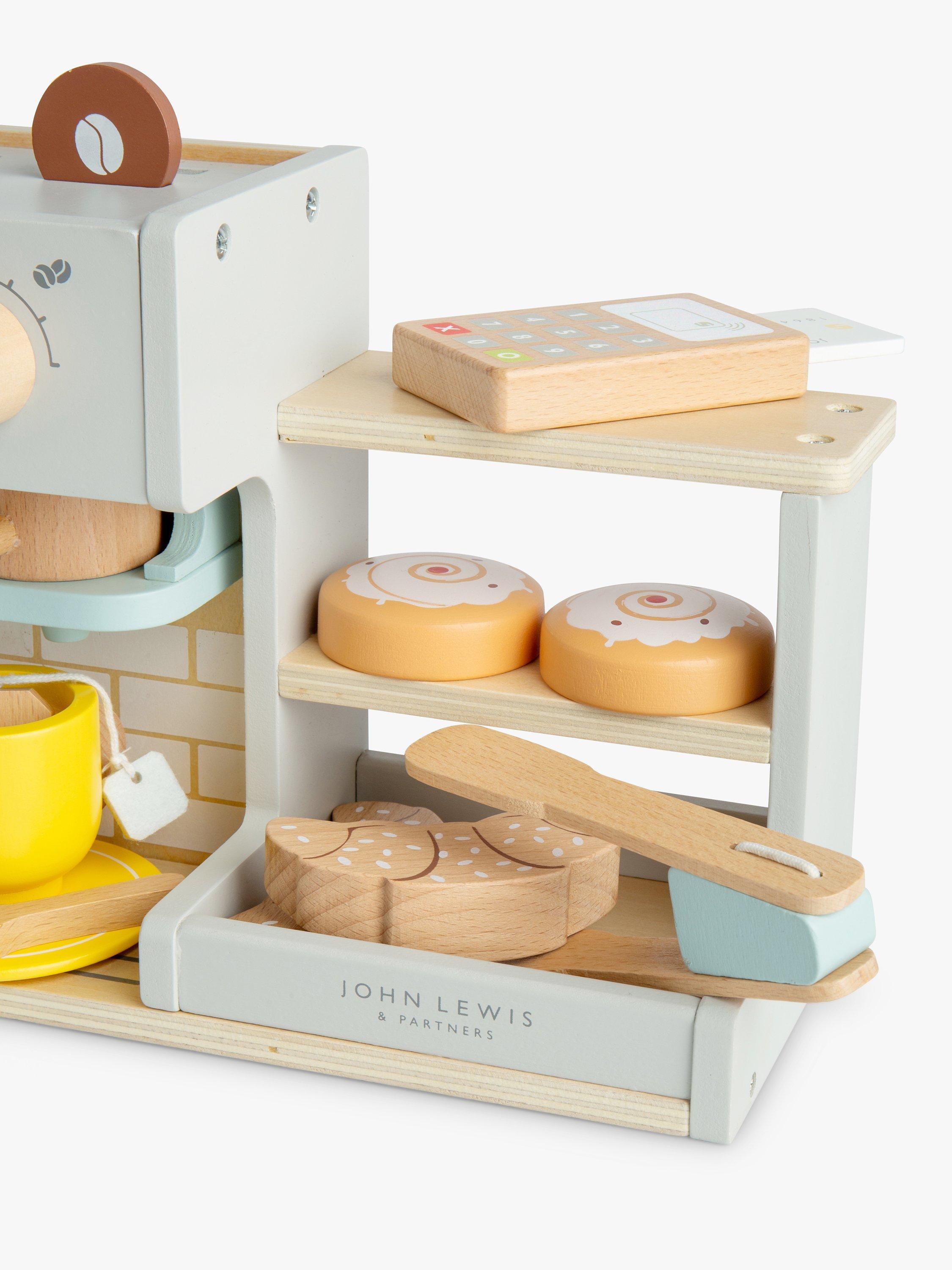 Will it be a flat white or a decaf cinnamon cappuccino? This wooden coffee shop includes mugs, pastries, a card machine, and a coffee machine. Let the lattes flow and don't forget to tip!