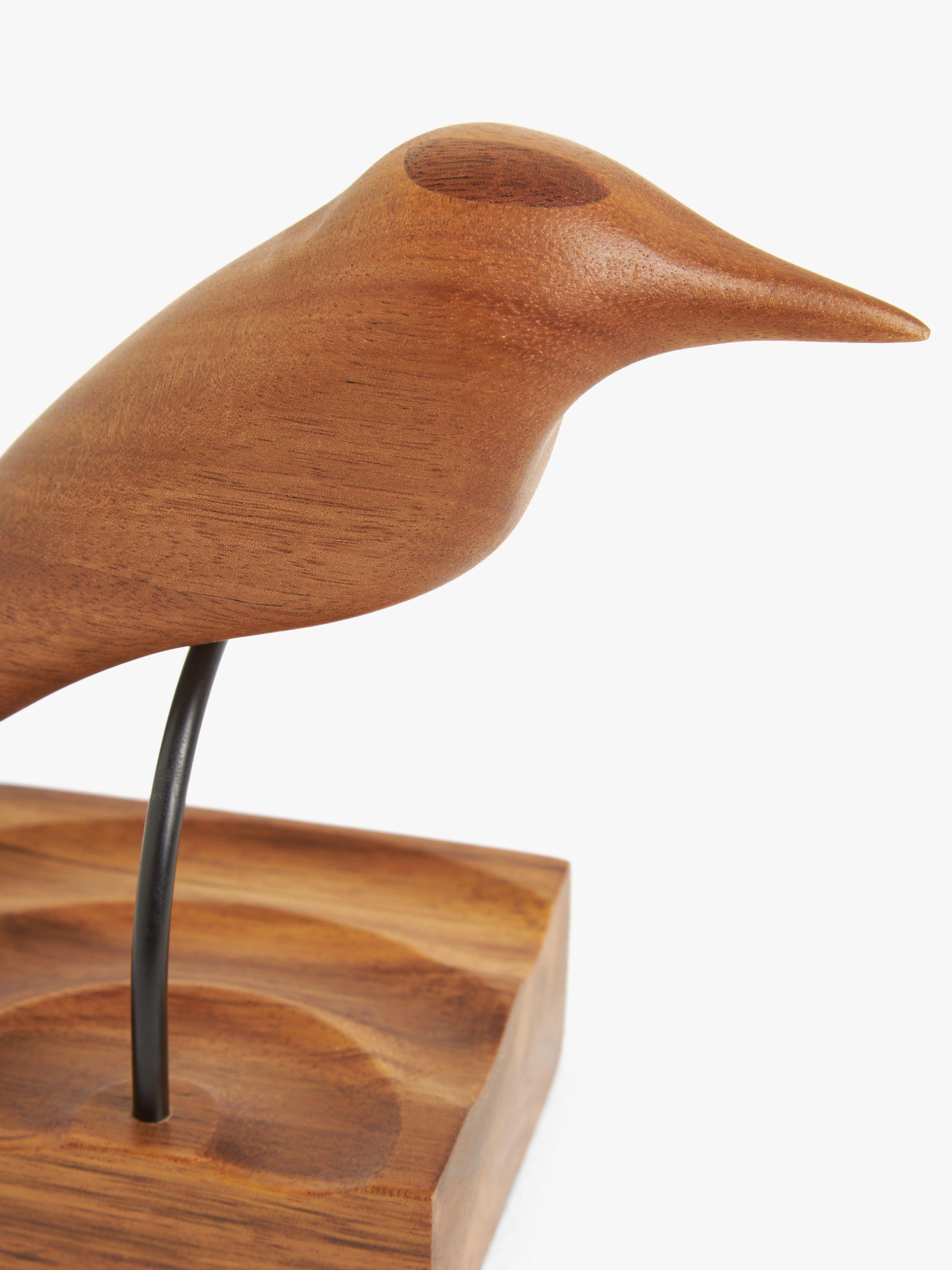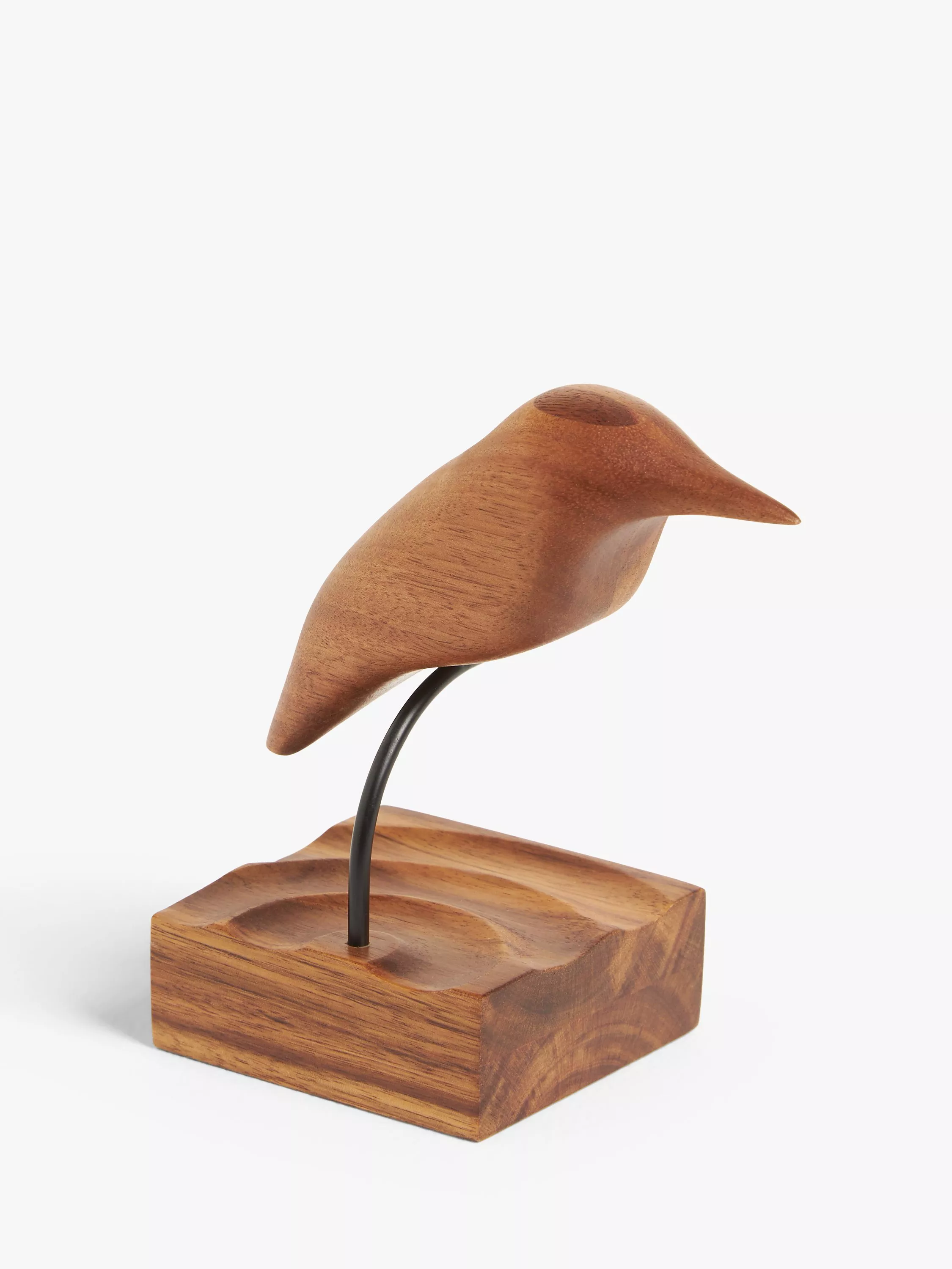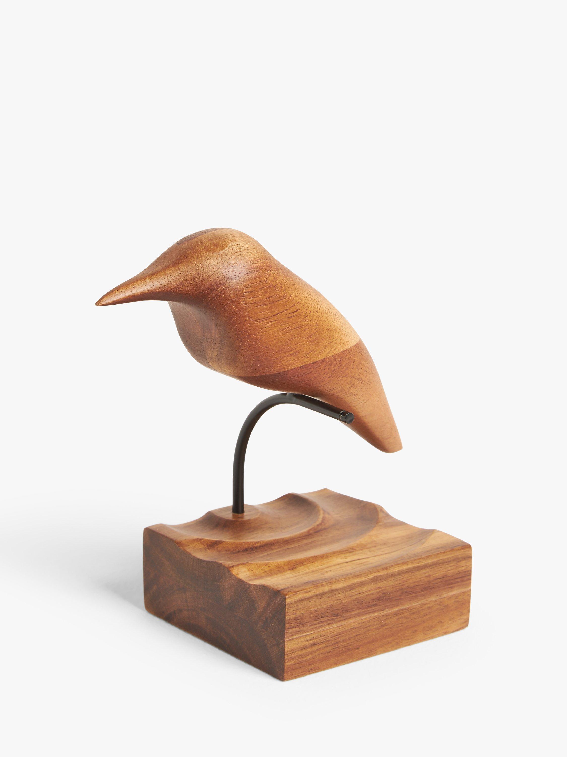 A beautifully sculpted wooden kingfisher on a sturdy base.