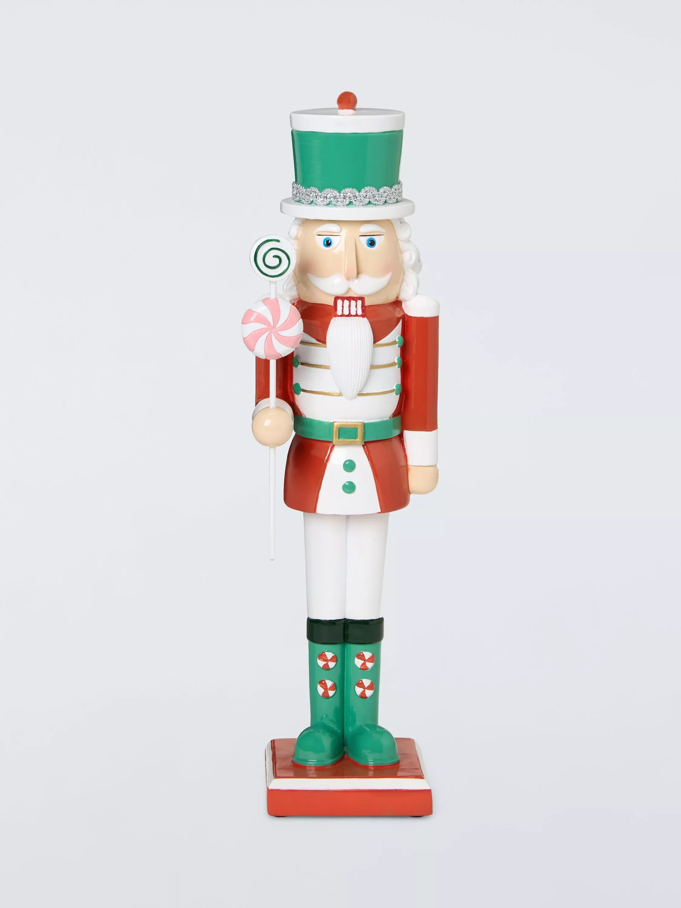 A traditional wooden Nutcracker figure, beautifully decorated in a red and green costume and with soft fibre elements.