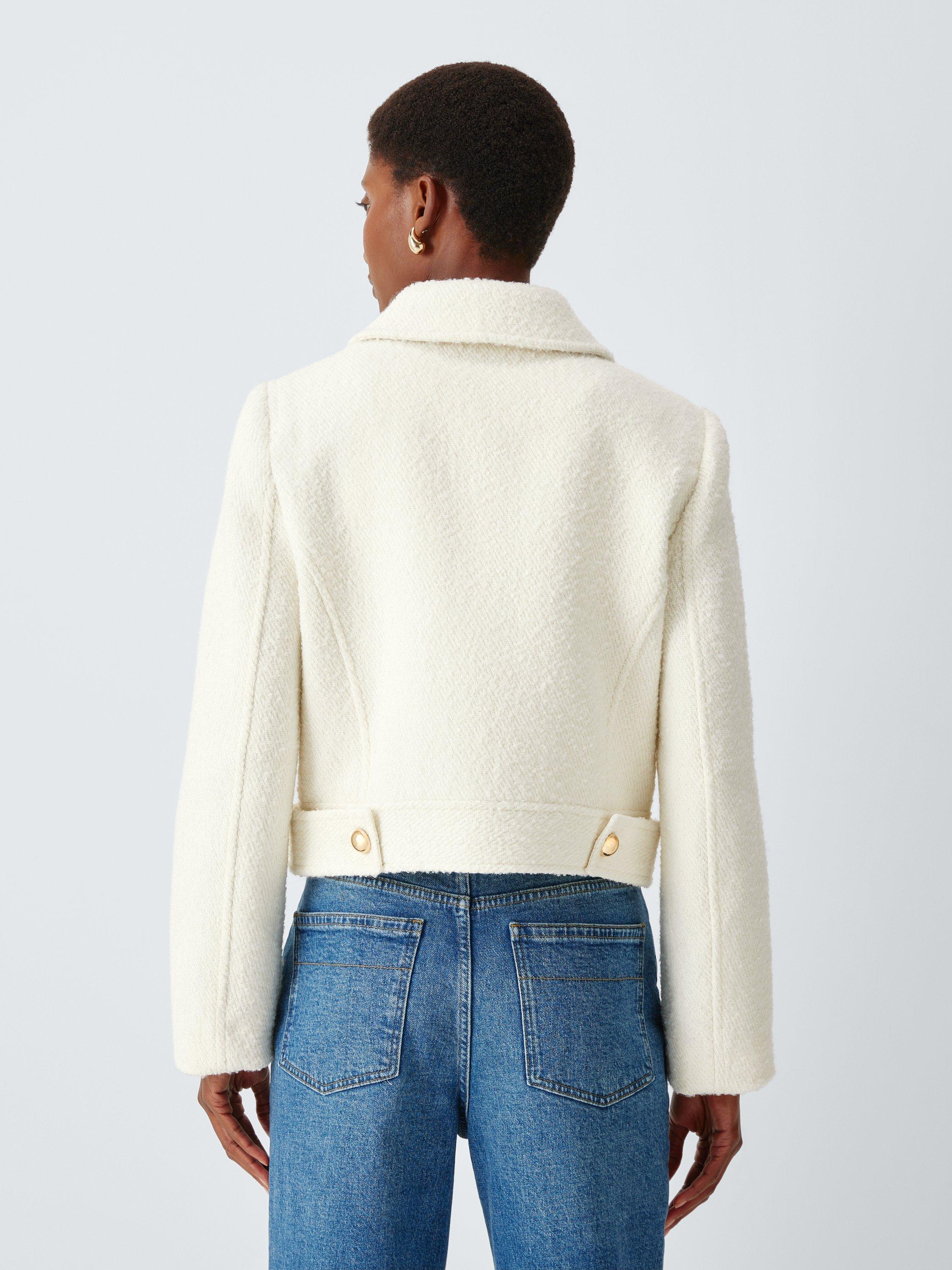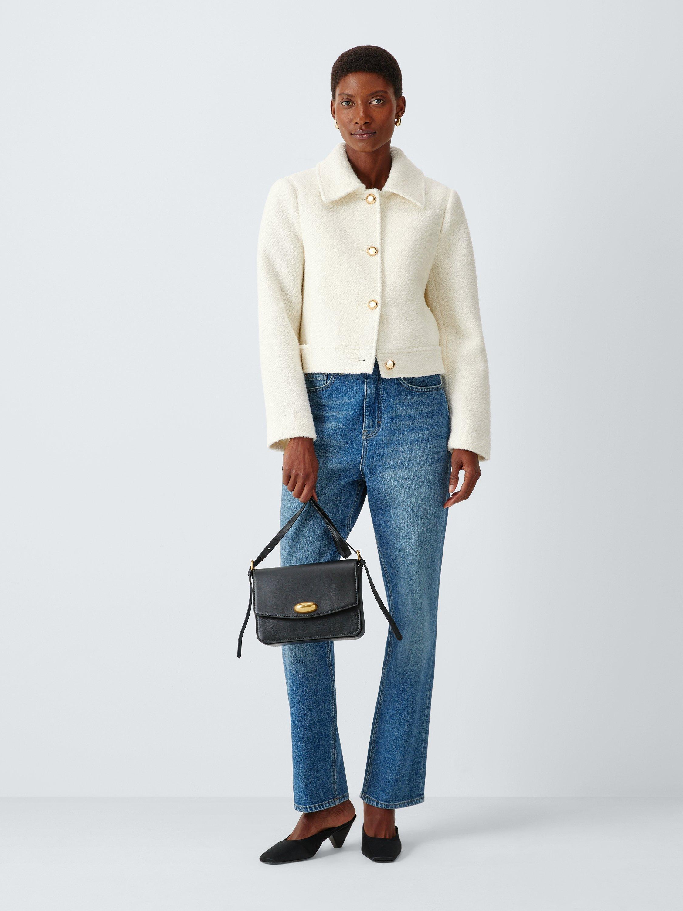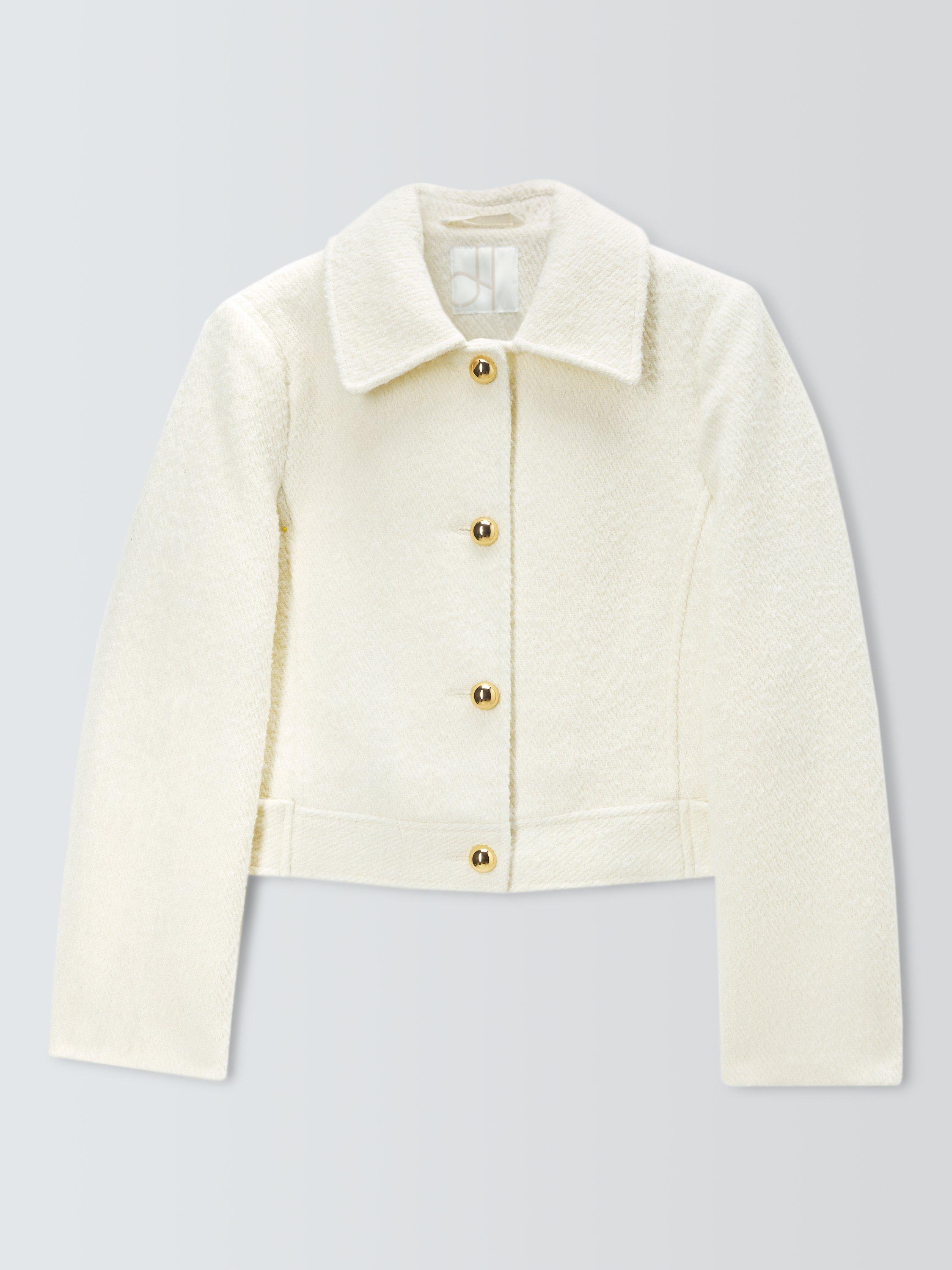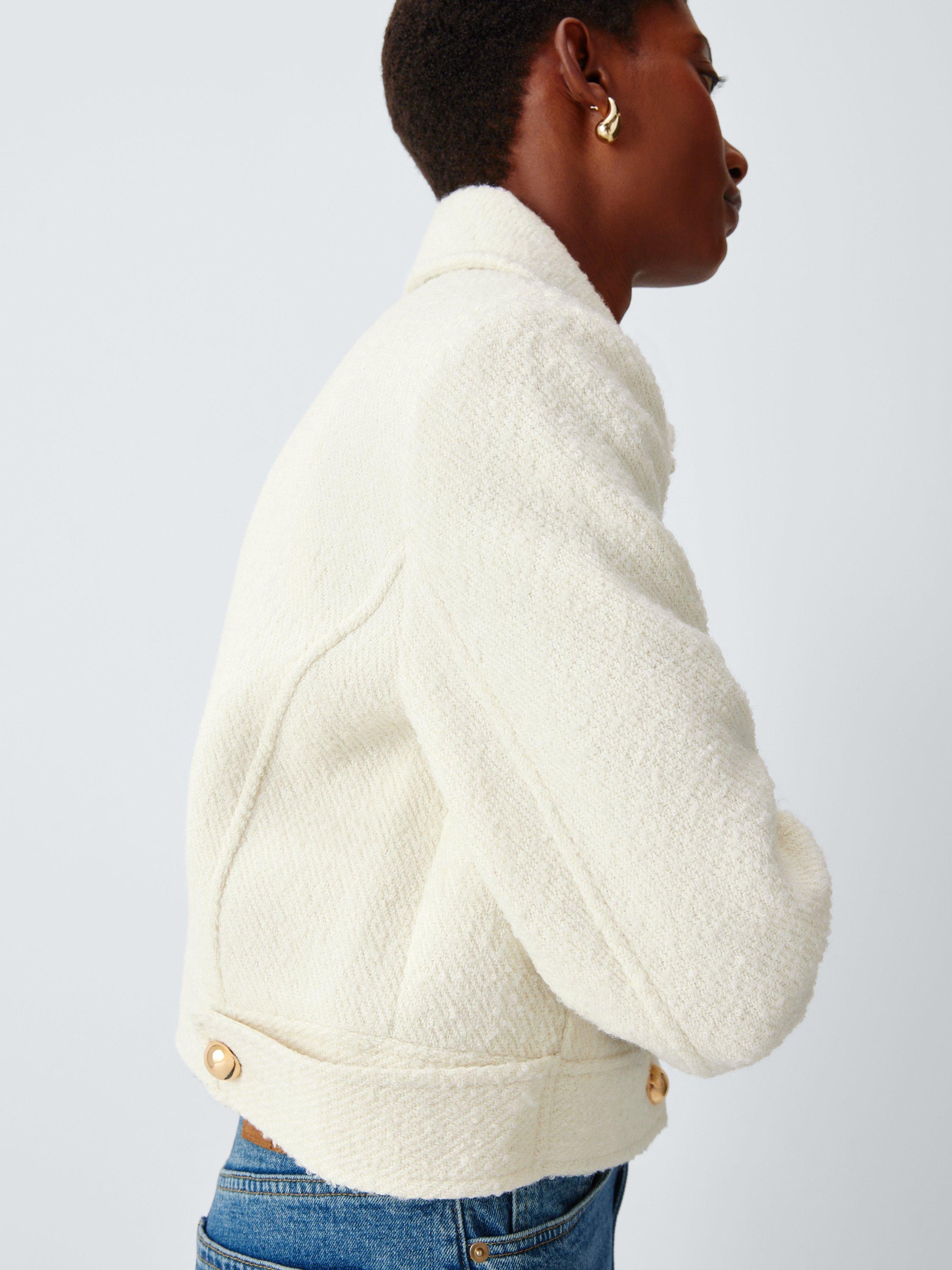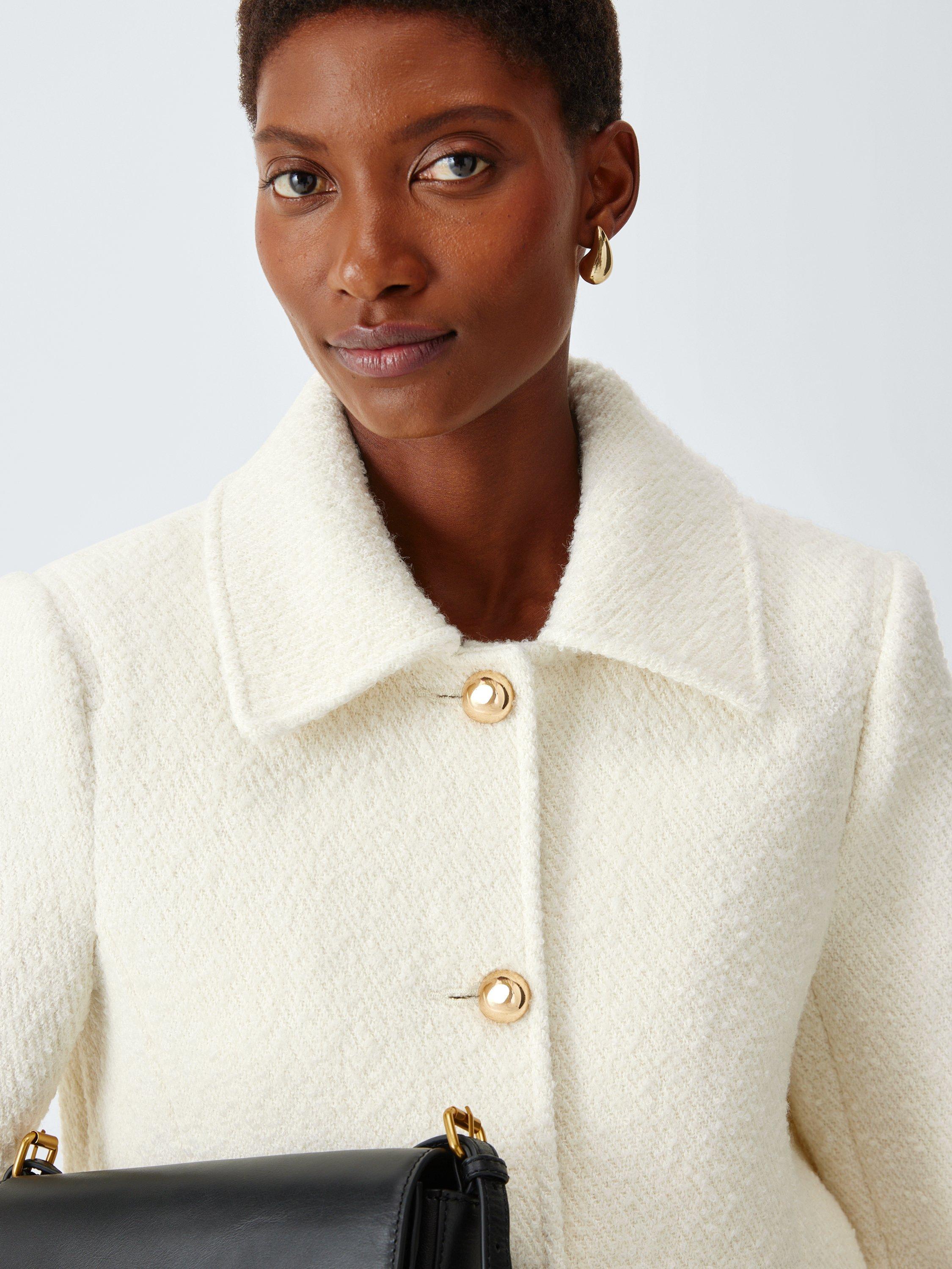 A wool blend brings softness to this boucle textured jacket. It's finished with a collar and gold-toned buttons down the front.