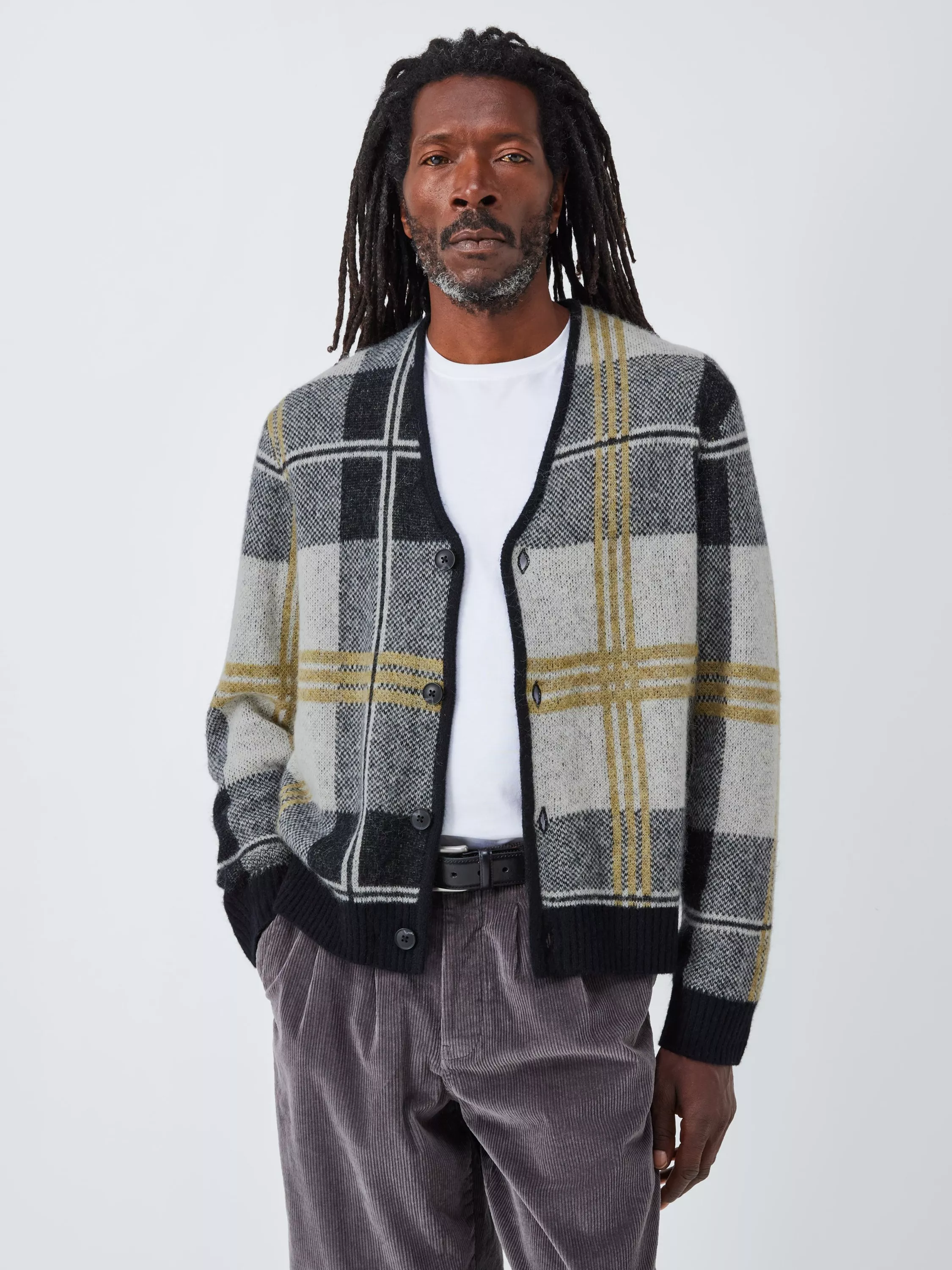 V-neck cardigan made from pure merino wool in an all-over check pattern. Styled with a button-down fastening, and narrow collar and placket. Great for layering over plain shirts and T-shirts.