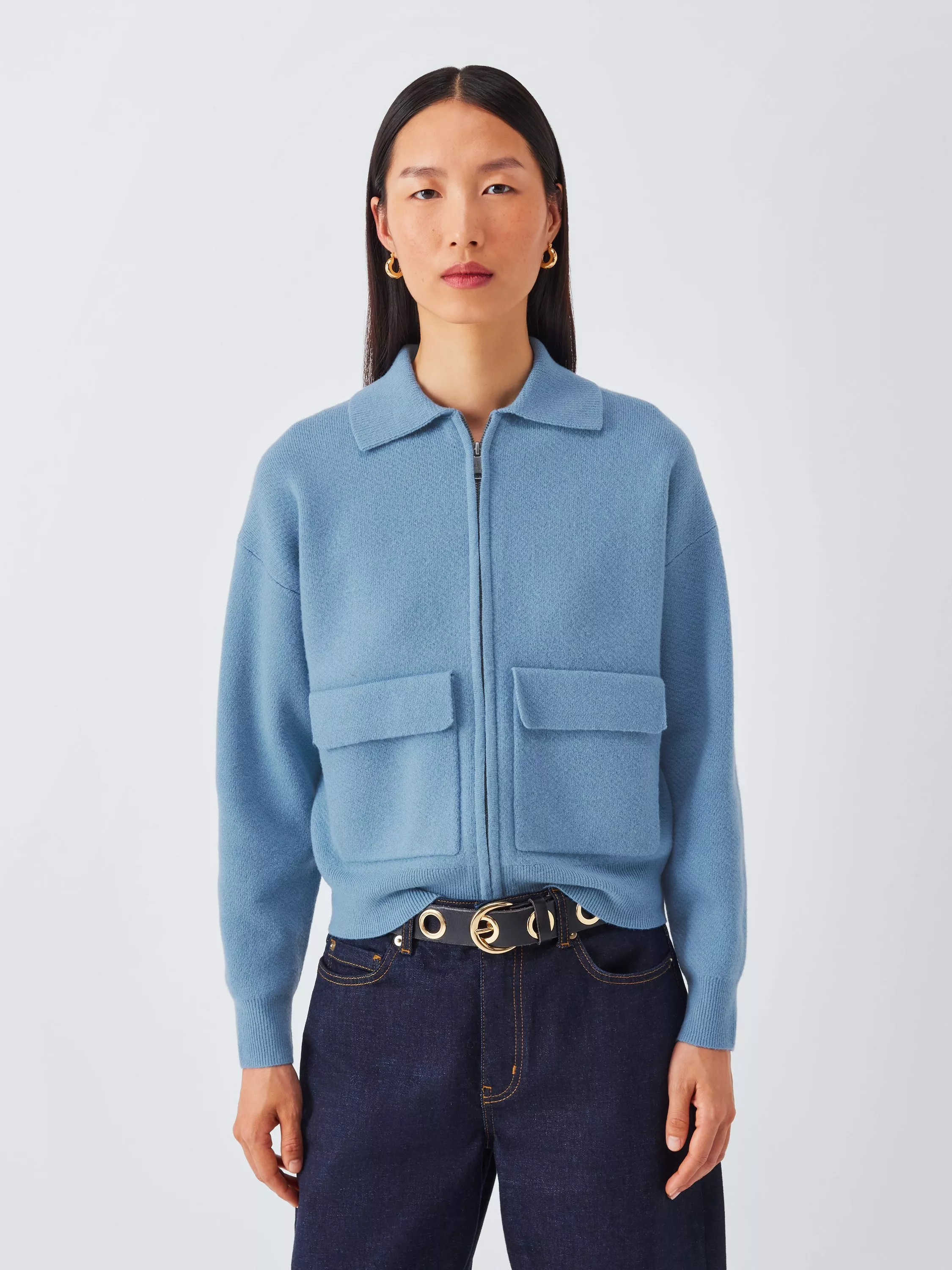 A zip-through jacket with a collar and two large flap patch pockets on the front. Knitted with a contrasting ribbed knit on the hem and cuffs. The fabric blend includes naturally temperature-regulating wool with nylon, which adds softness to the yarn.