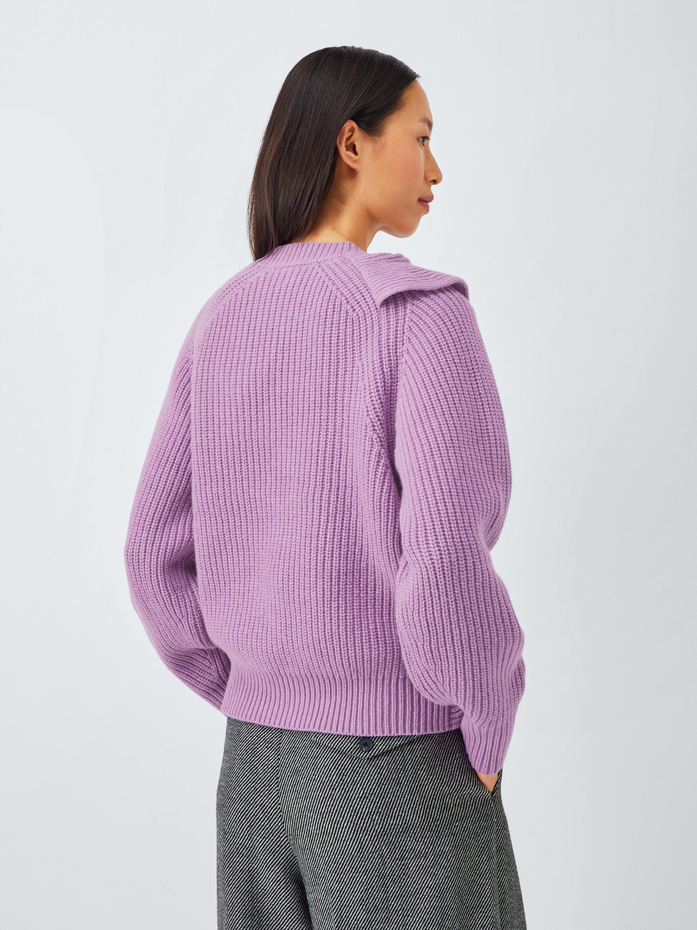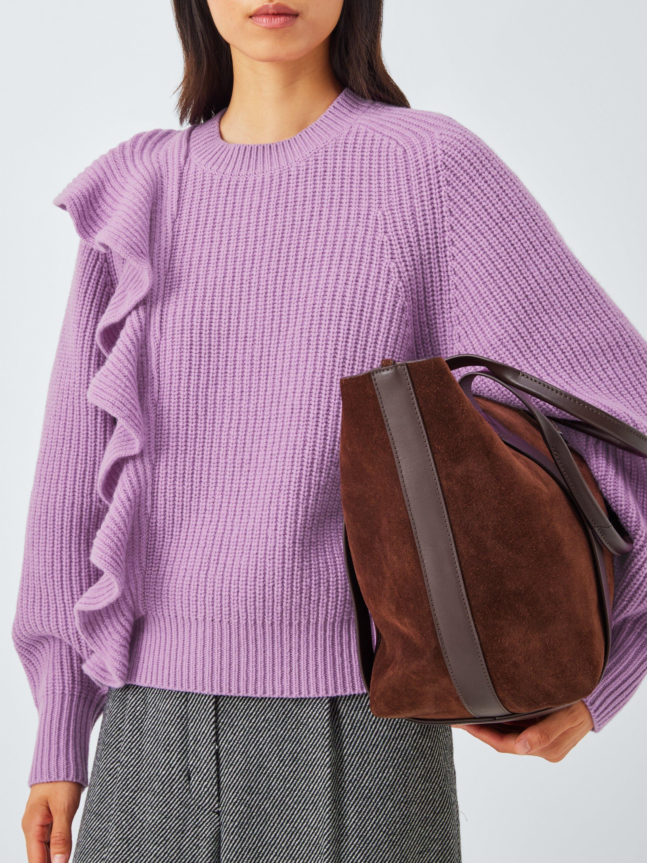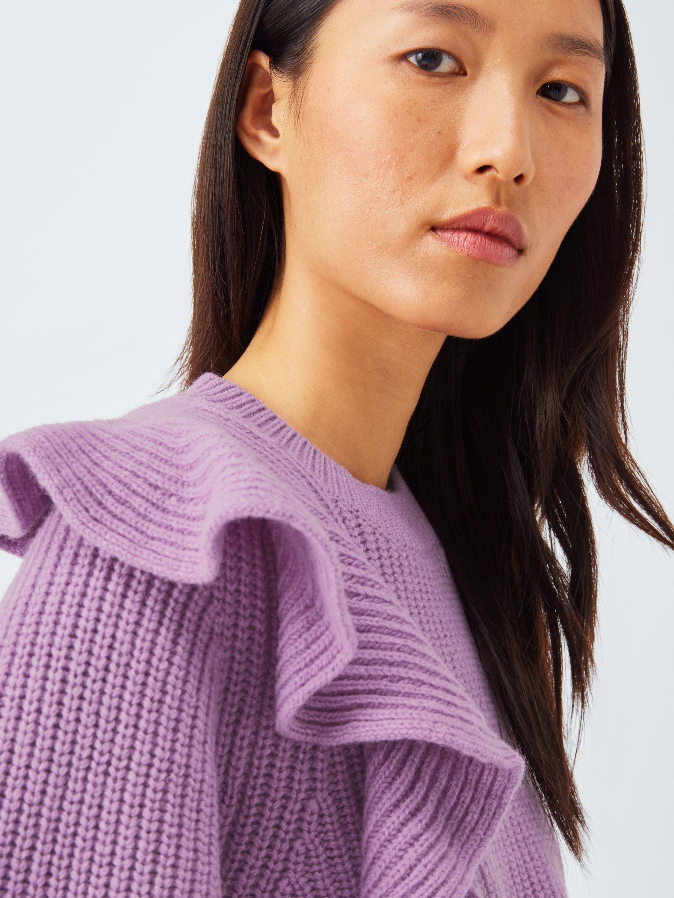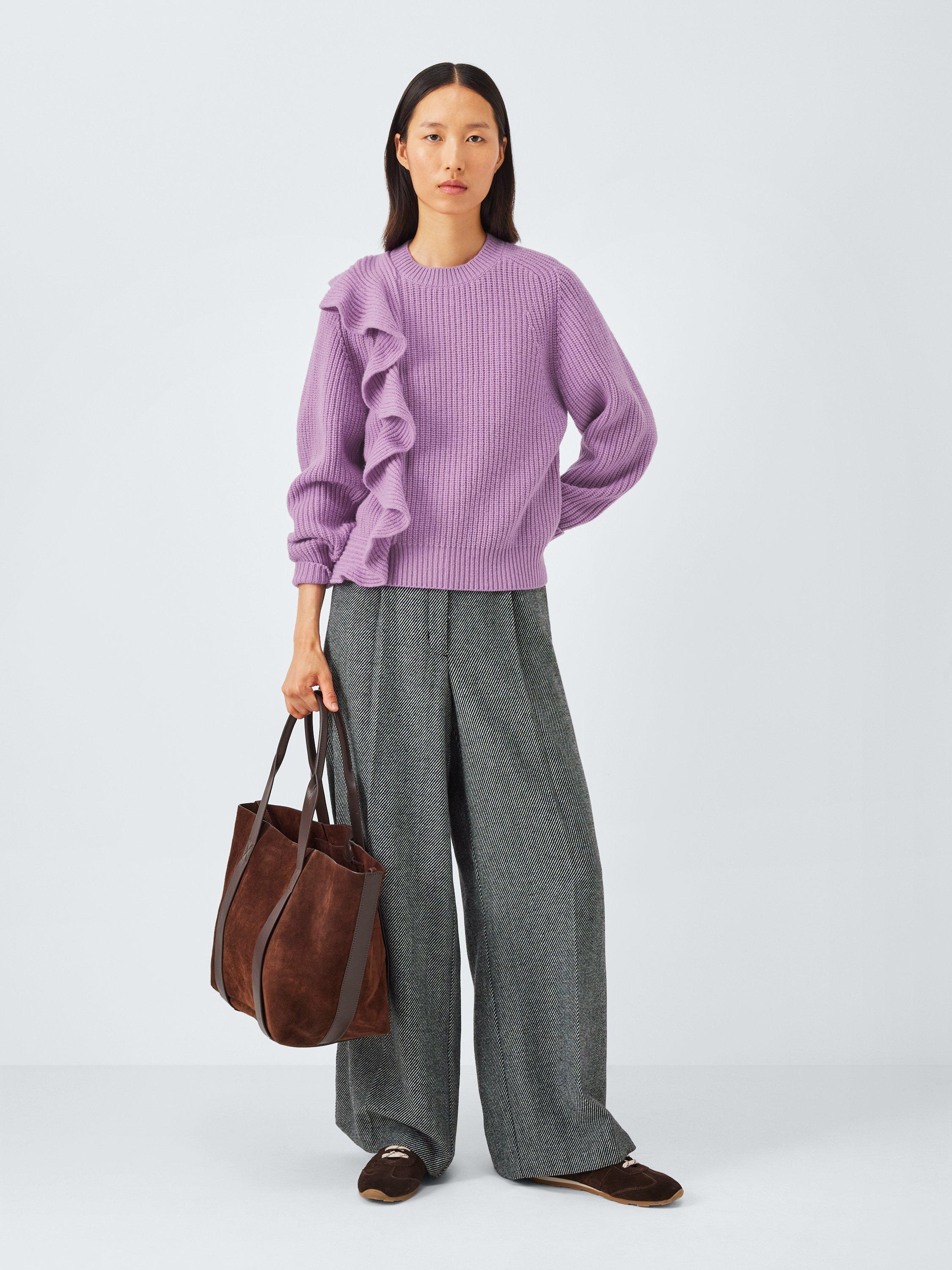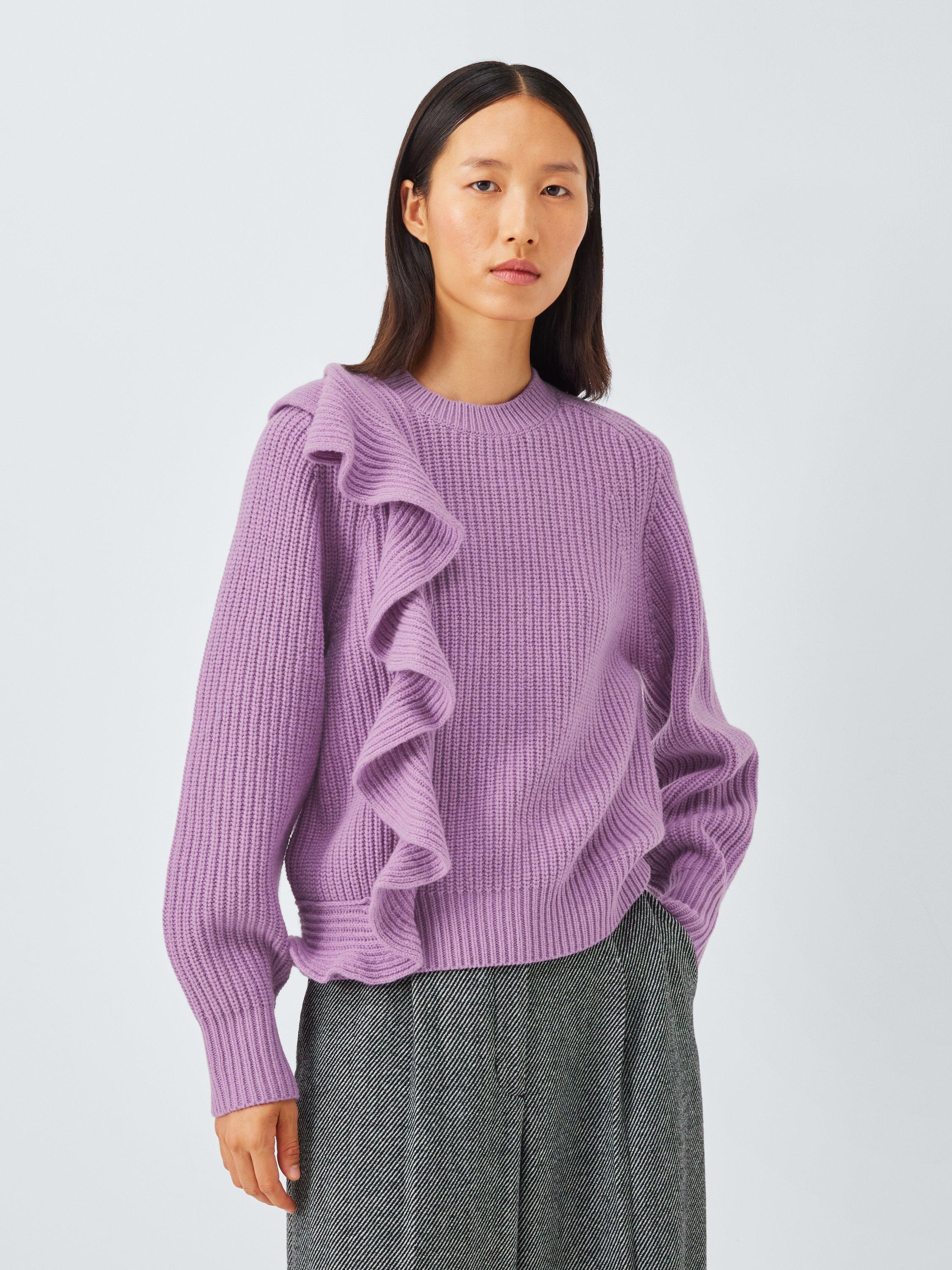 A cosy ribbed knit jumper updated with an asymmetrical ruffle detail for a contemporary look. The fabric blend includes naturally temperature-regulating wool with nylon, which adds softness to the yarn.