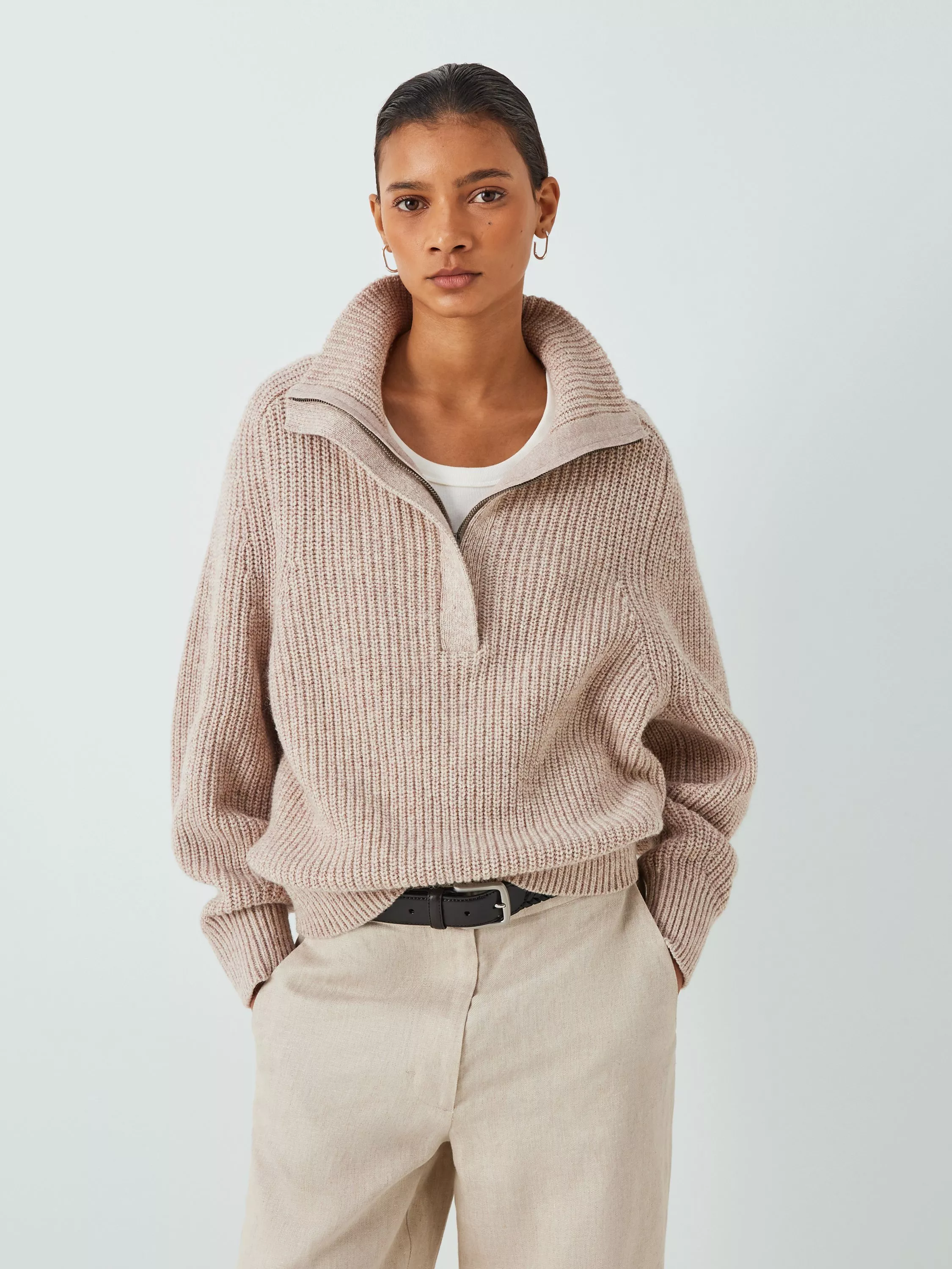 Zip neck jumper, an ideal layer. A cosy chunky knit with a funnel neck, made of a soft blend of cotton with a luxurious touch of wool.