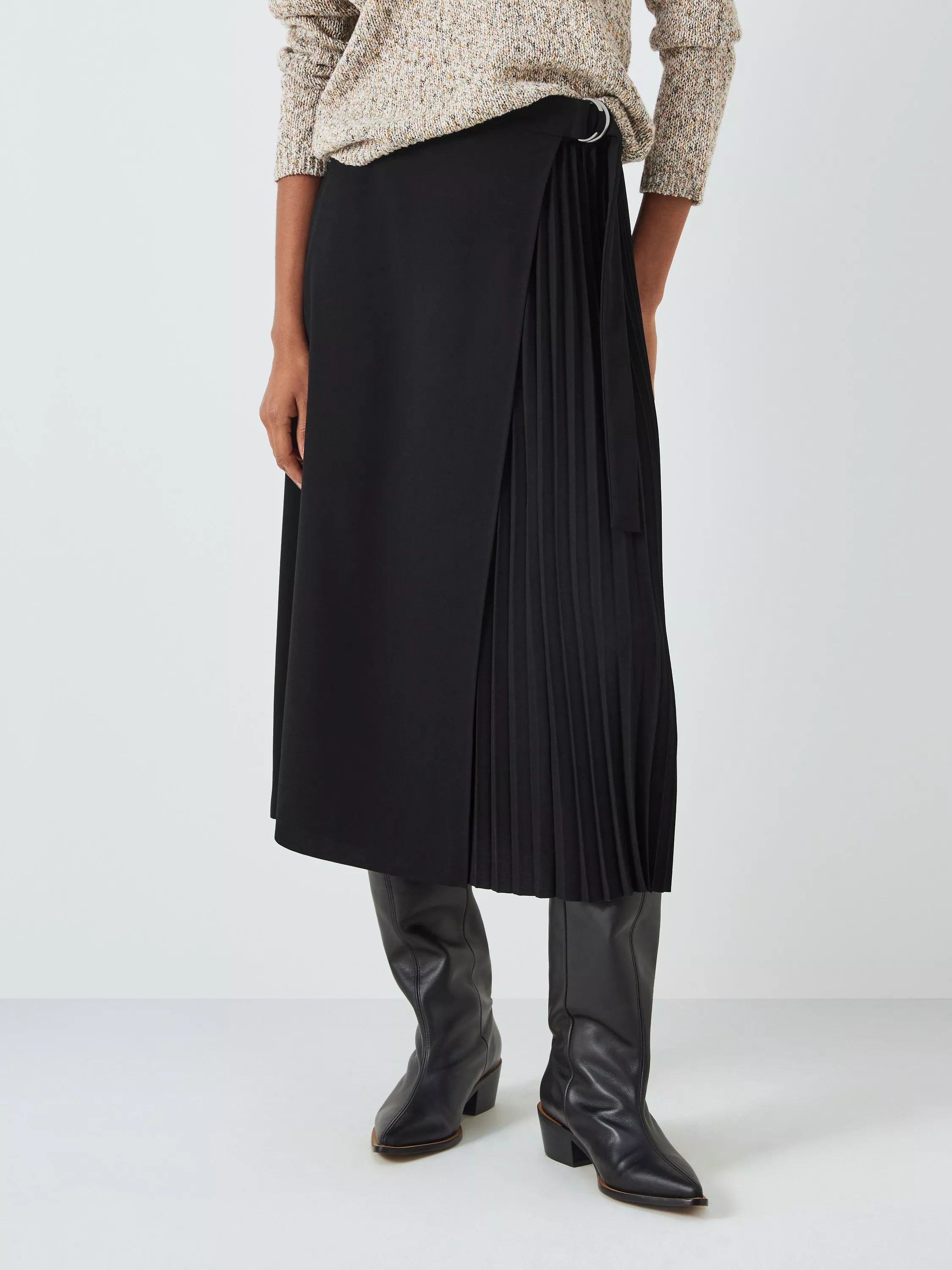 Woven midi-length skirt pleated on one side and finished with a double buckle at the waist. A contemporary look with a blouse for the office or team with slouchy knitwear and boots for weekends.