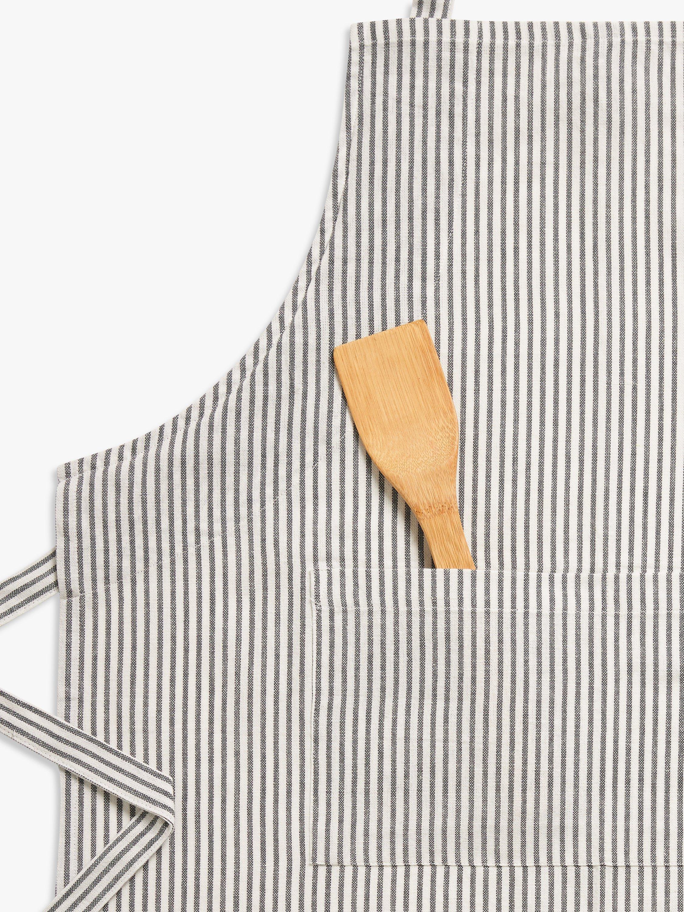 Woven cotton apron with classic stripes. Comes with a neck loop and adjustable ties plus a handy front pocket for small kitchen utensils, barbecue tools or your phone. Made of pure cotton, it's durable, machine washable and coordinates with the matching oven gloves and tea towels.