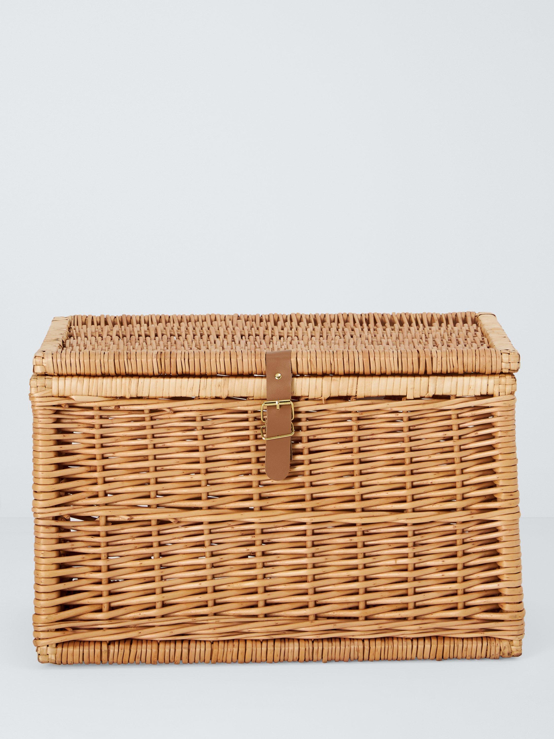 This spacious woven trunk comes with a leather strap and metal buckle.