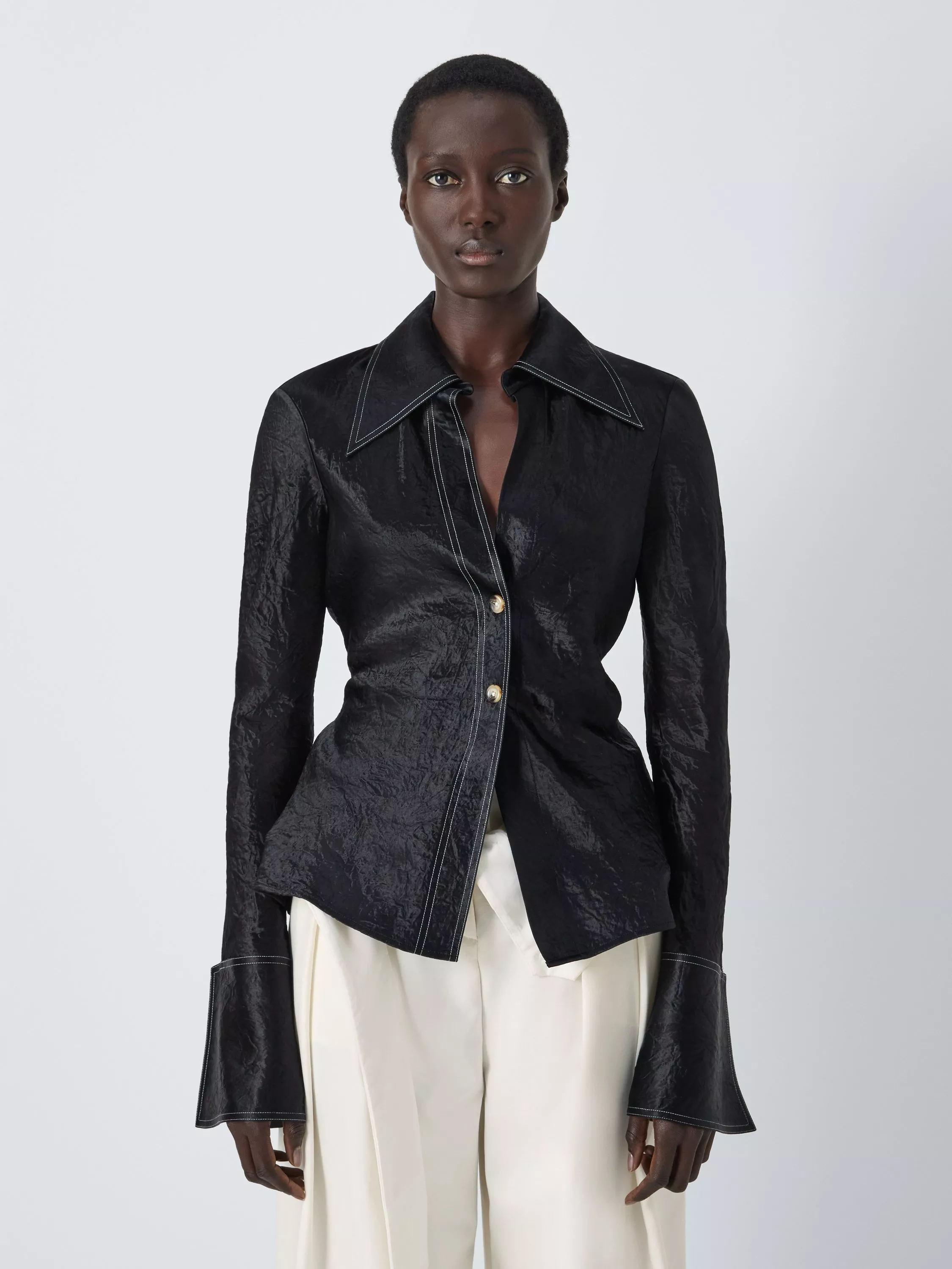 Slim fit shirt with a wide collar and oversized cuffs, emphasised by the contrast stitching. Fastens with two front buttons. The fabric has a subtle crinkle texture and sheen for a luxe look.
