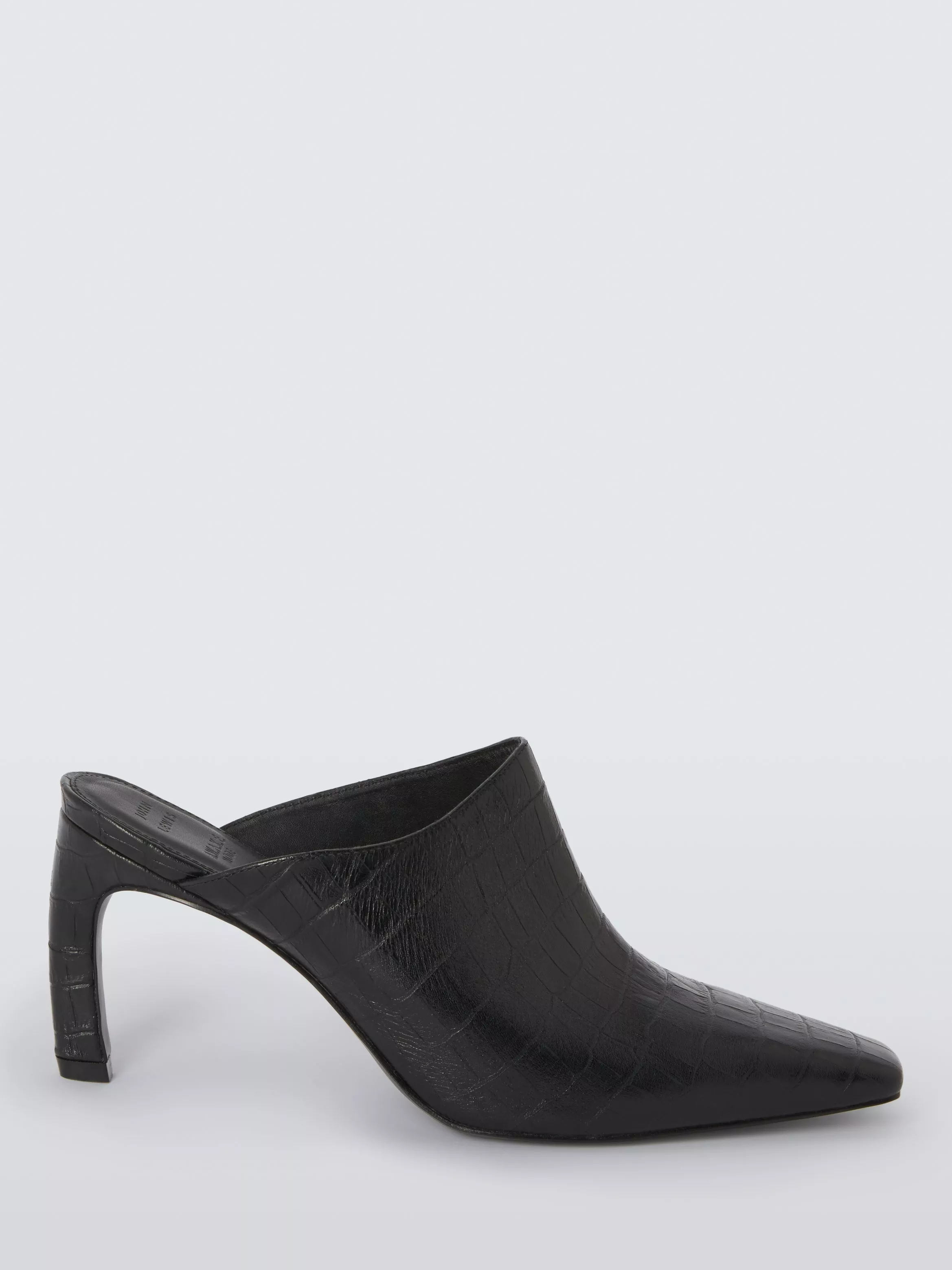 Dressy slip-on mules in crocodile-effect leather. A sculptural curved heel makes a statement.