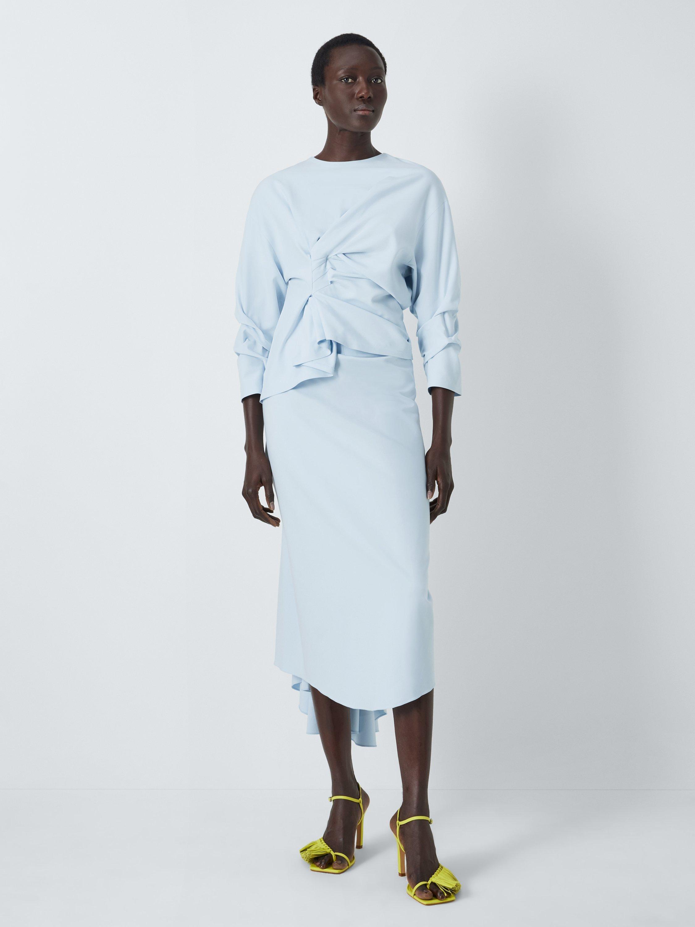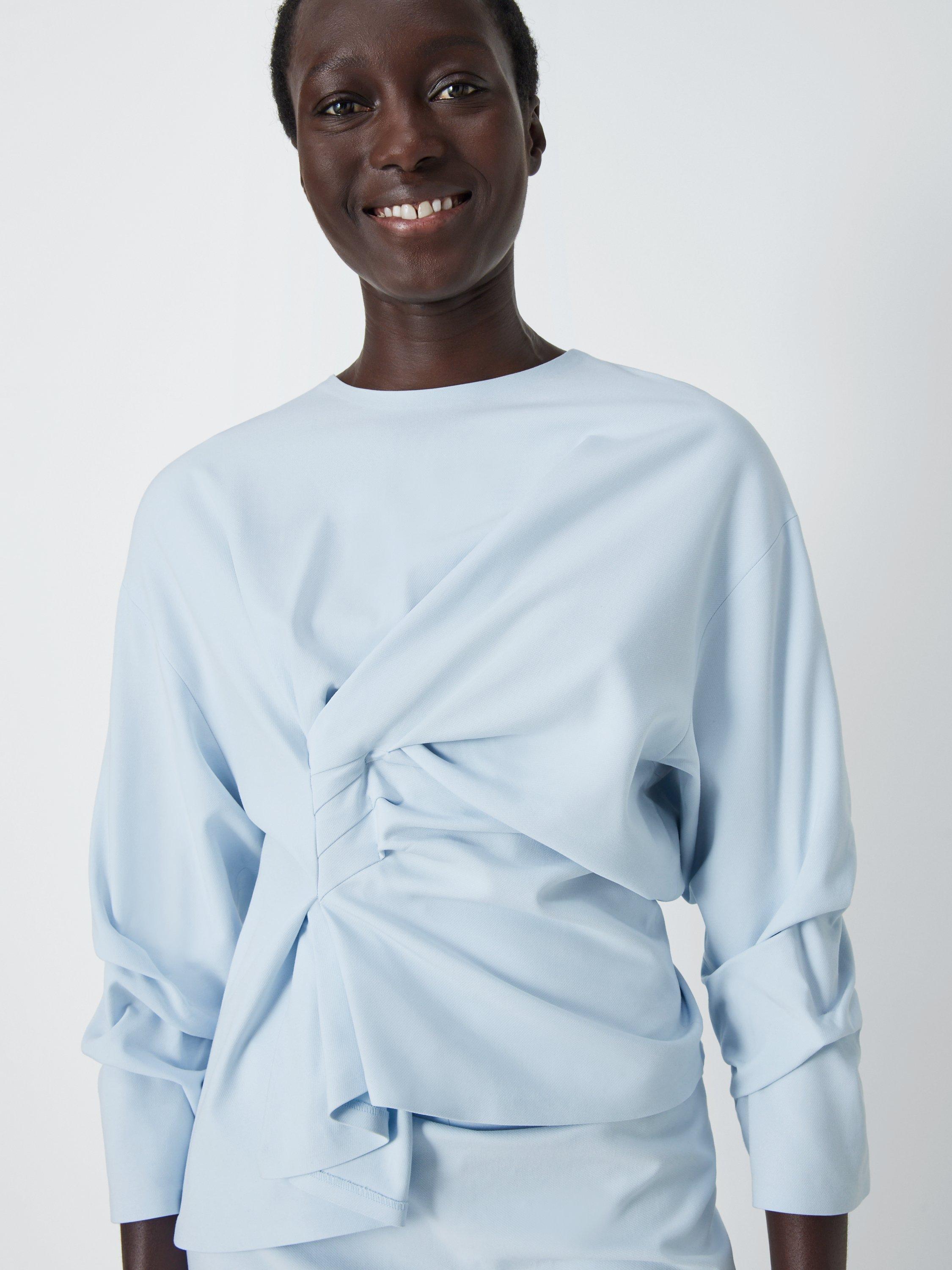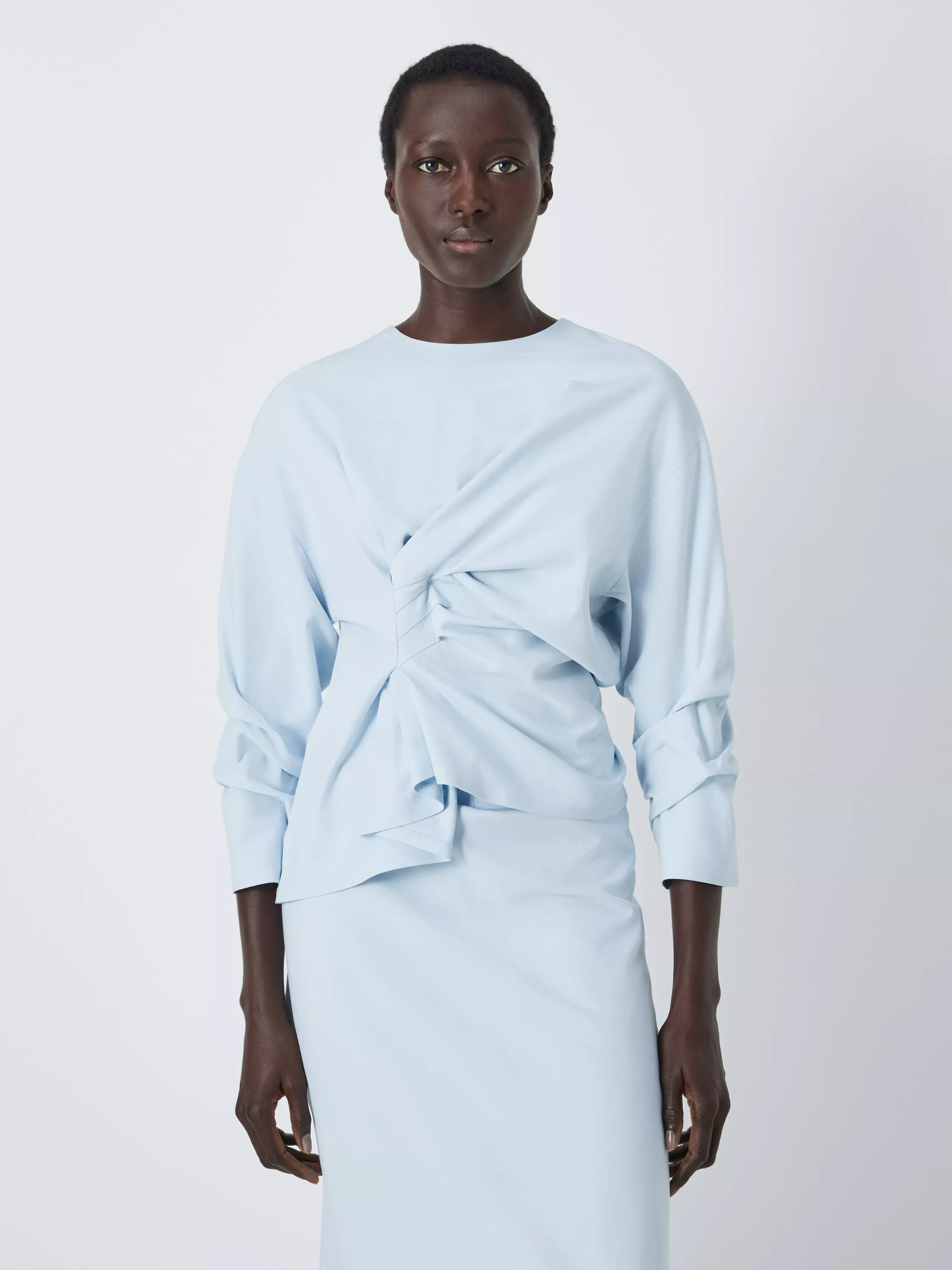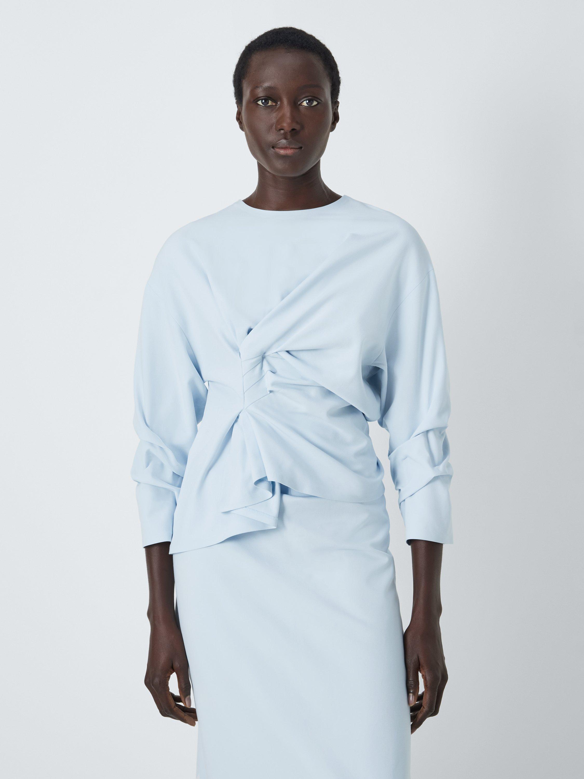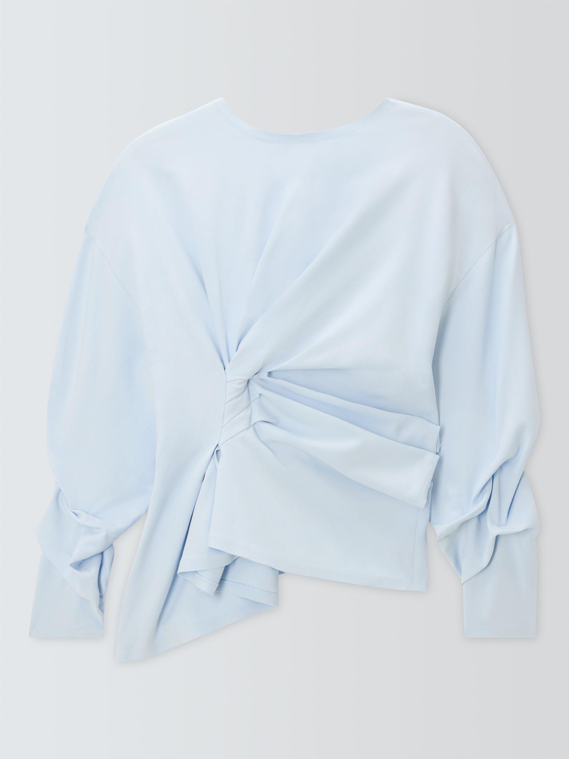Blouse with a knot detail at the front and back. The fabric drapes beautifully, with ruched detailing on the midi length sleeves. Fastens with a zip at the back neck.