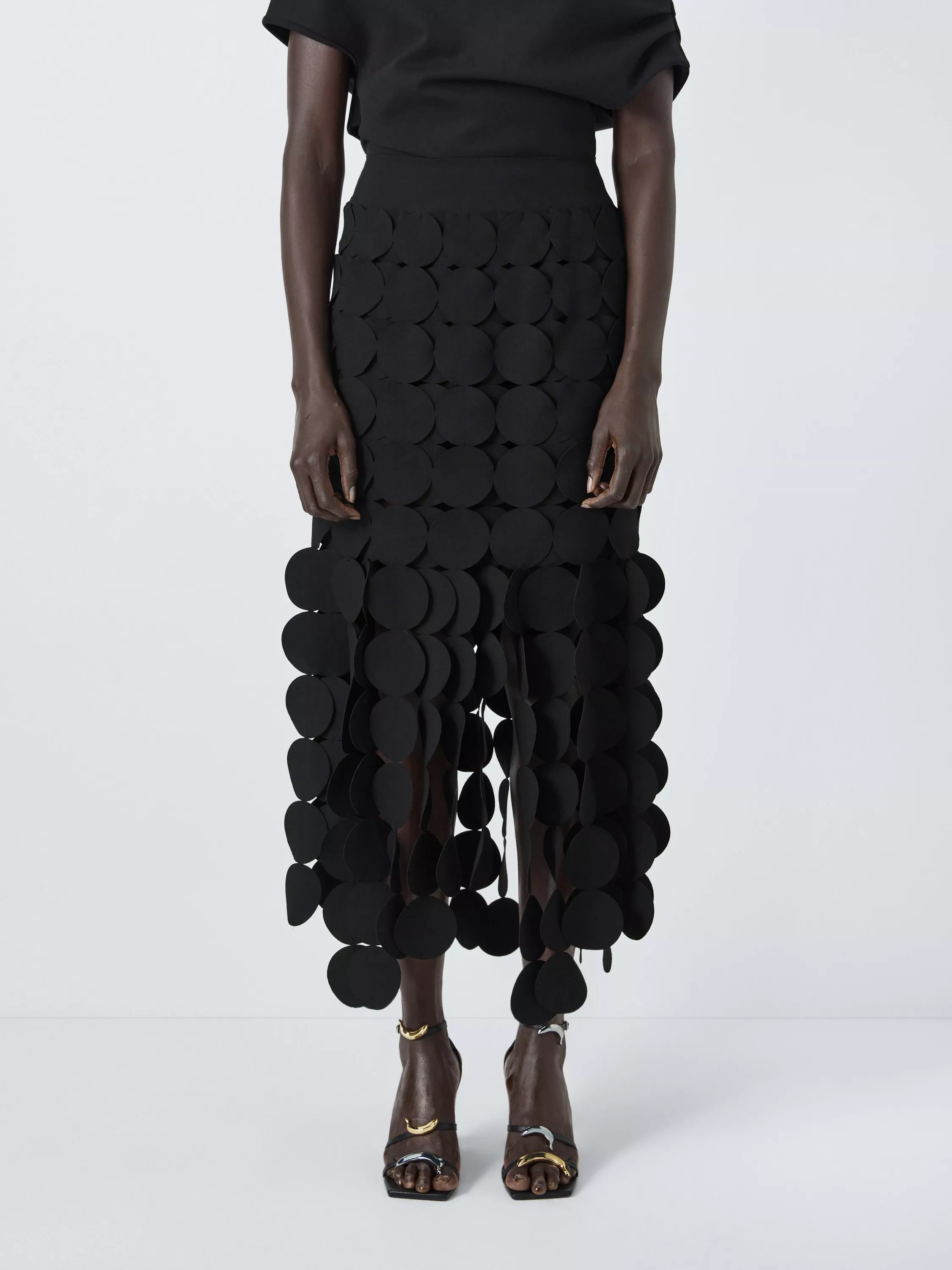 Statement maxi-length skirt with multiple cut-out circle details. Lined to a short length for comfort while allowing the design to make an impact.