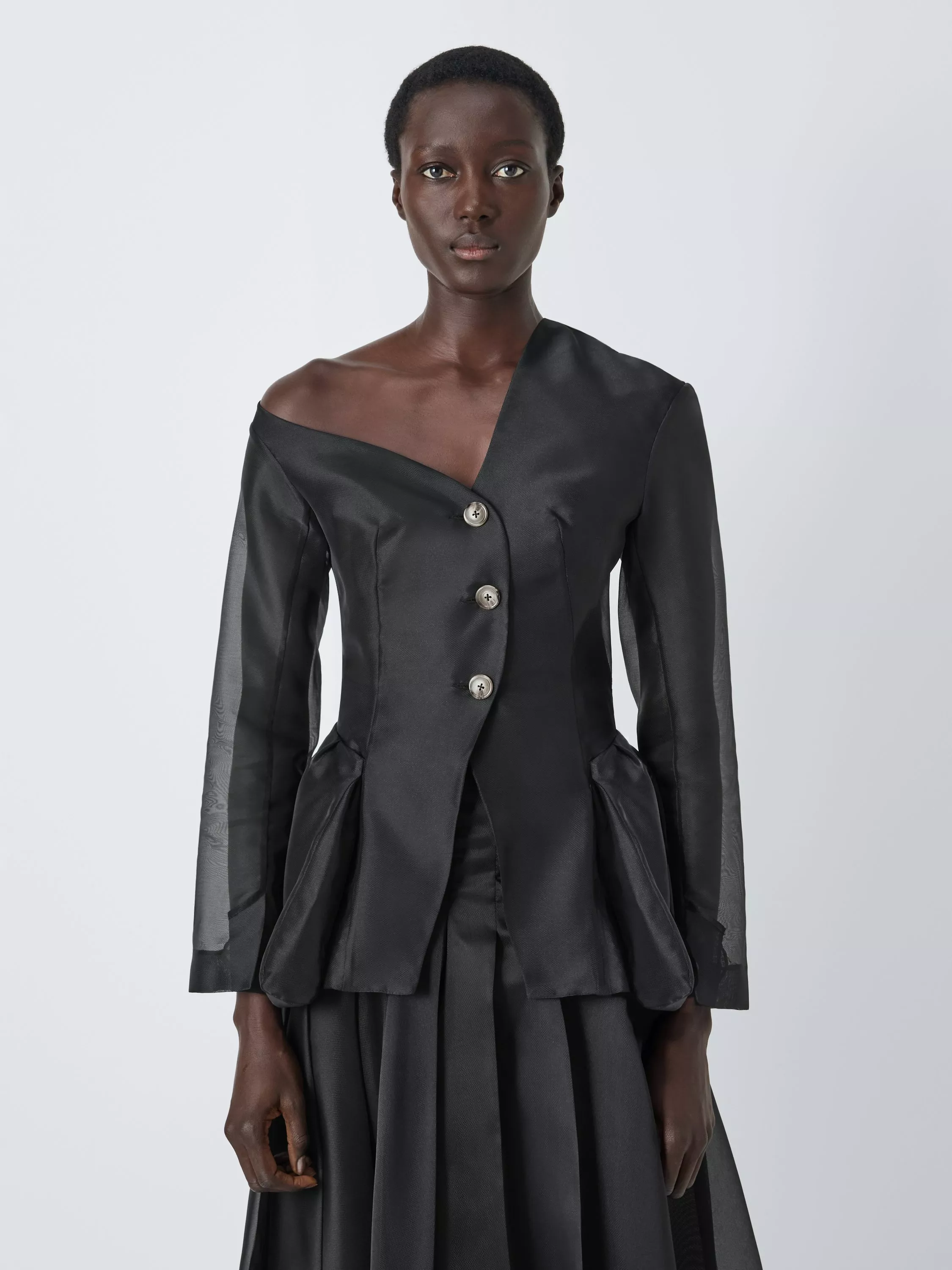 Sheer fabric fitted jacket with an asymmetric neckline. A slim fit with a three-button fastening at the front and single vent at the back.