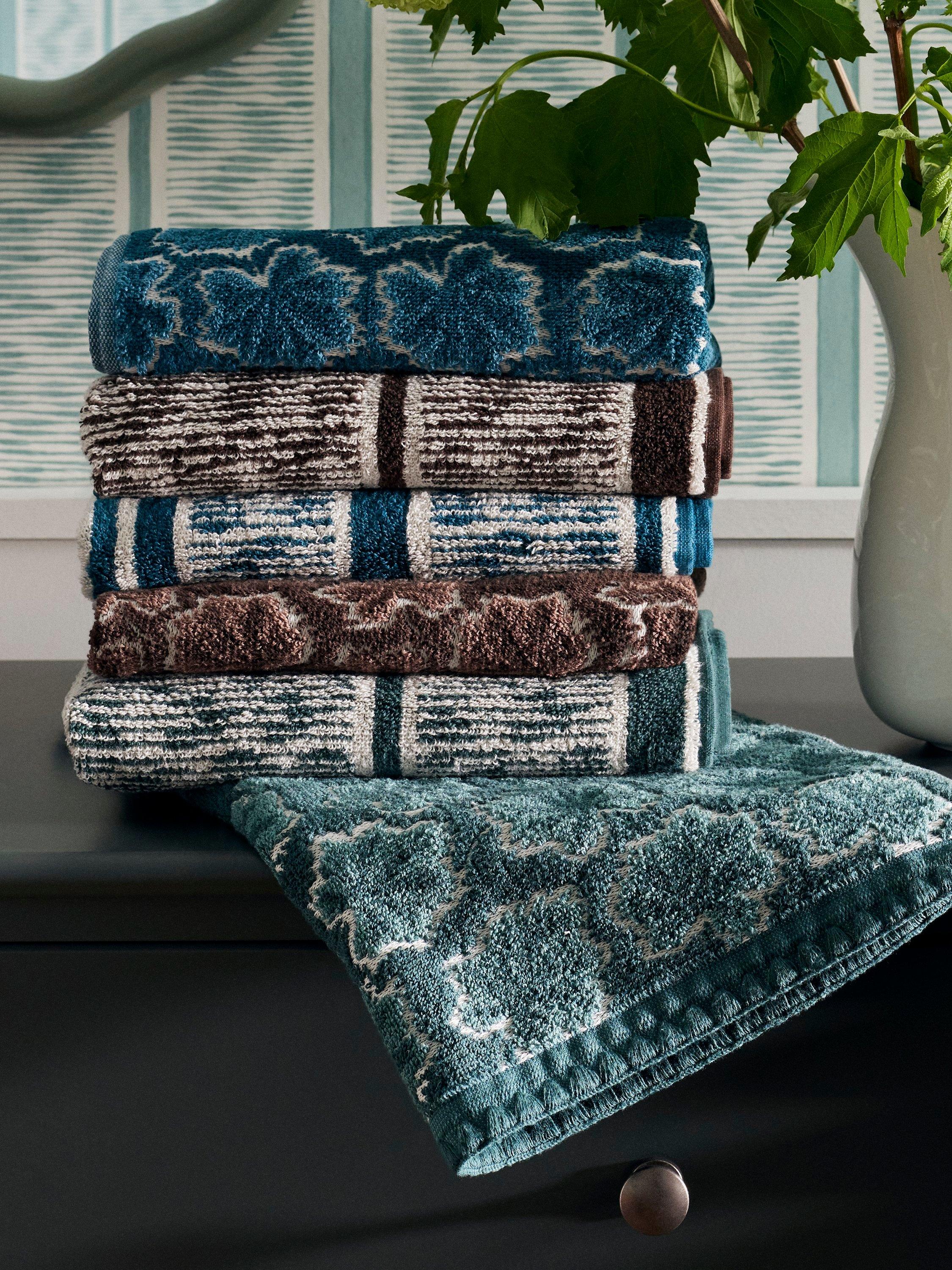 These cotton towels have an updated Ikat design that leads itself to a variety of bathroom decorating schemes.