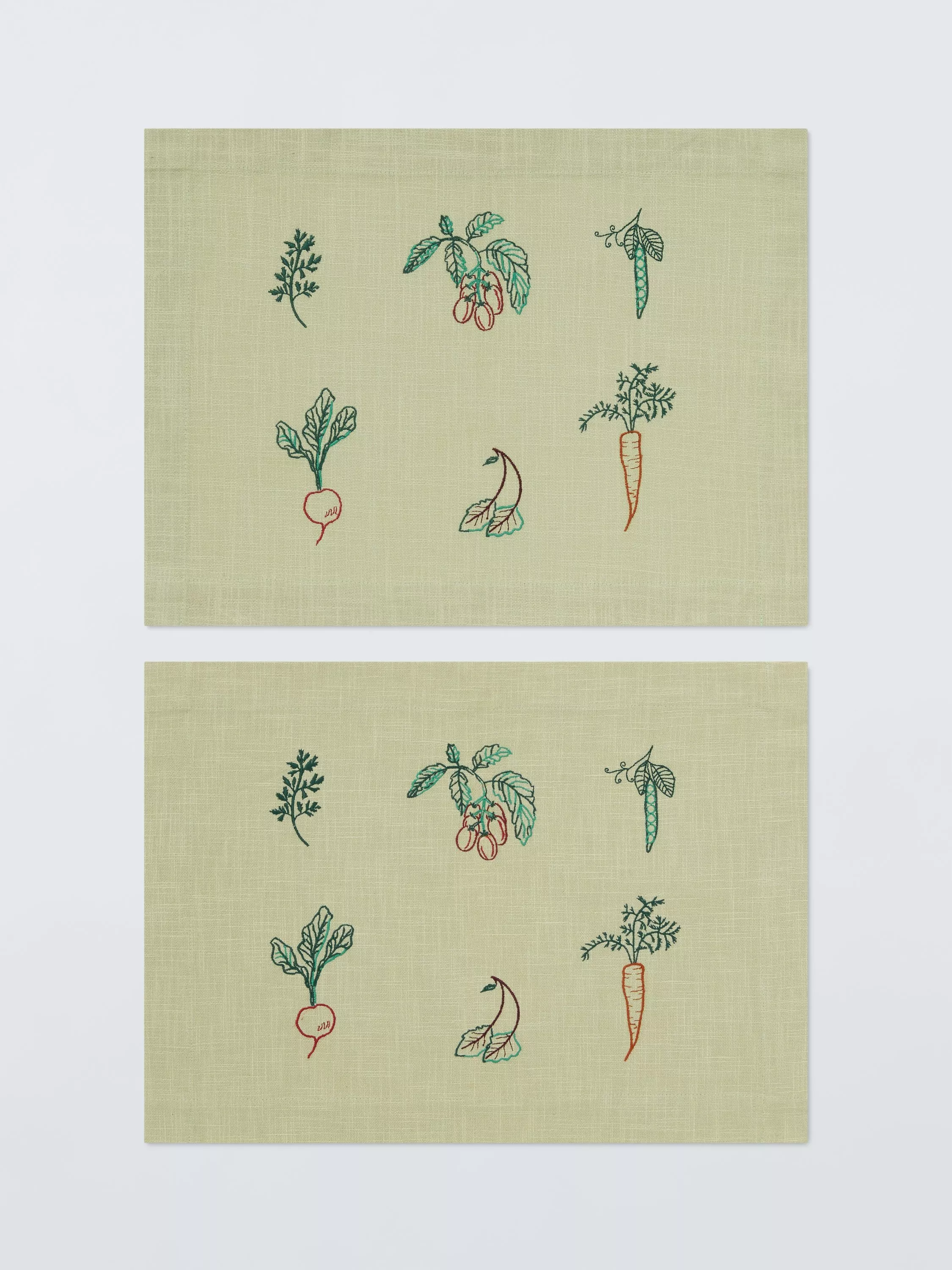 Pair of rectangular placemats in an exclusive design featuring garden produce. Made of pure cotton, they're machine washable for easy cleaning.