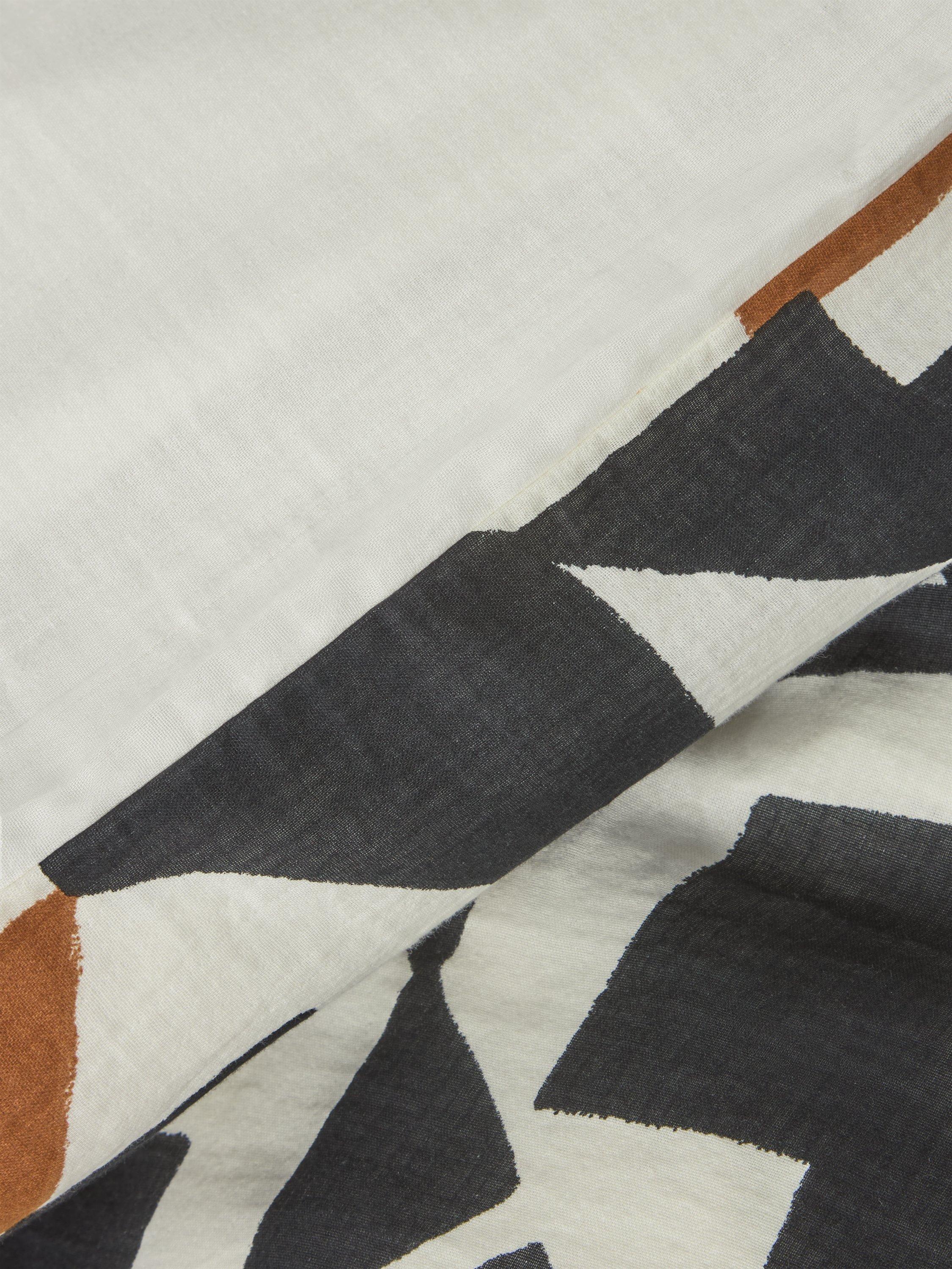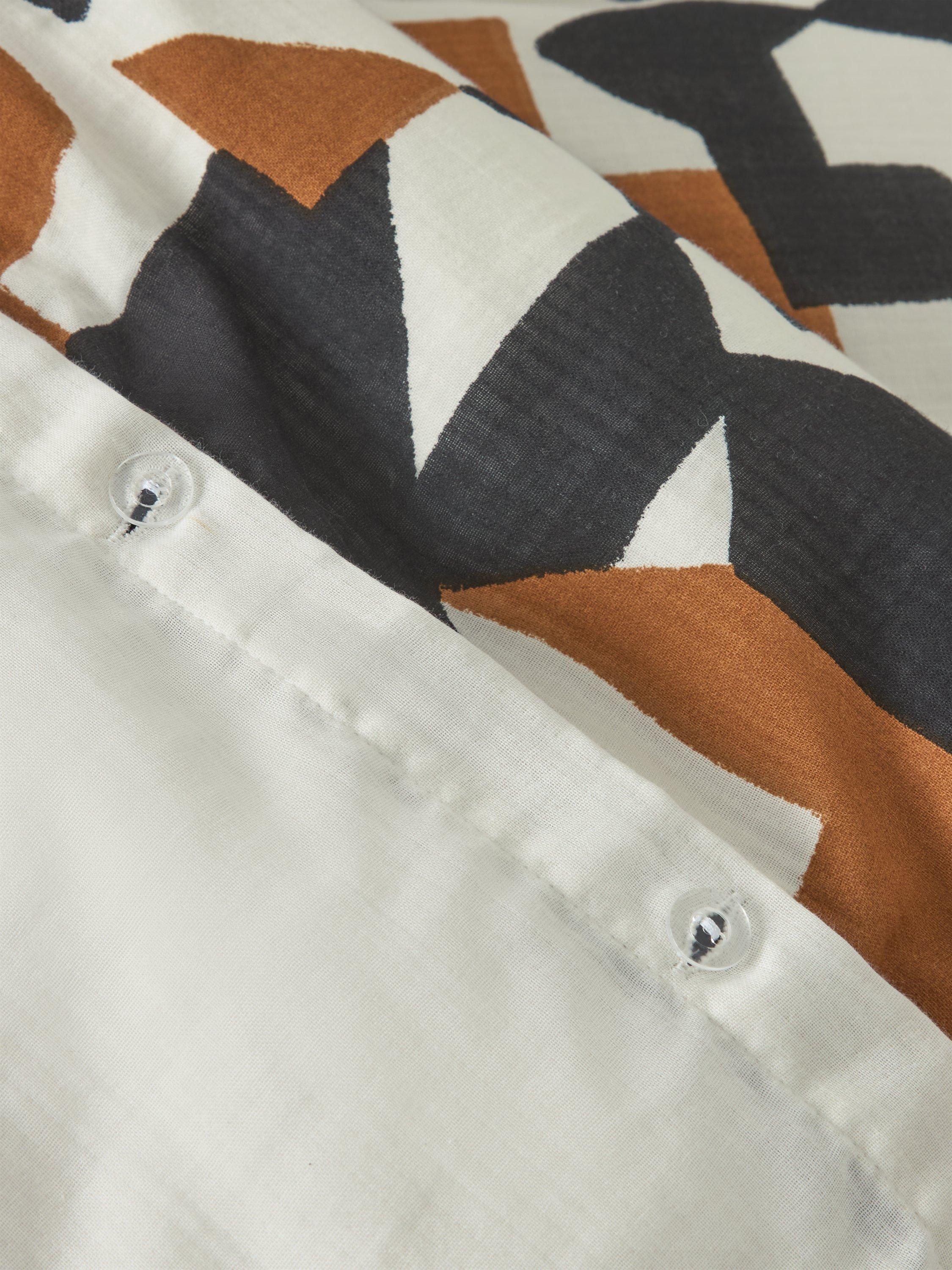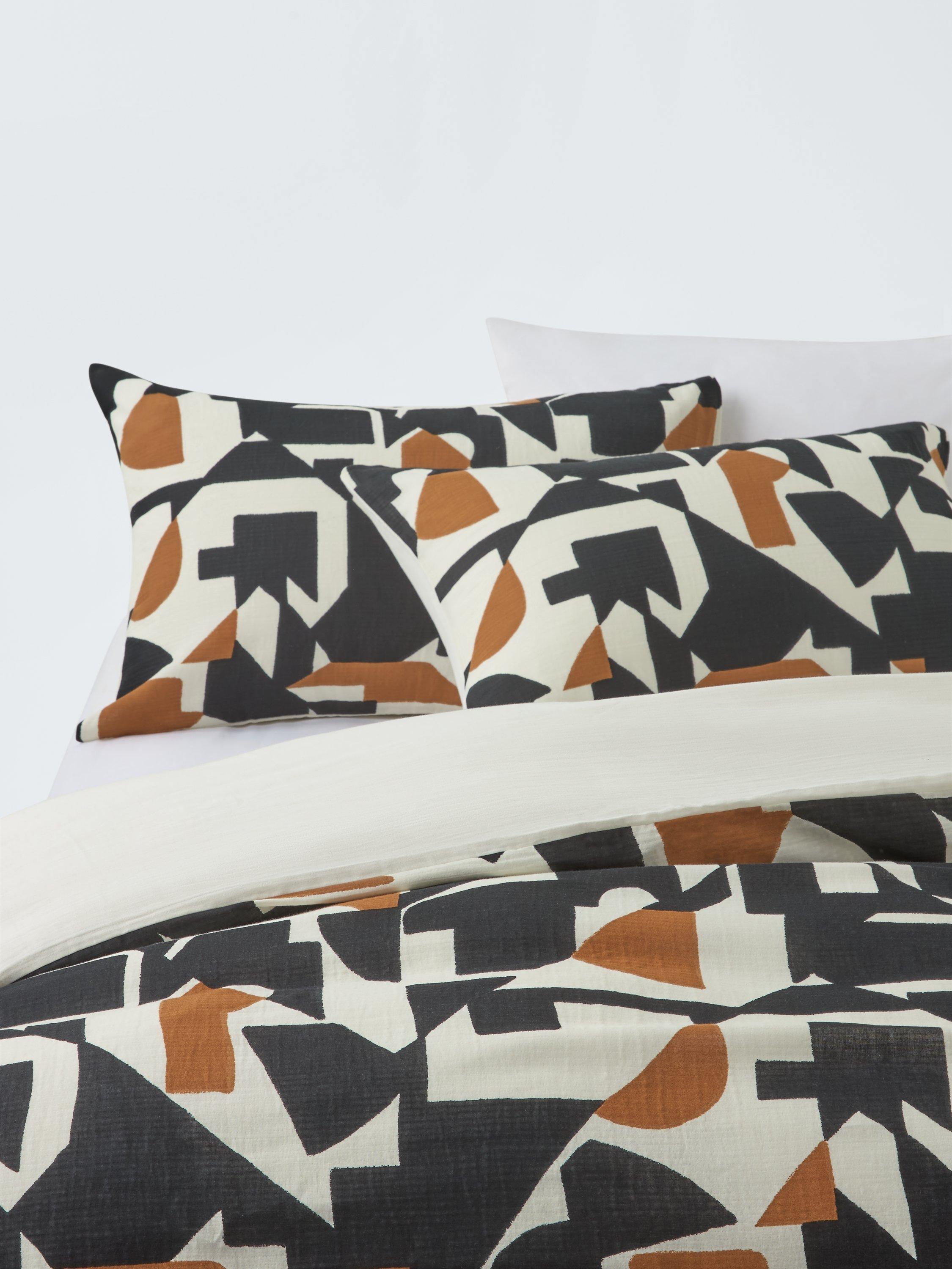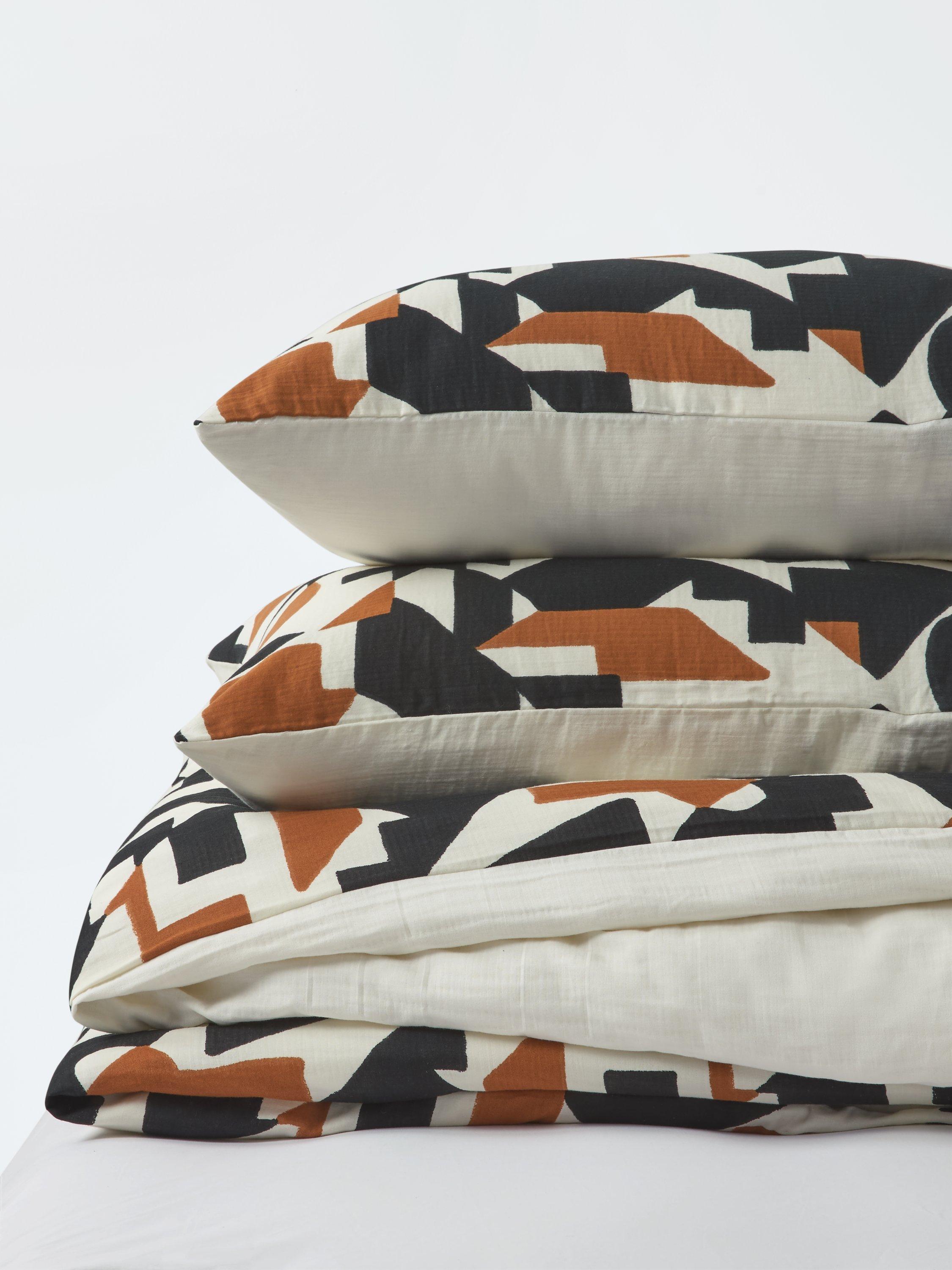 Thorp gives your bedroom on-trend vibes with it's geometric pattern in shades of black, tan and cream. The back is plain.