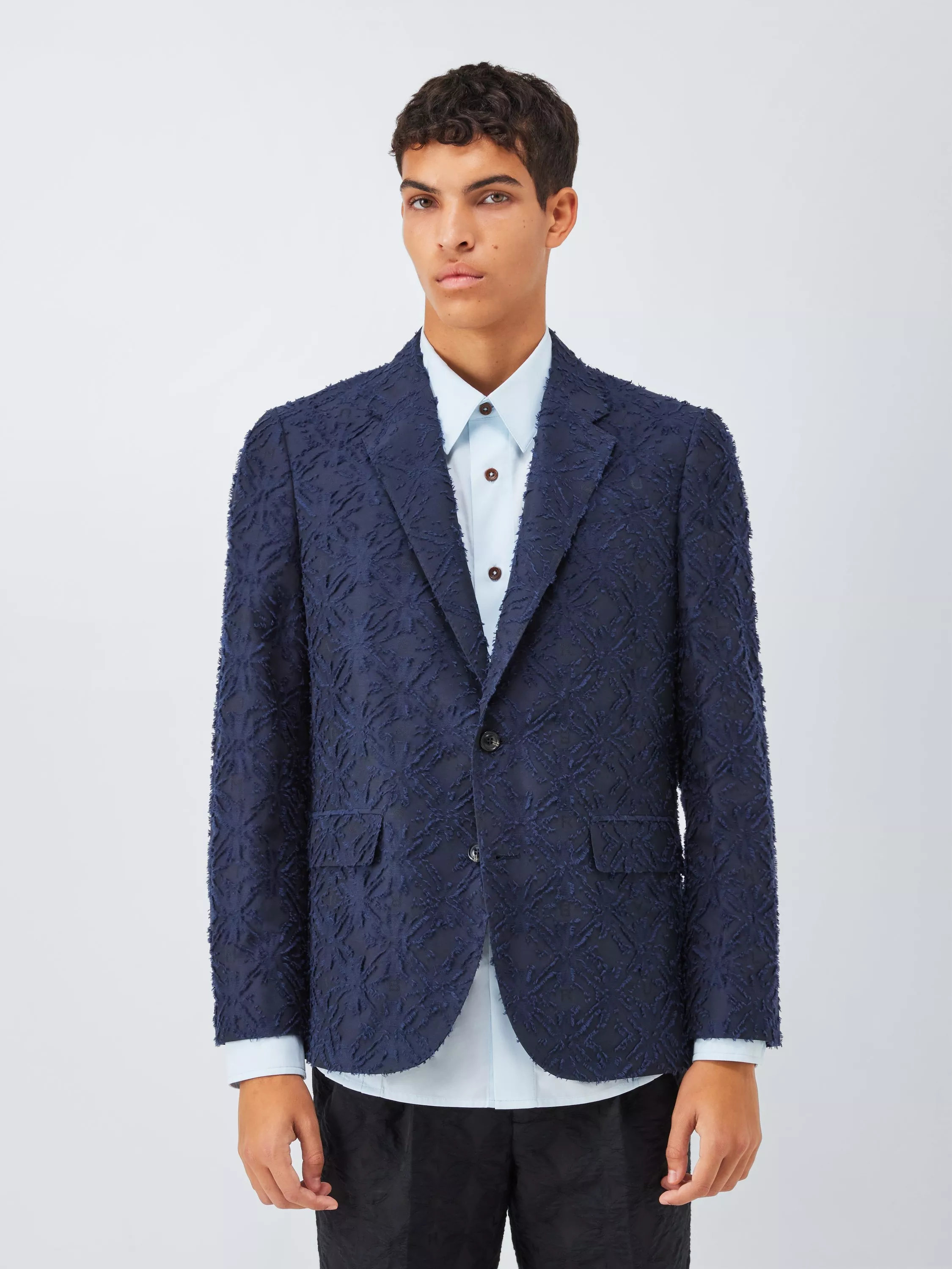 Single-breasted blazer in a textured cotton blend fabric and jacquard weave pattern. Lined for comfort, the jacket features a notch lapel, two front flap pockets and a single welt pocket on the left chest.
