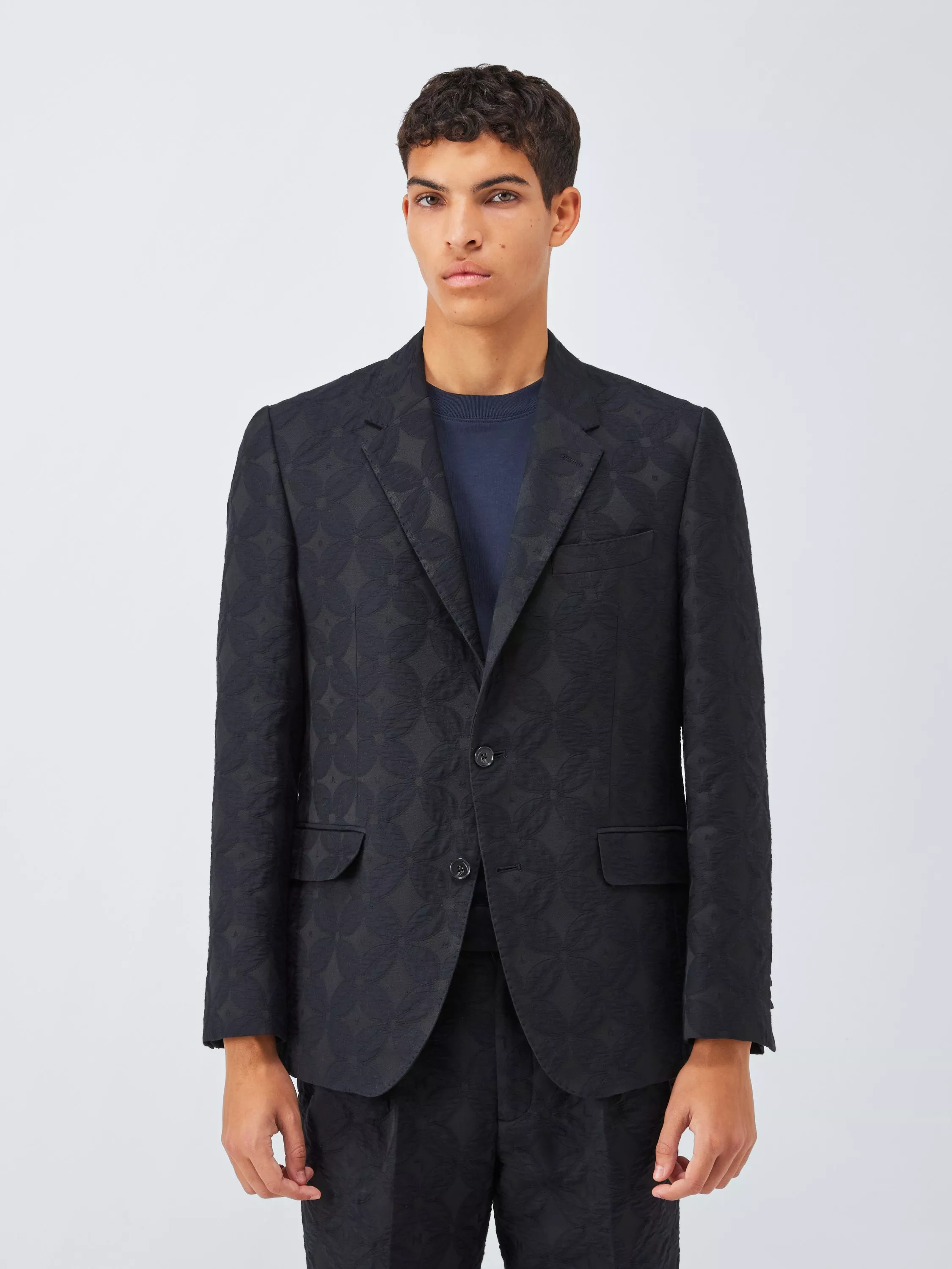 Single-breasted blazer in a textured cotton blend fabric. The bespoke jacquard weave pattern is inspired by the Labrum signature cowrie shell print. Lined for comfort, the jacket features a notch lapel, two front flap pockets, a single welt pocket on the left chest, coconut buttons, and contrast fabric panels. Team with the matching trousers for the full look.
