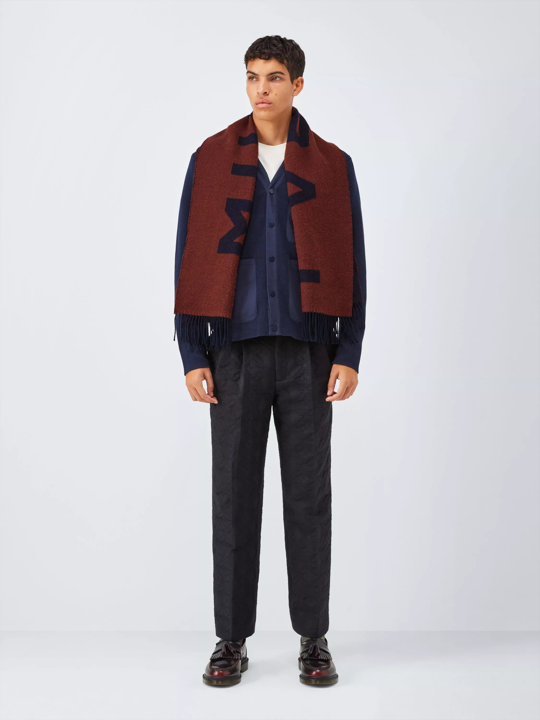Scarf made of naturally temperature-regulating wool. Styled with a large Labrum logo in contrasting colours and completed with tassels for texture.