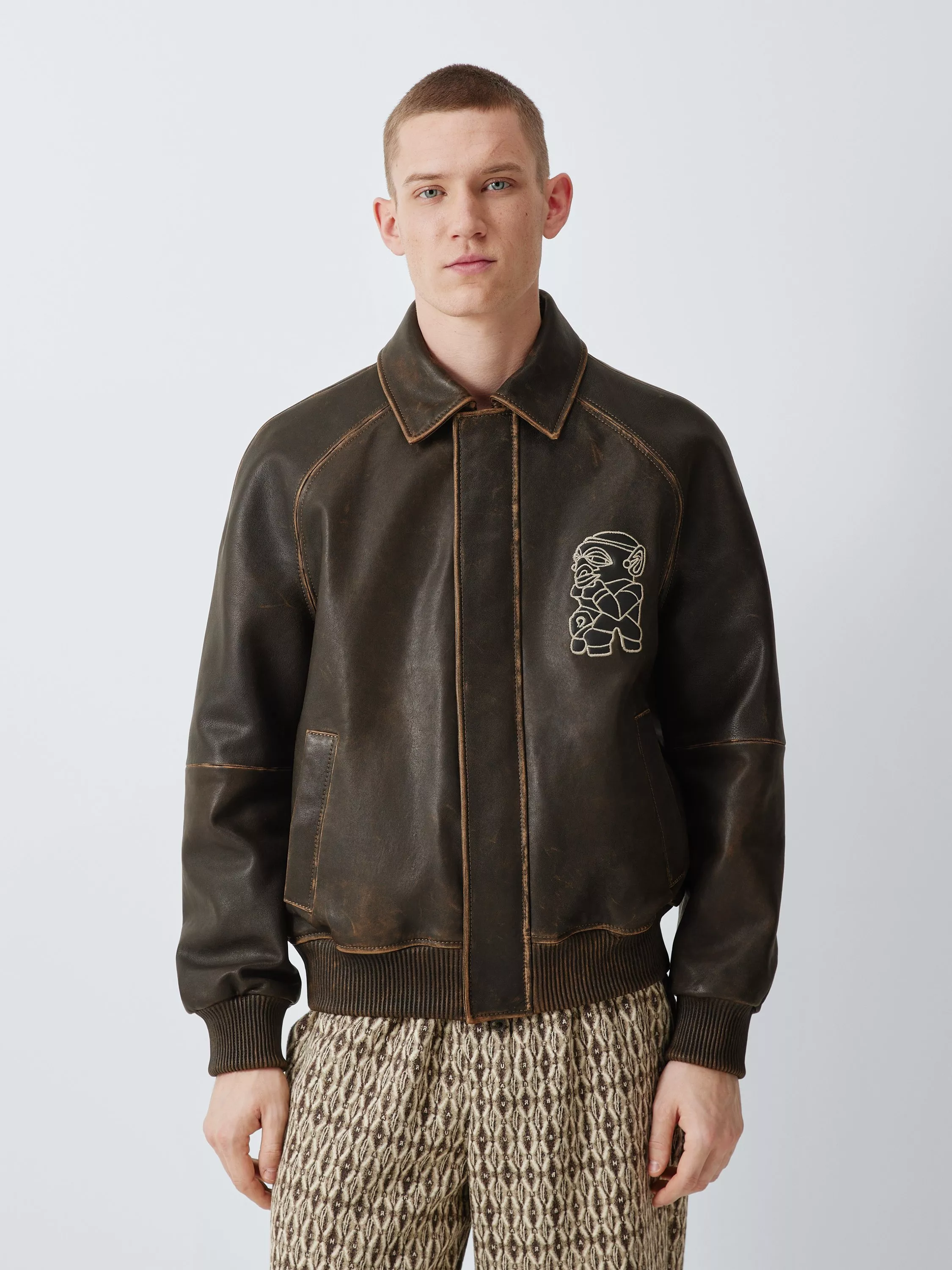 An embroidered Nomoli symbol logo and concealed press stud front lend this leather bomber jacket a contemporary edge. Distinctive distressed seams give it a rugged, lived-in character. Finished with tonal ribbed trims, a point collar and LABRUM logo patch on the back.