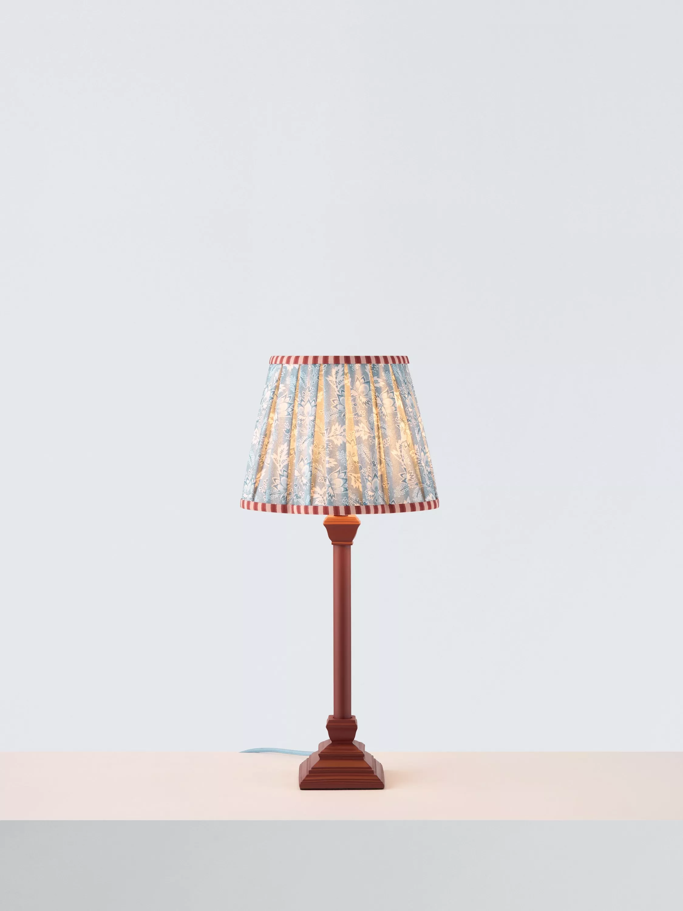 Candlestick-style table lamp bringing a timeless elegance to any living space. Featuring a square resin base adorned with an intricate floral scallop shade, with a contrasting trim. This lamp diffuses light softly, creating a warm and inviting atmosphere, ideal for any living room or bedroom.