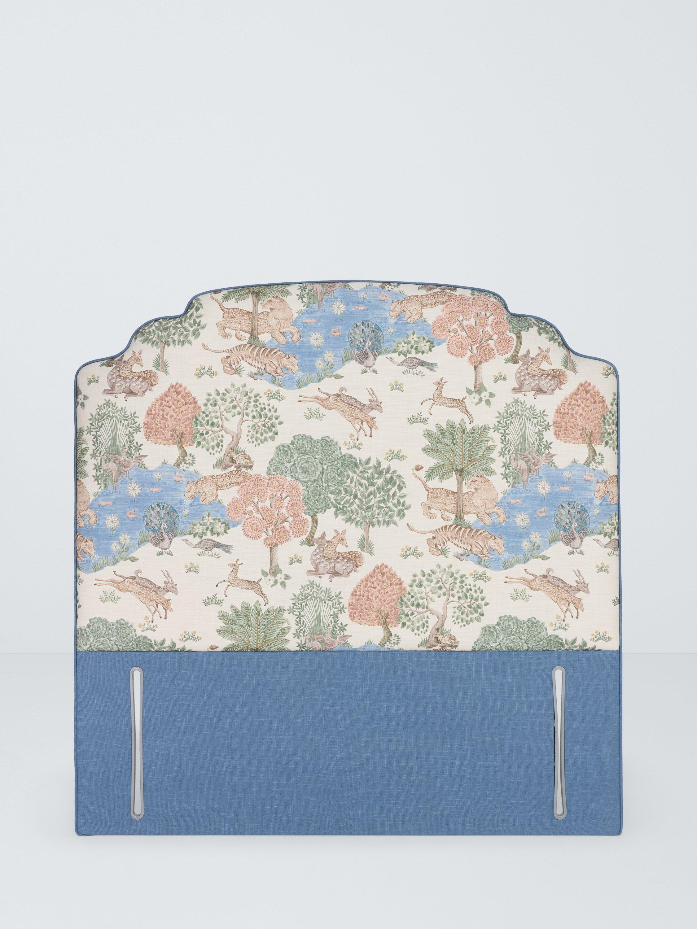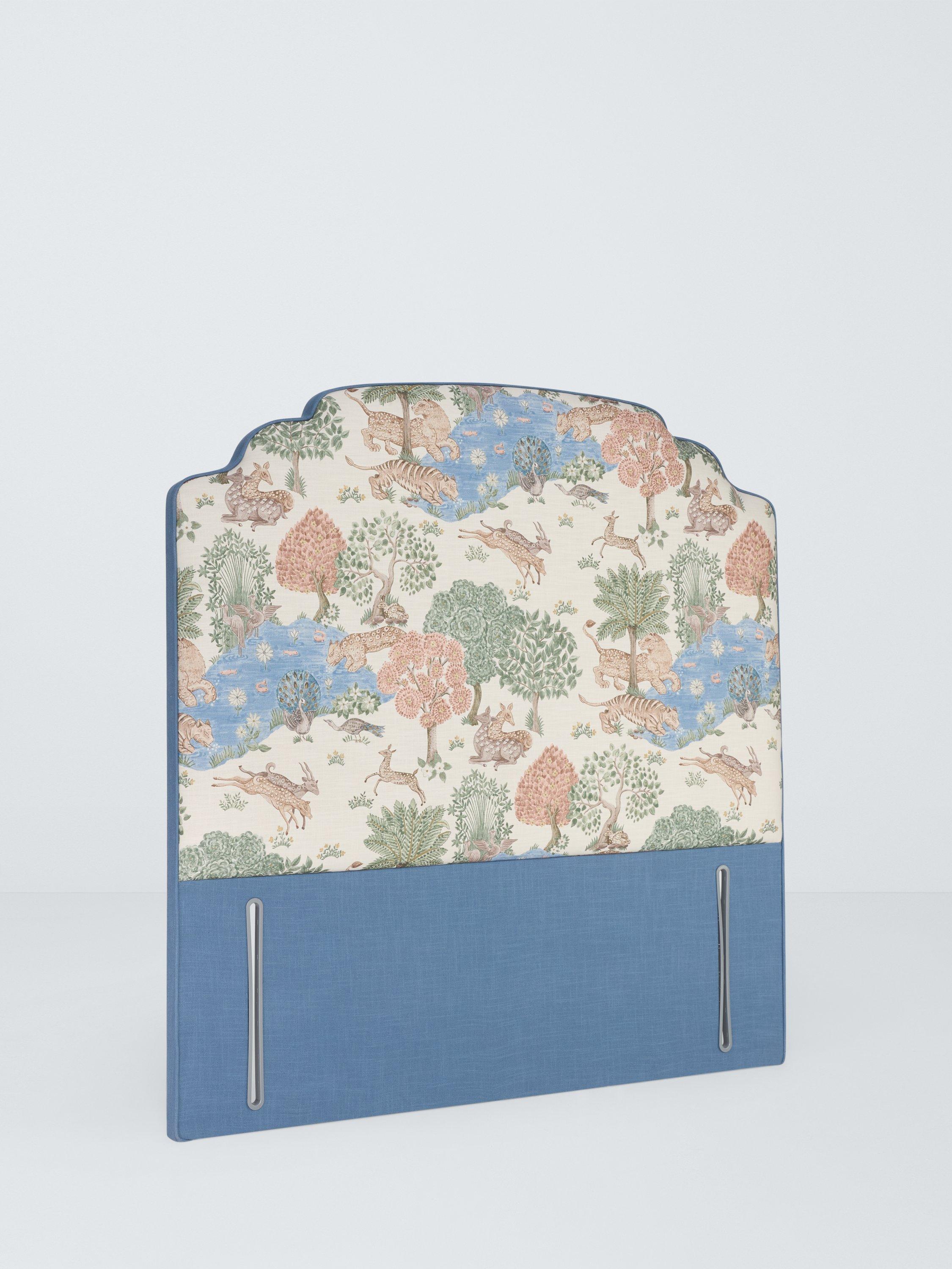 Handmade in the UK and designed in collaboration with Sanderson Design, this luxe, linen-upholstered headboard features the Pamir Garden fabric with piping in Tuscany Cobalt. It's a fantastical, 1970s-style print and represents a Persian garden and oasis scene of floral springs, stylised trees, tigers and antelopes.
