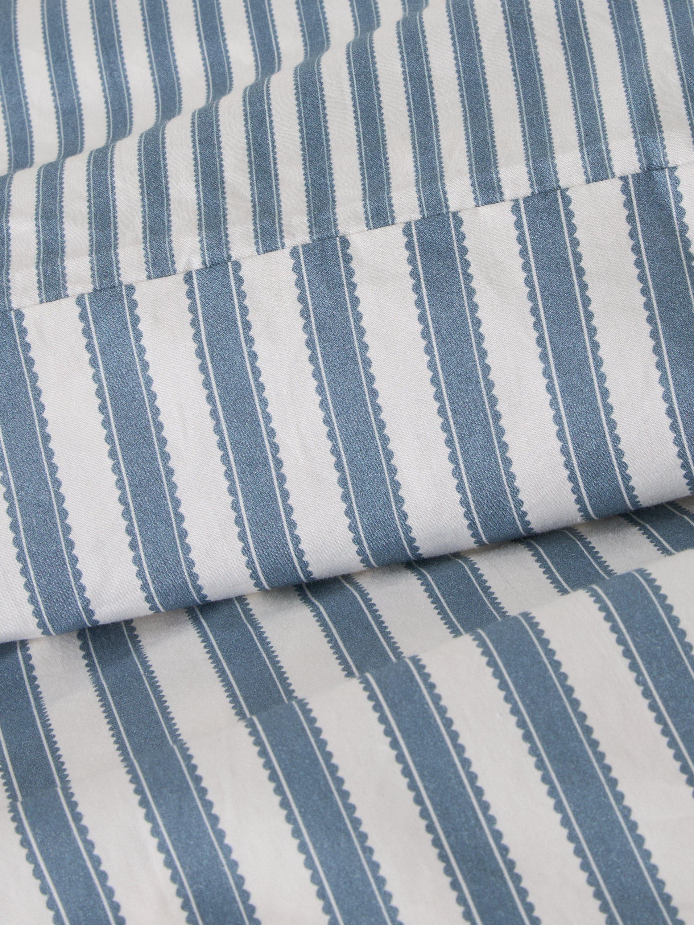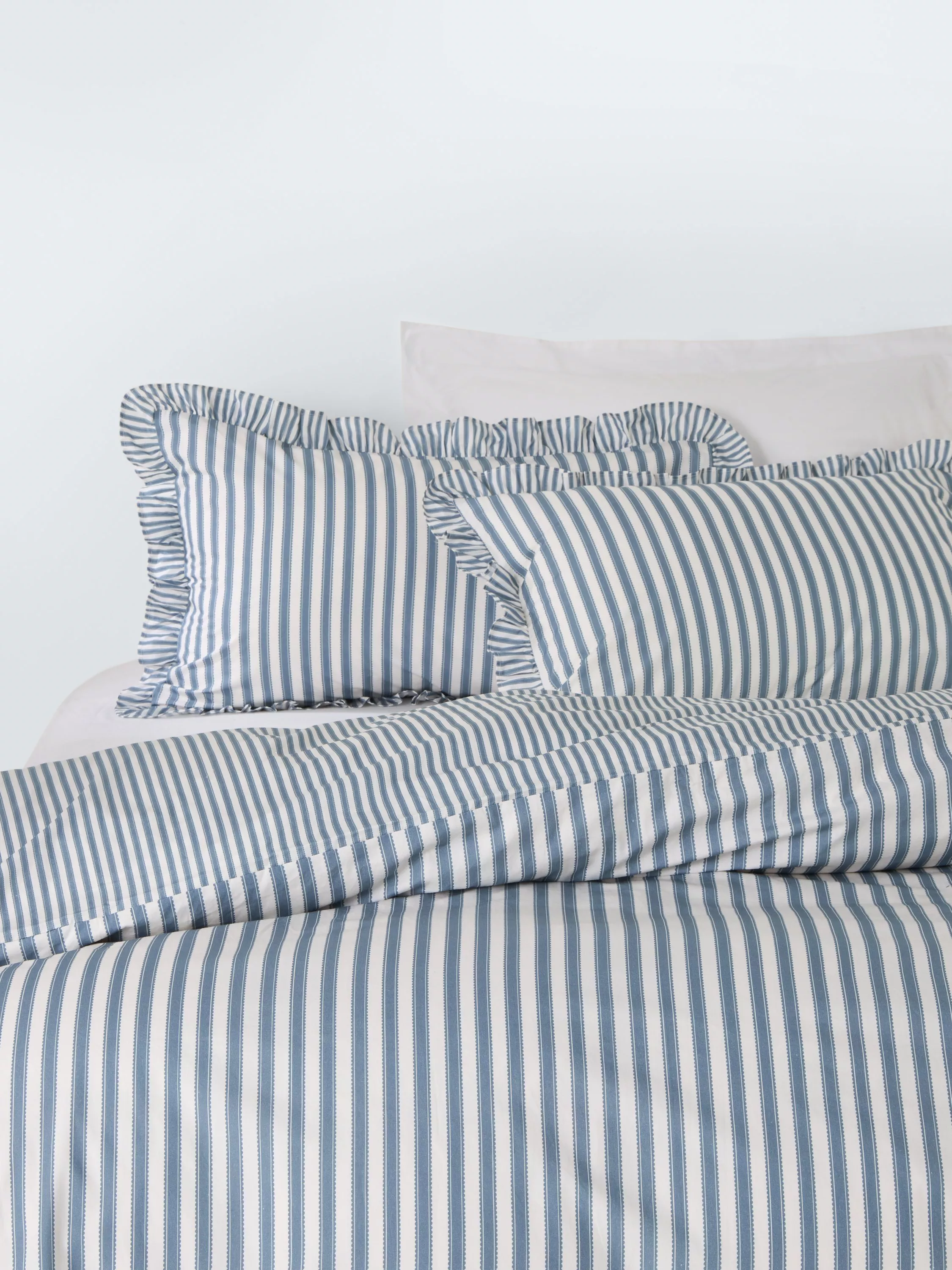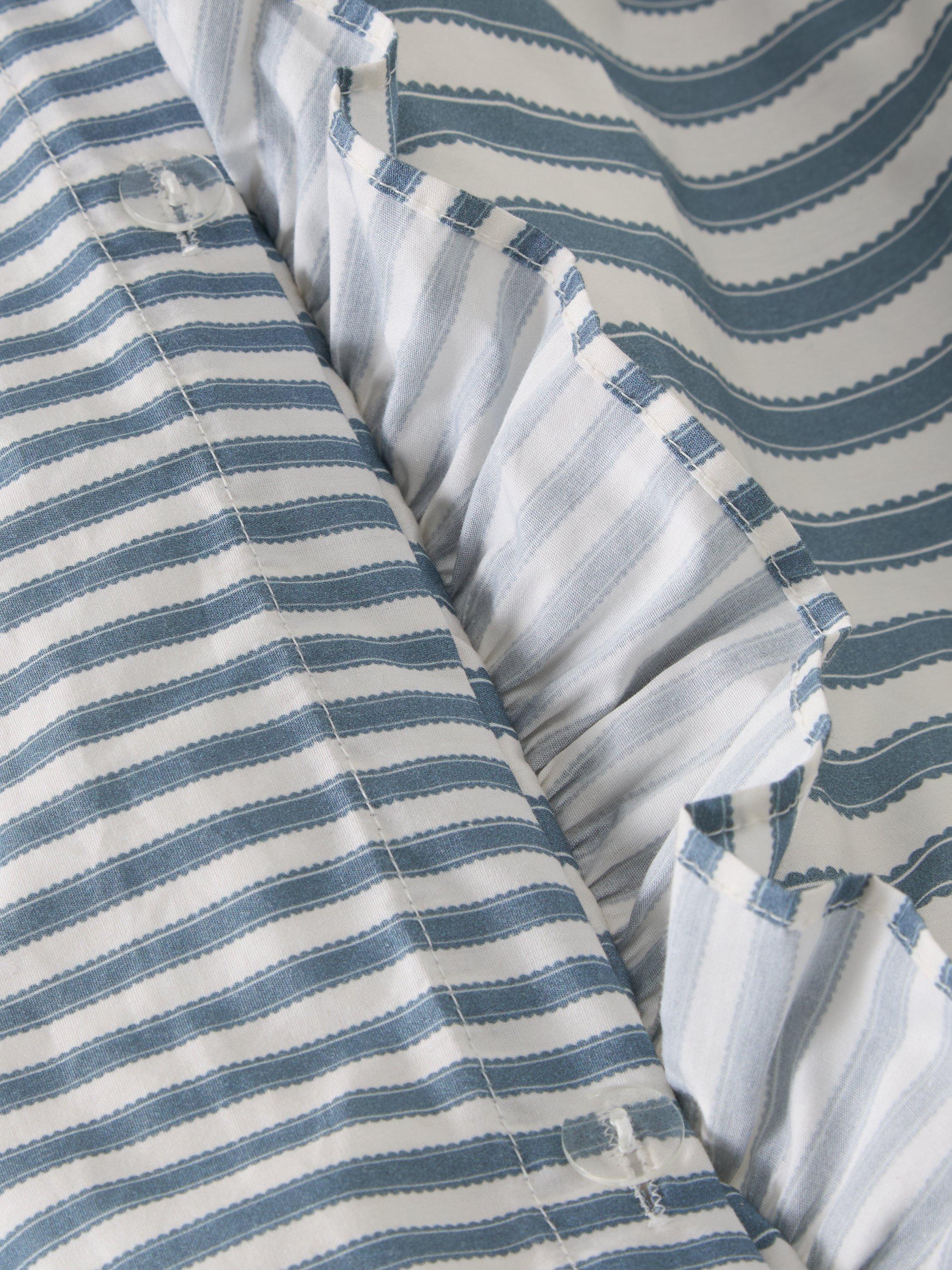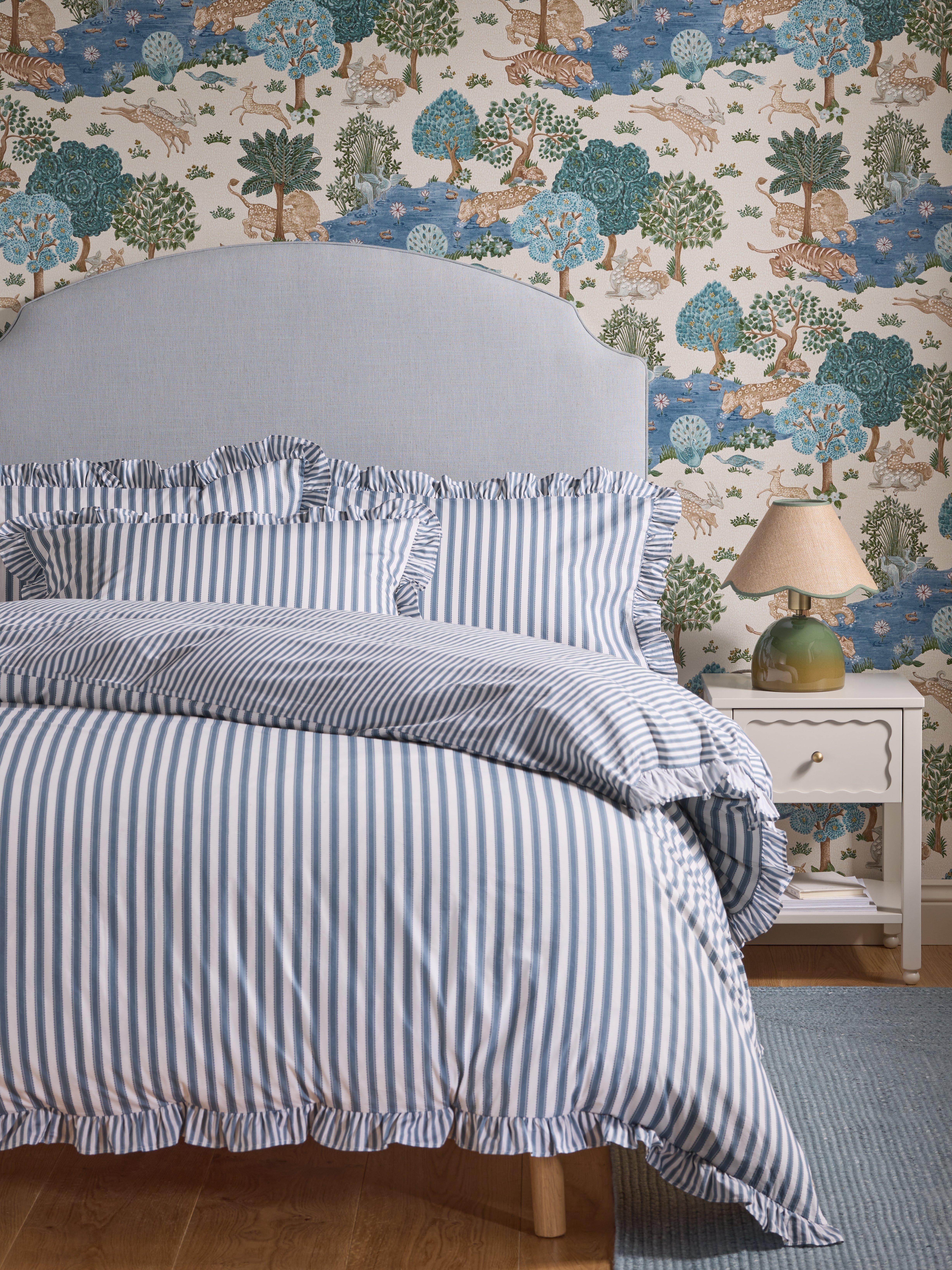 Pinetum (Latin for pine grove) is a smart pinstripe with scalloped edge detail that takes its name from the series of paths that lead across Bedgebury, the largest pinetum in the world. This printed bedding showcases a smaller-scale raw frill edge that completes the set across duvet and pillowcases.
