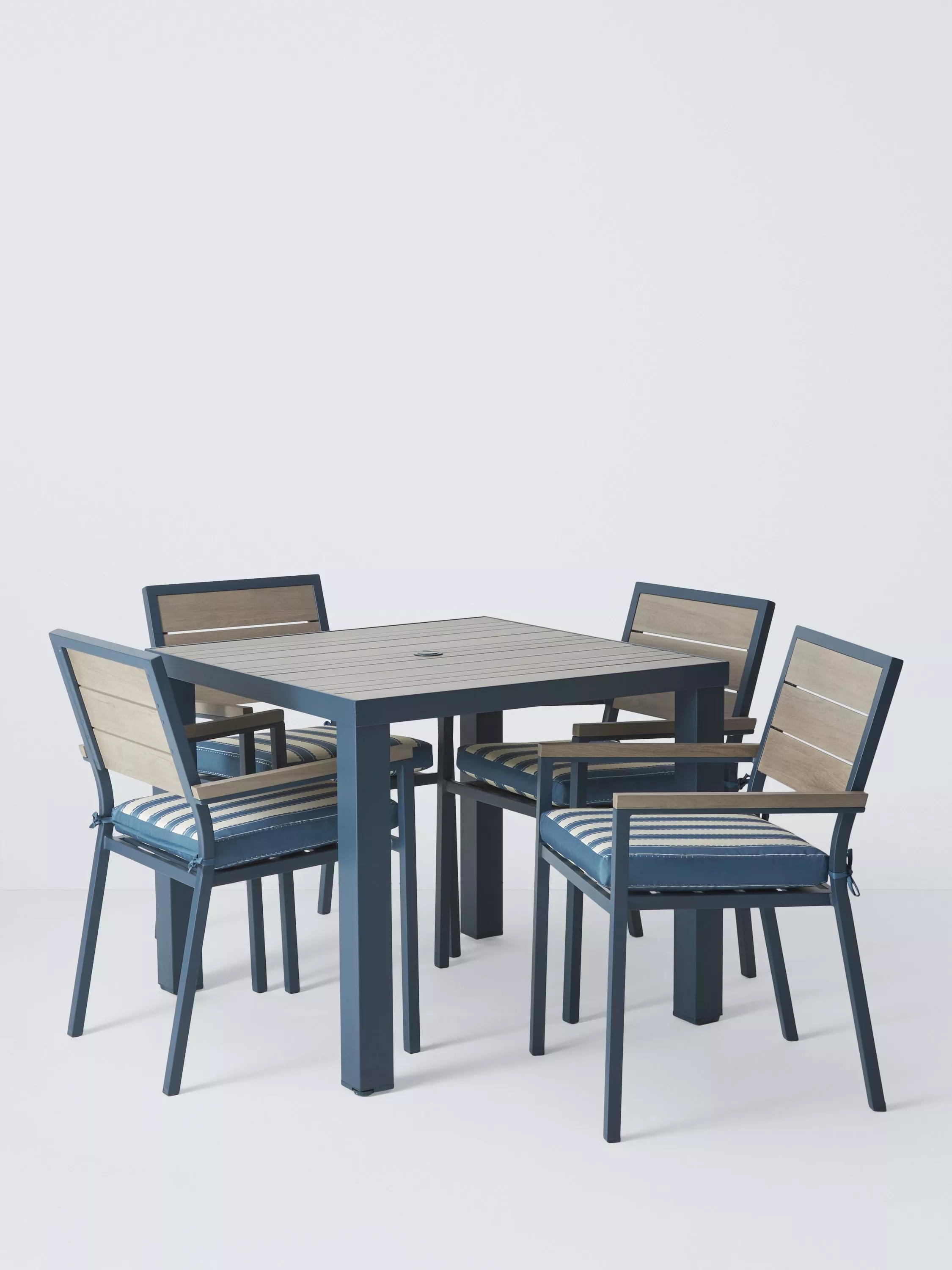 This lightweight and weather-resistant set includes a square table with a wood-effect top, echoed on the seats, backrests and armrests. Shower-resistant seat cushions provide comfortable support on the chairs.