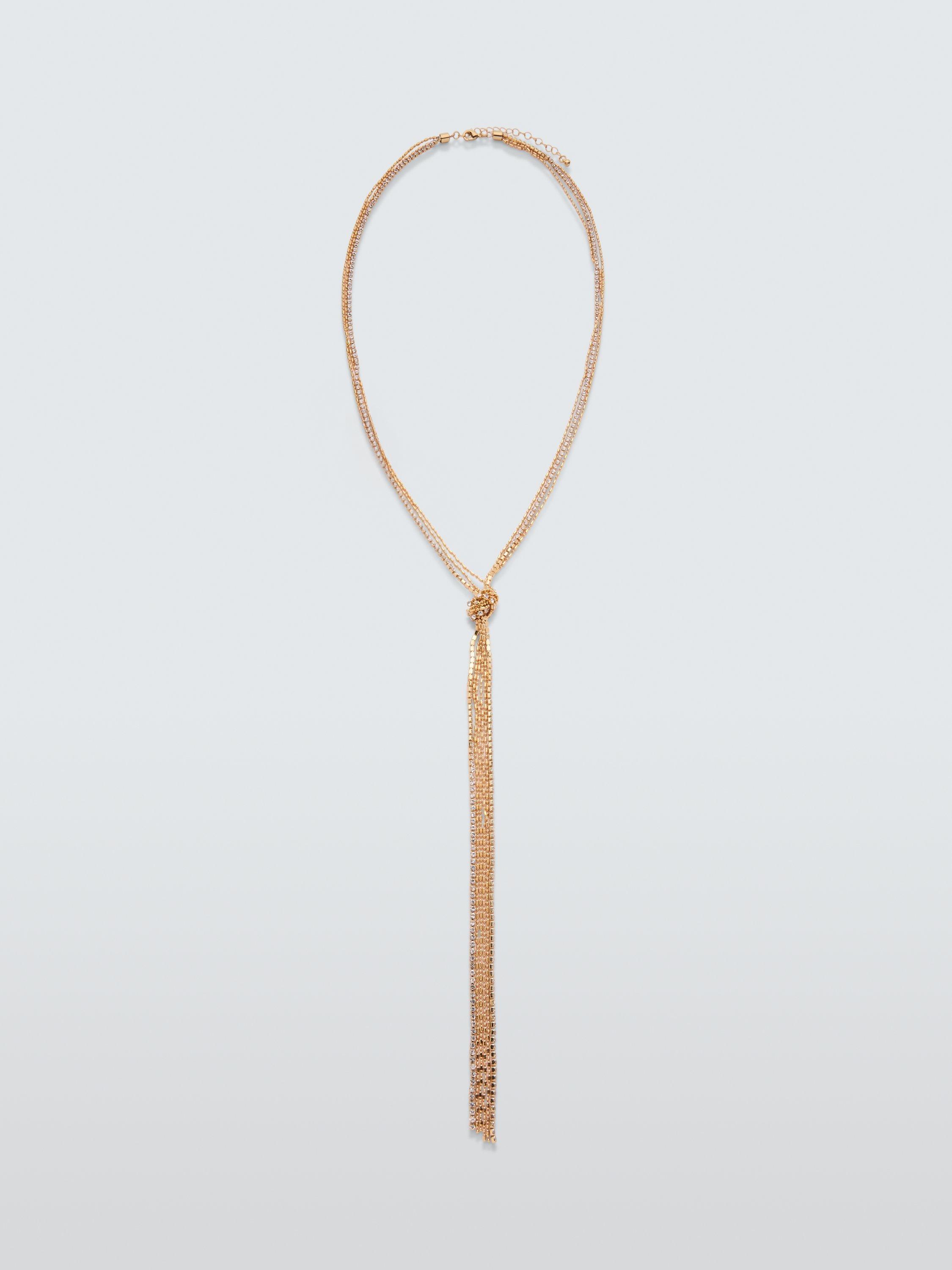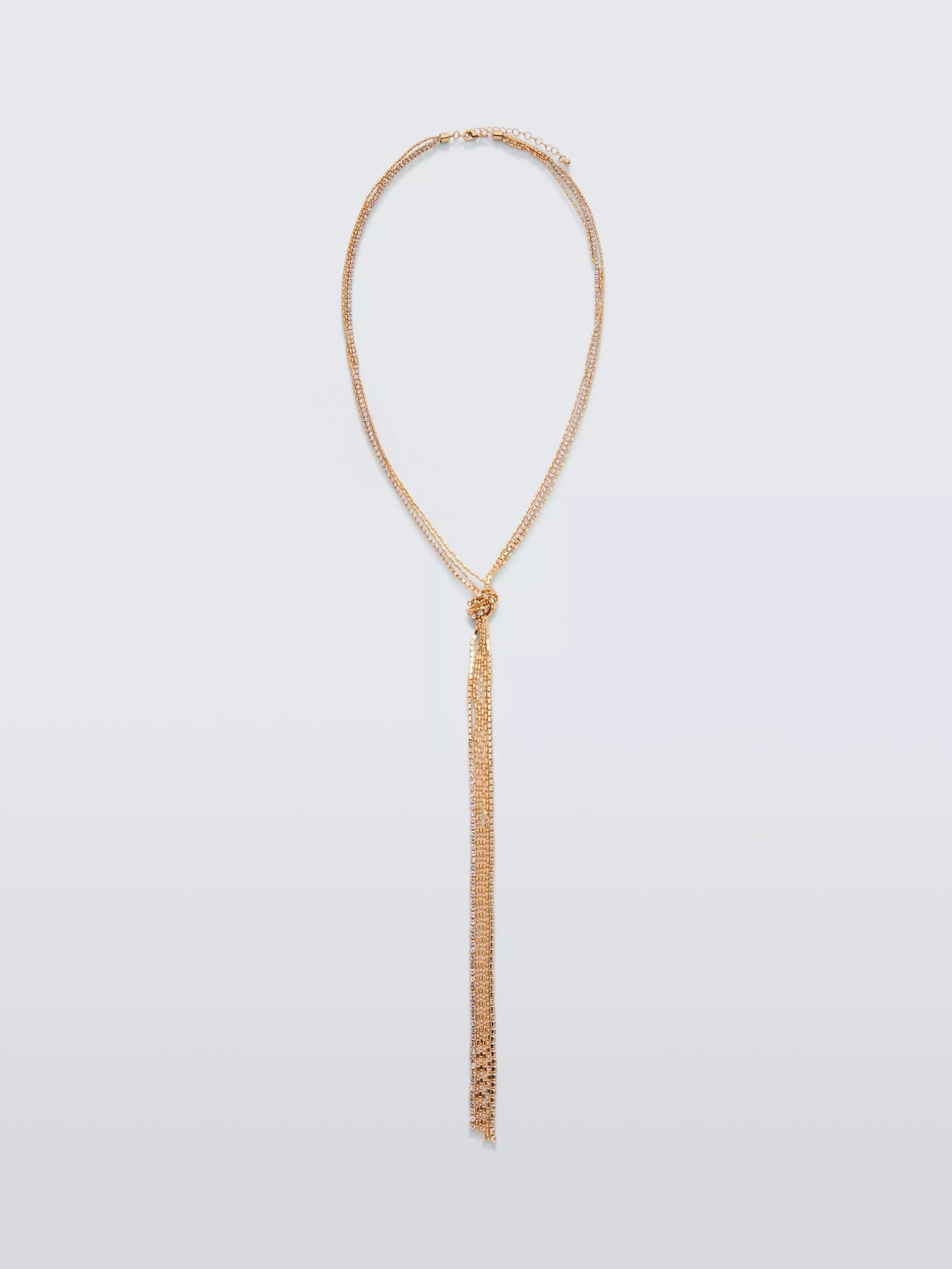 Add the finishing touch with our Y-shaped multi-row knotted chain necklace, detailed with diamante embellishments. Crafted in gold plated base metal.