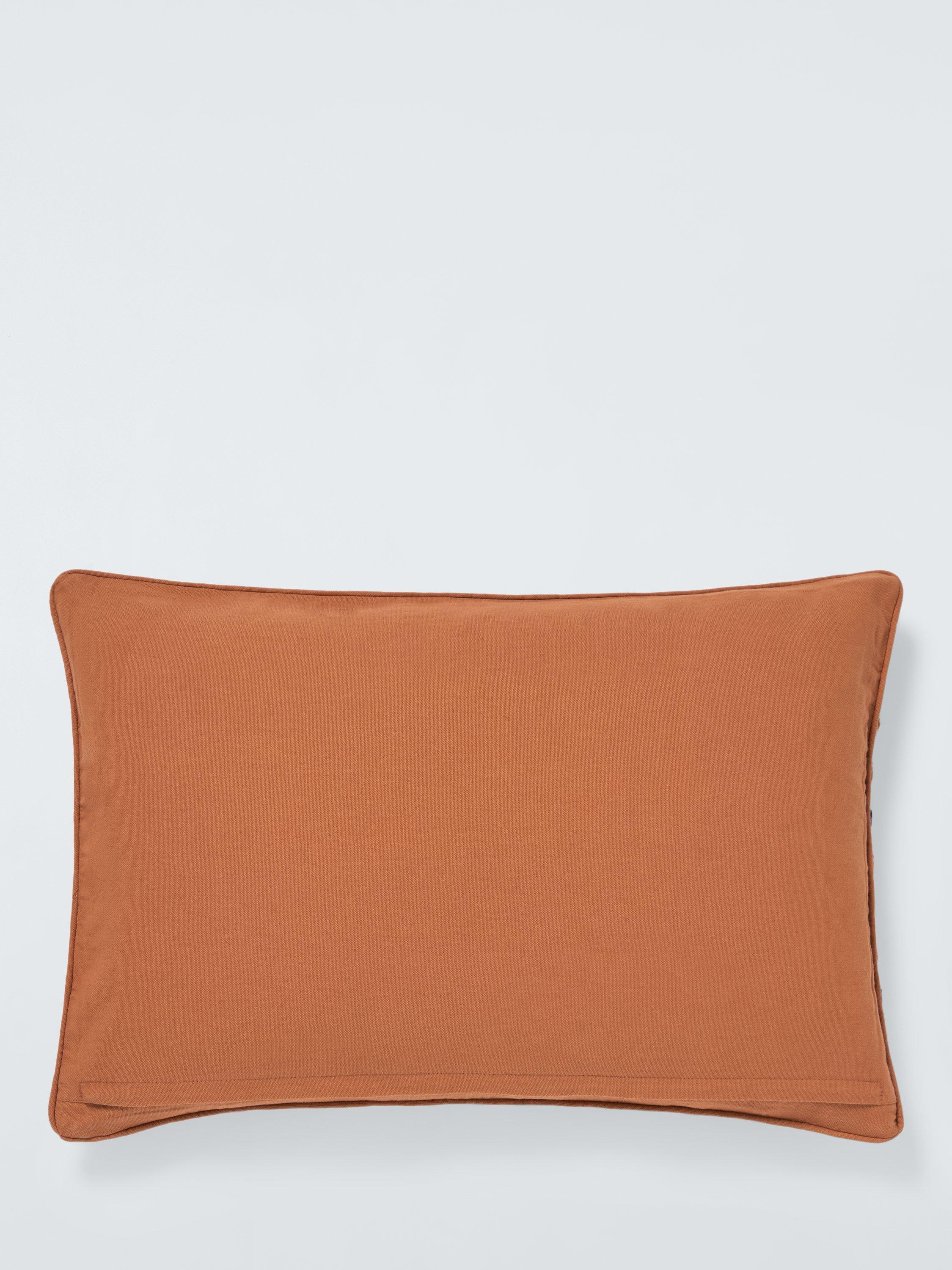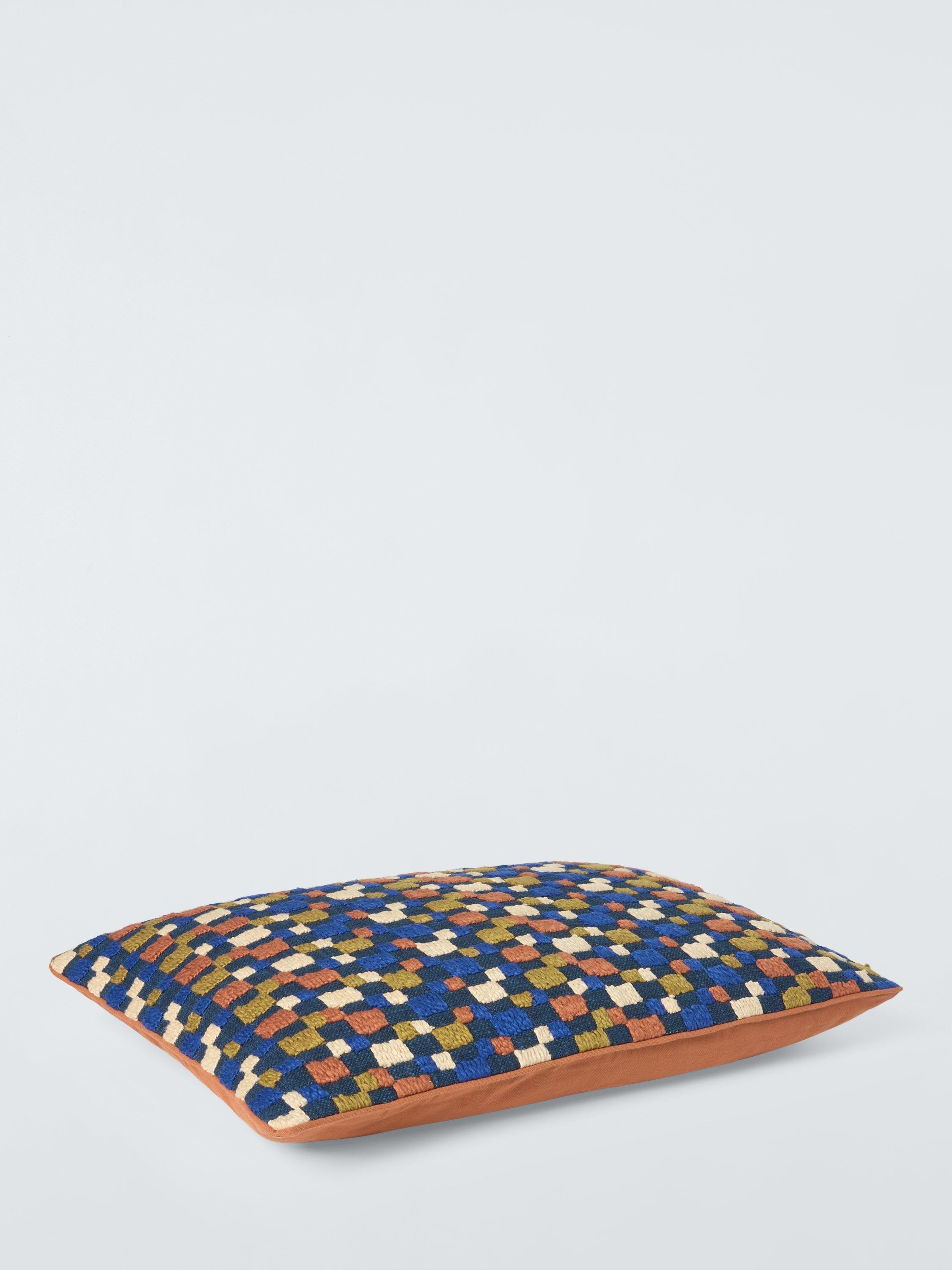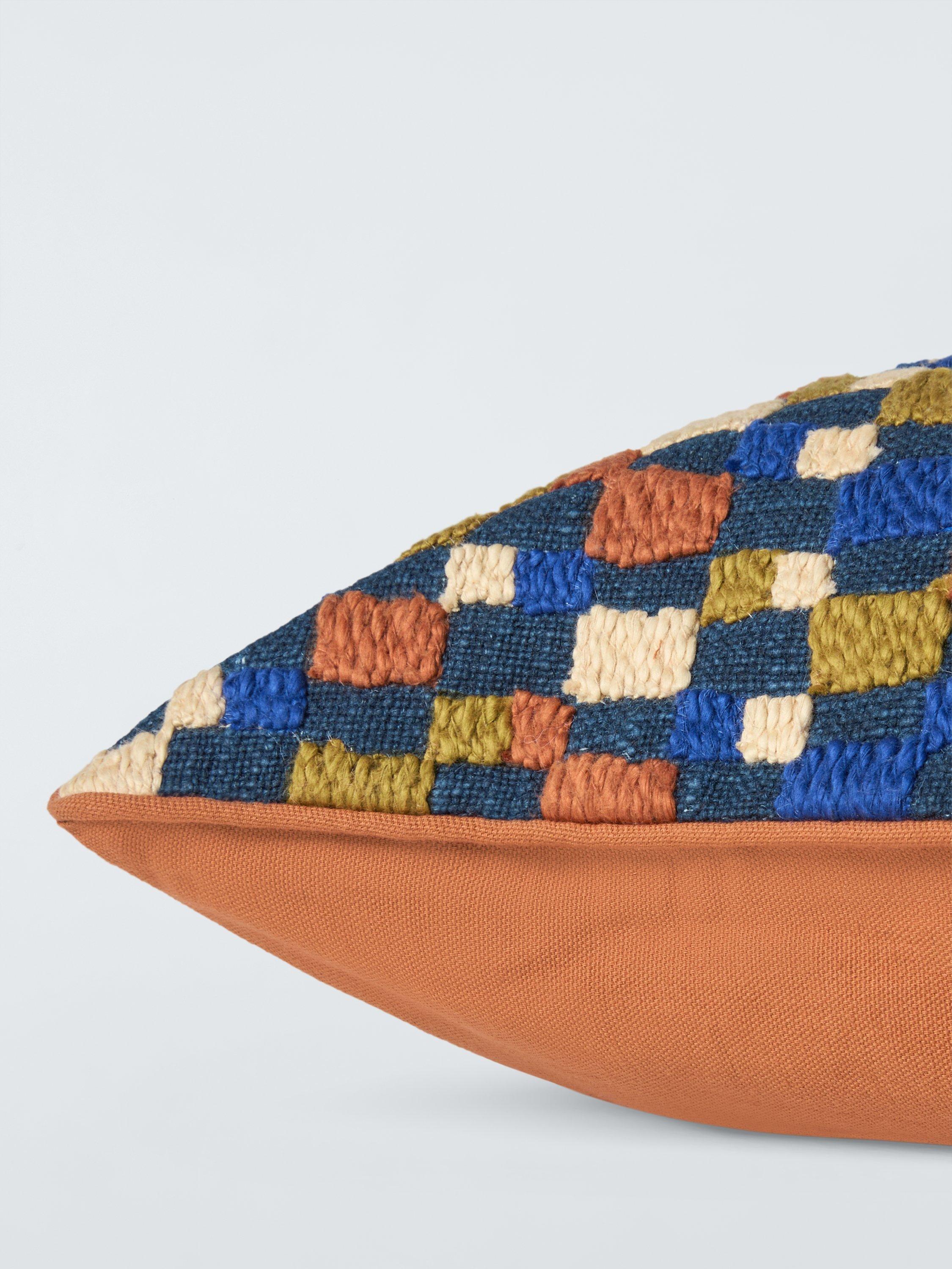 A woven cushion with coloured, straight stitch blocks. Feather filled.