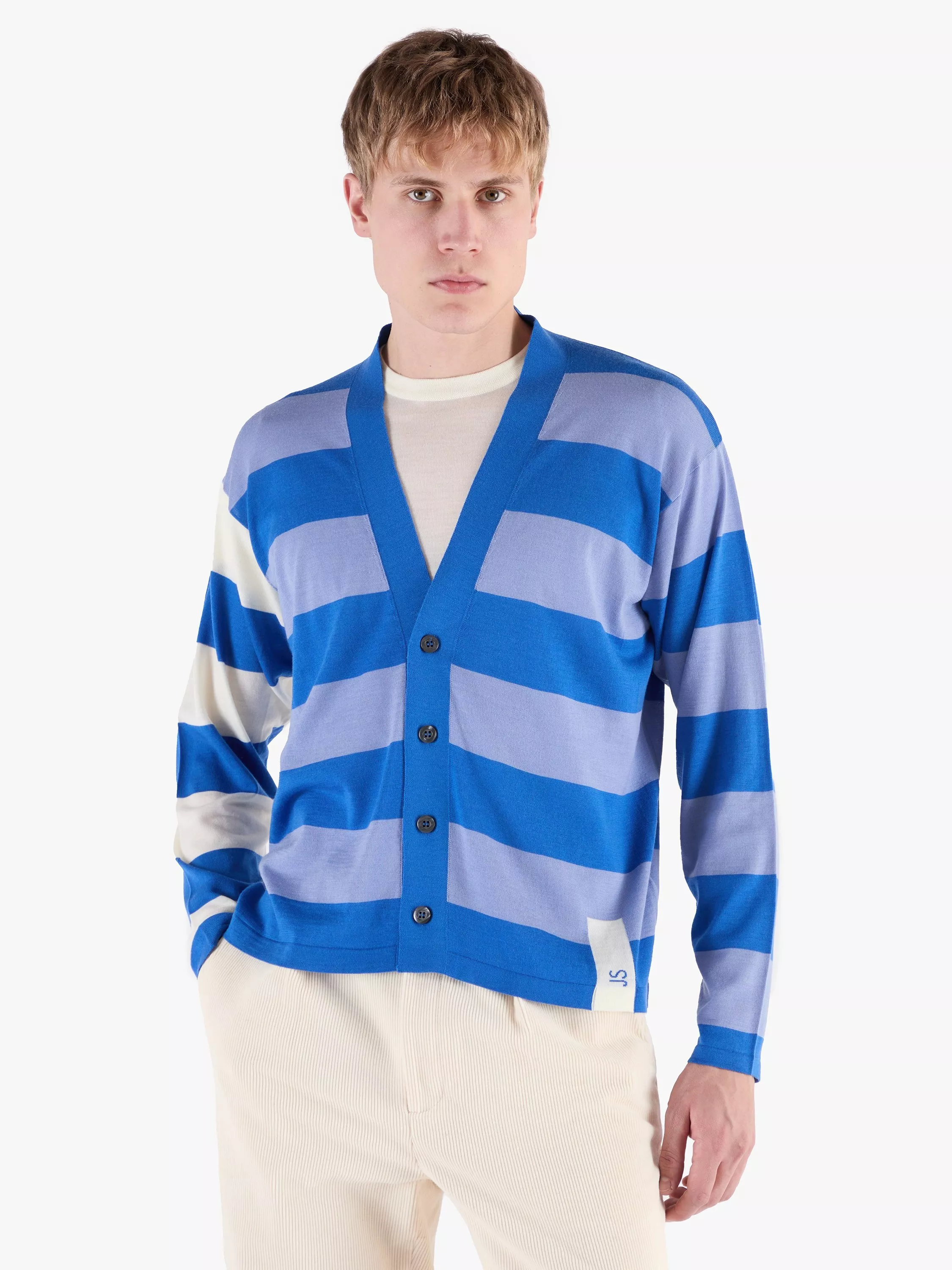 This contemporary, preppy take on the classic v-neck cardigan features bold stripes all over and contrast colours on one sleeve. Branded with the John Smedley logo to the bottom front hem for a signature stamp and knitted from the world's finest merino wool for unrivalled softness.Made in England since 1784.