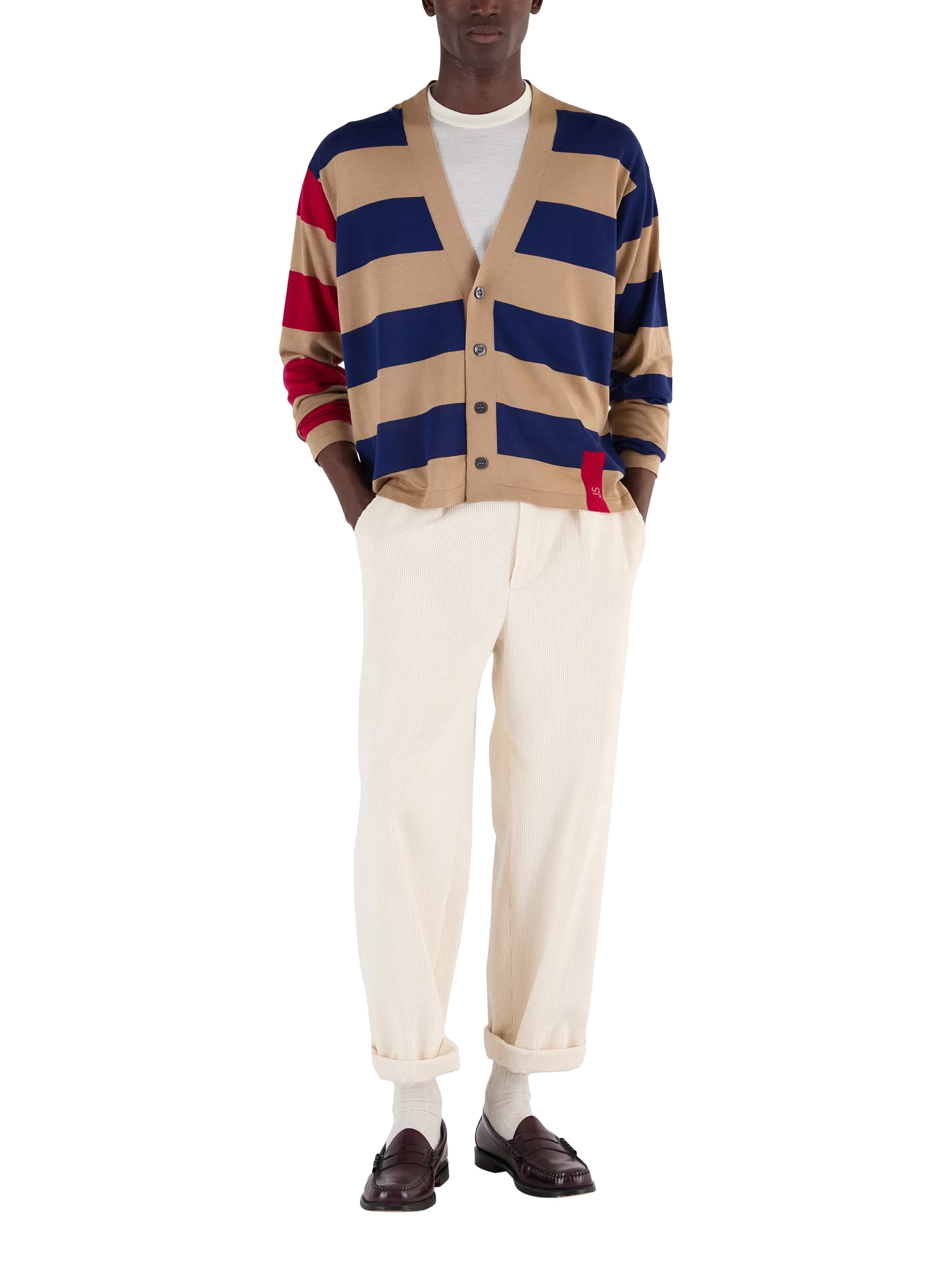 This contemporary, preppy take on the classic v-neck cardigan features bold stripes all over and contrast colours on one sleeve. Branded with the John Smedley logo to the bottom front hem for a signature stamp and knitted from the world's finest merino wool for unrivalled softness. Made in England since 1784.