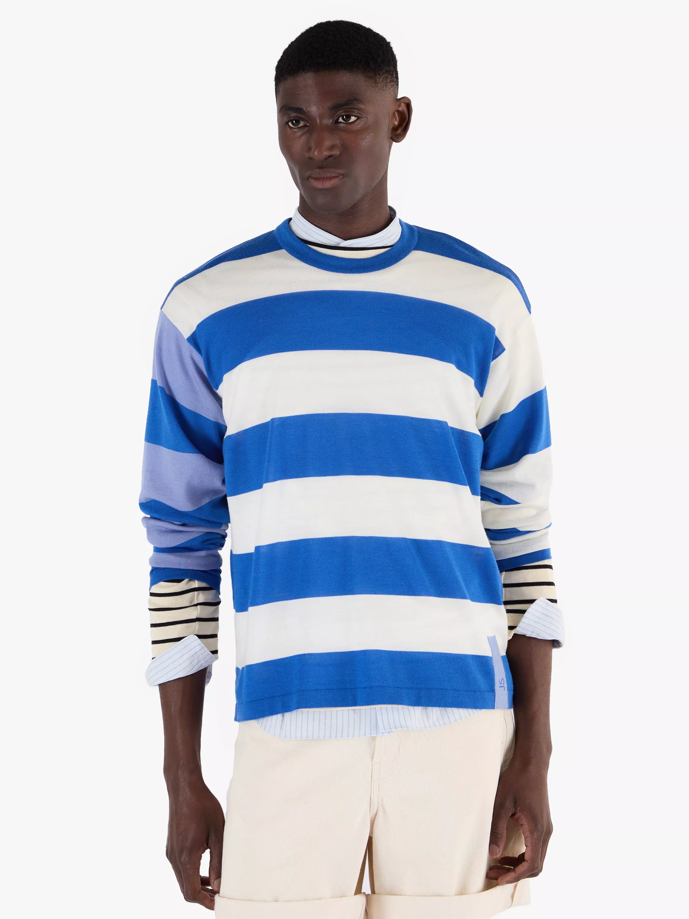 Available in a selection of vivid hues, this striking crew neck jumper features bold stripes all over and contrasting colours on one sleeve. Branded with the John Smedley logo to the bottom front hem for a signature stamp and knitted from the world's finest merino wool for unrivalled softness. It's designed with a boxy, modern silhouette, to ensure it is truly unisex, and can be worn by women and men alike.