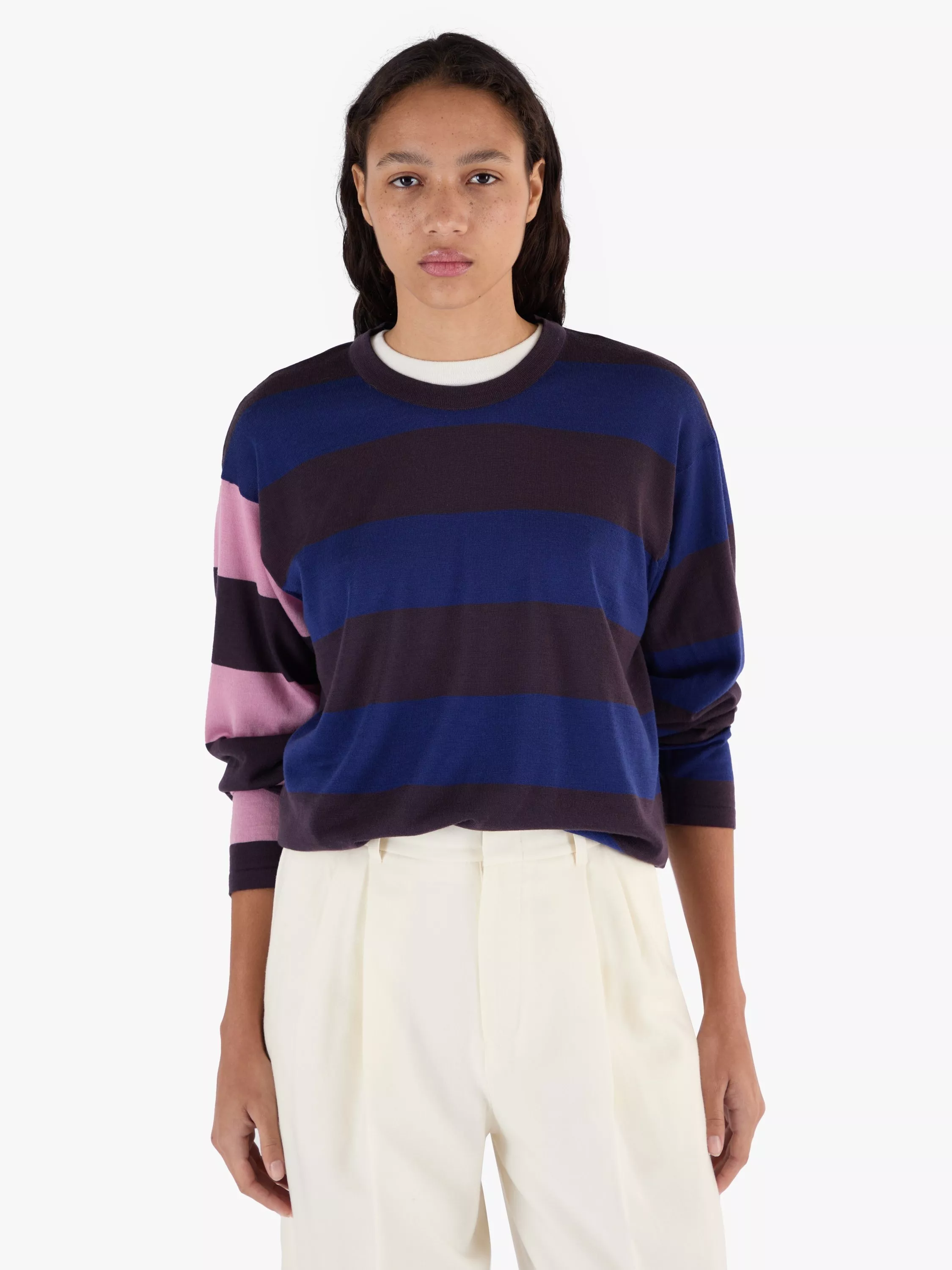 Available in a selection of vivid hues, this striking crew neck jumper features bold stripes all over and contrasting colours on one sleeve. Branded with the John Smedley logo to the bottom front hem for a signature stamp and knitted from the world's finest merino wool for unrivalled softness. It's designed with a boxy, modern silhouette, to ensure it is truly unisex, and can be worn by women and men alike.