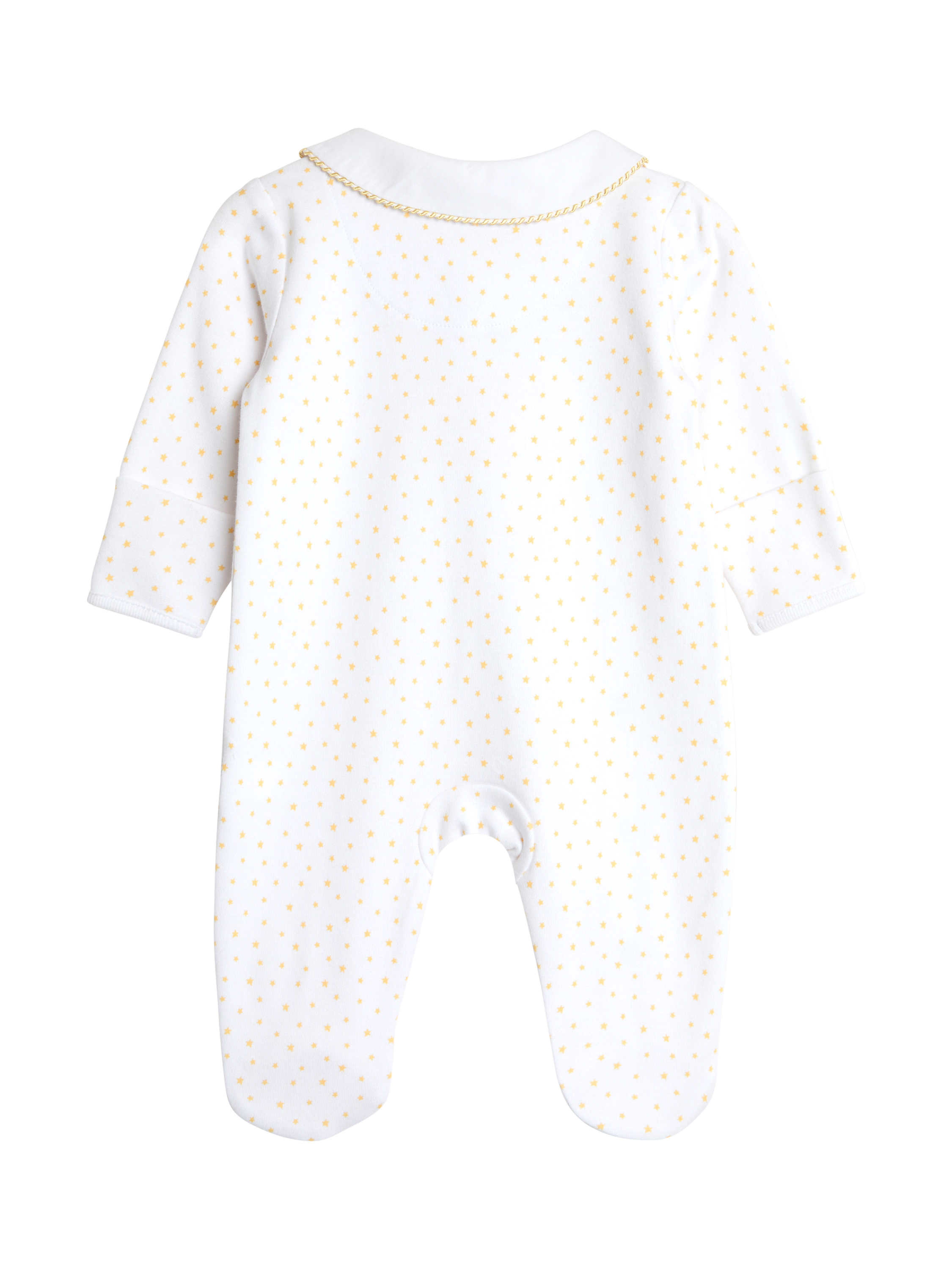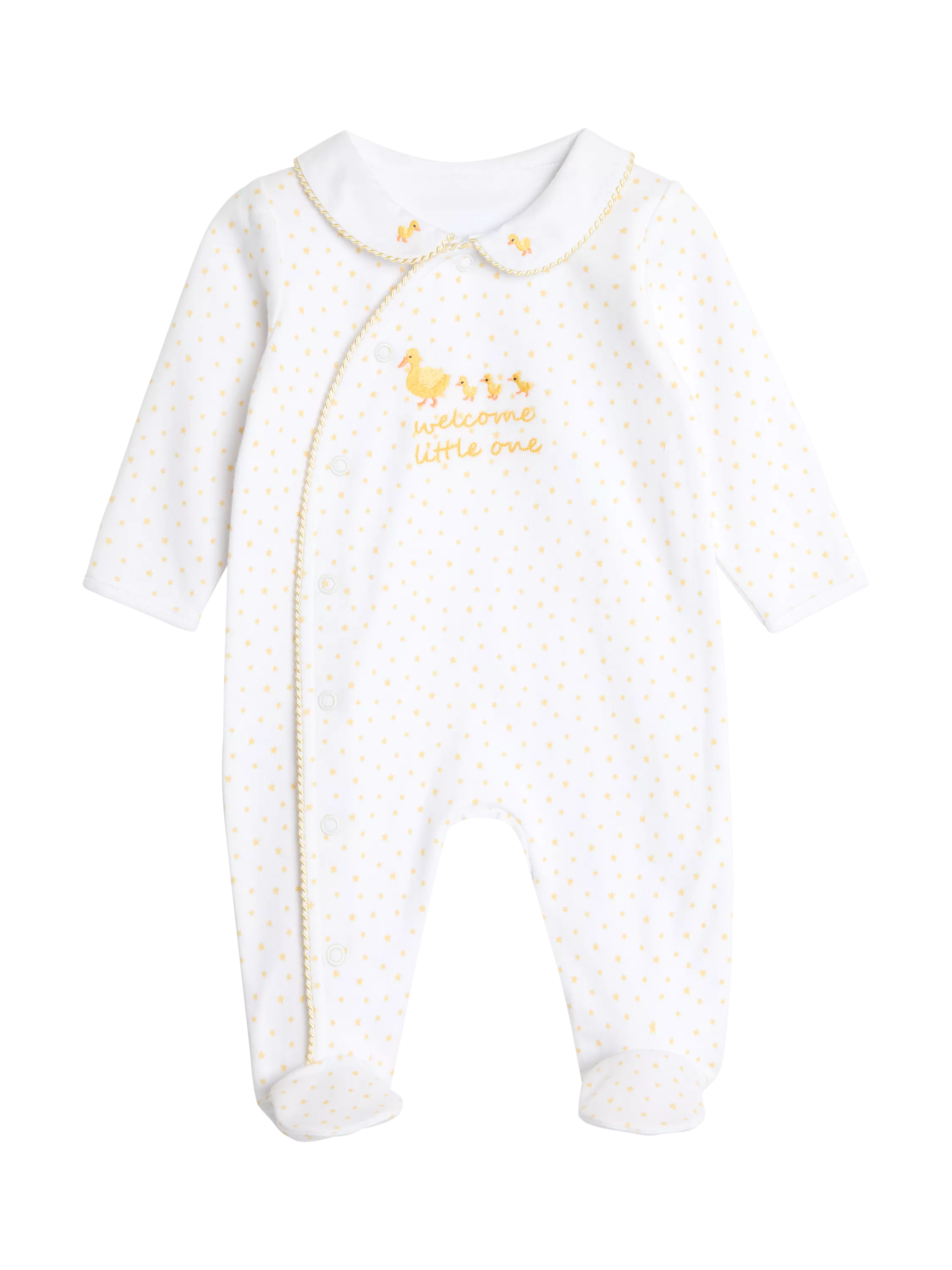 Adorned with delicately embroidered ducks and twinkling stars, this sleepsuit adds that extra special touch. Made from the softest cotton, it’s gentle on delicate skin, and the smaller sizes even come with built-in scratch cuffs for added protection. Fold-over scratch cuffs up to size 9-12 months, while sizes 9-12 months and up feature anti-slip dots on feet.