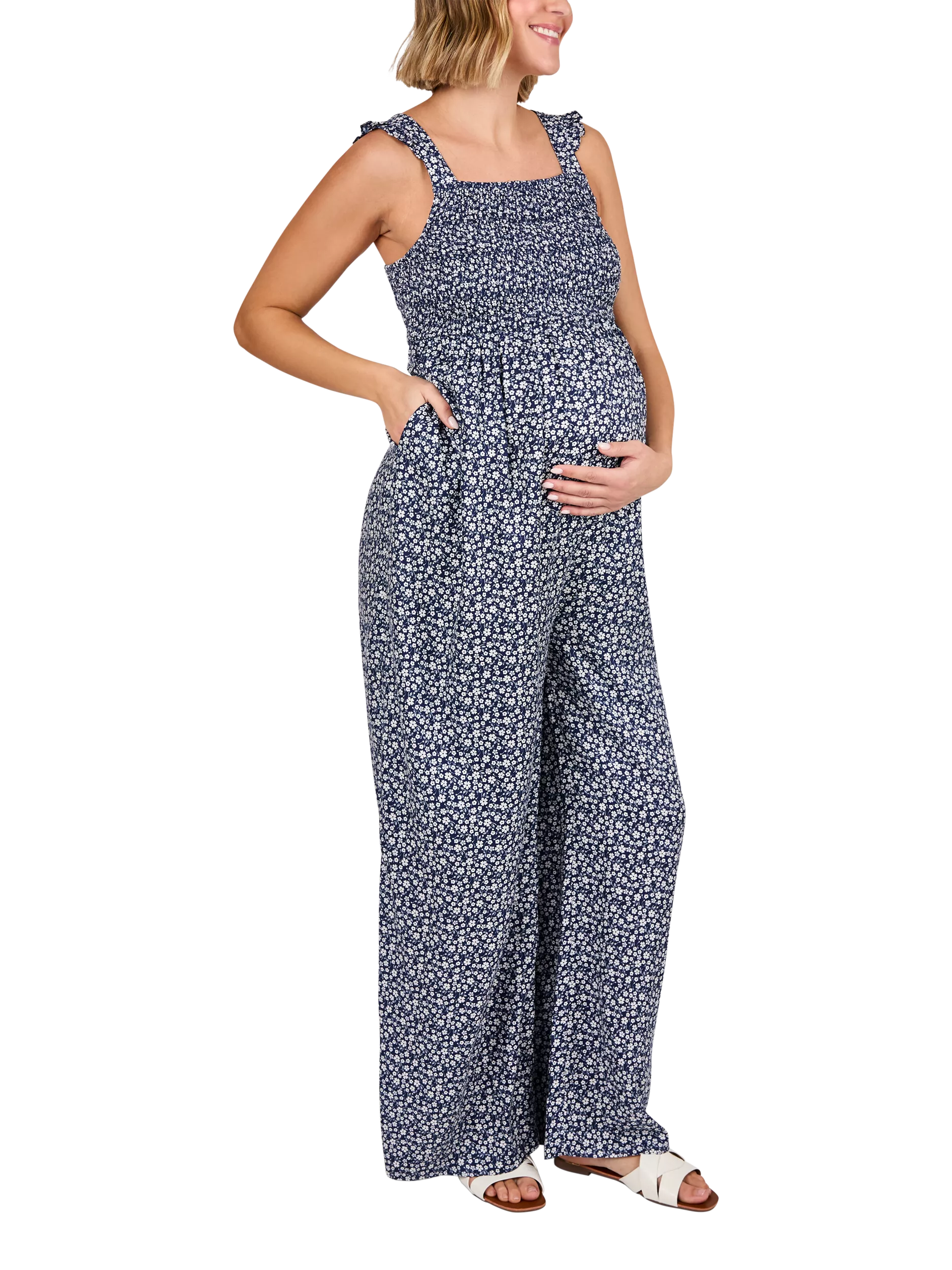 Get ready for stylish spring days with this ditsy floral maternity jumpsuit. The stretchy shirred material across the bodice allows for comfortable movement, whilst the soft airy legs will keep you cool in the warmer weather, ideal for parties, brunches or garden-lounging days.