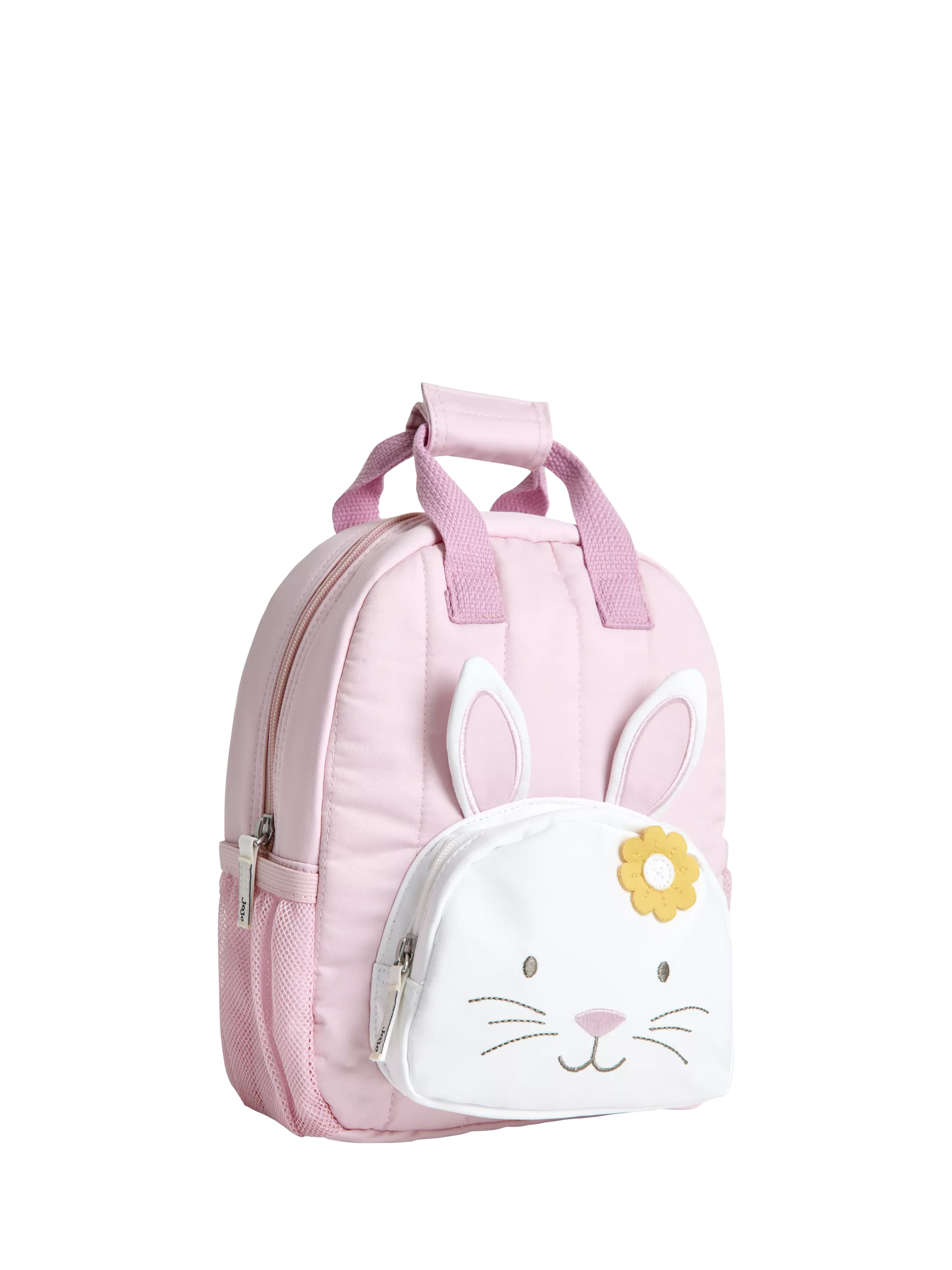 Hop into nursery days, playdates and more with this bunny Character Backpack. With space to pack everything your little adventurer needs, this loveable bunny features a 3D face pocket on quilted fabric, big pointy ears and a little flower charm, that only adds to its sweetness. The contrasting lined straps are not only comfy, but colourful and the bag is perfectly sized for storing snacks, toys and little flower chains. Plus, it comes with a pocket at the side which is perfect for placing a drink or water bottle. And with sturdy zips and extra handles for hanging up, little ones will be walking into nursery with a spring in their step.