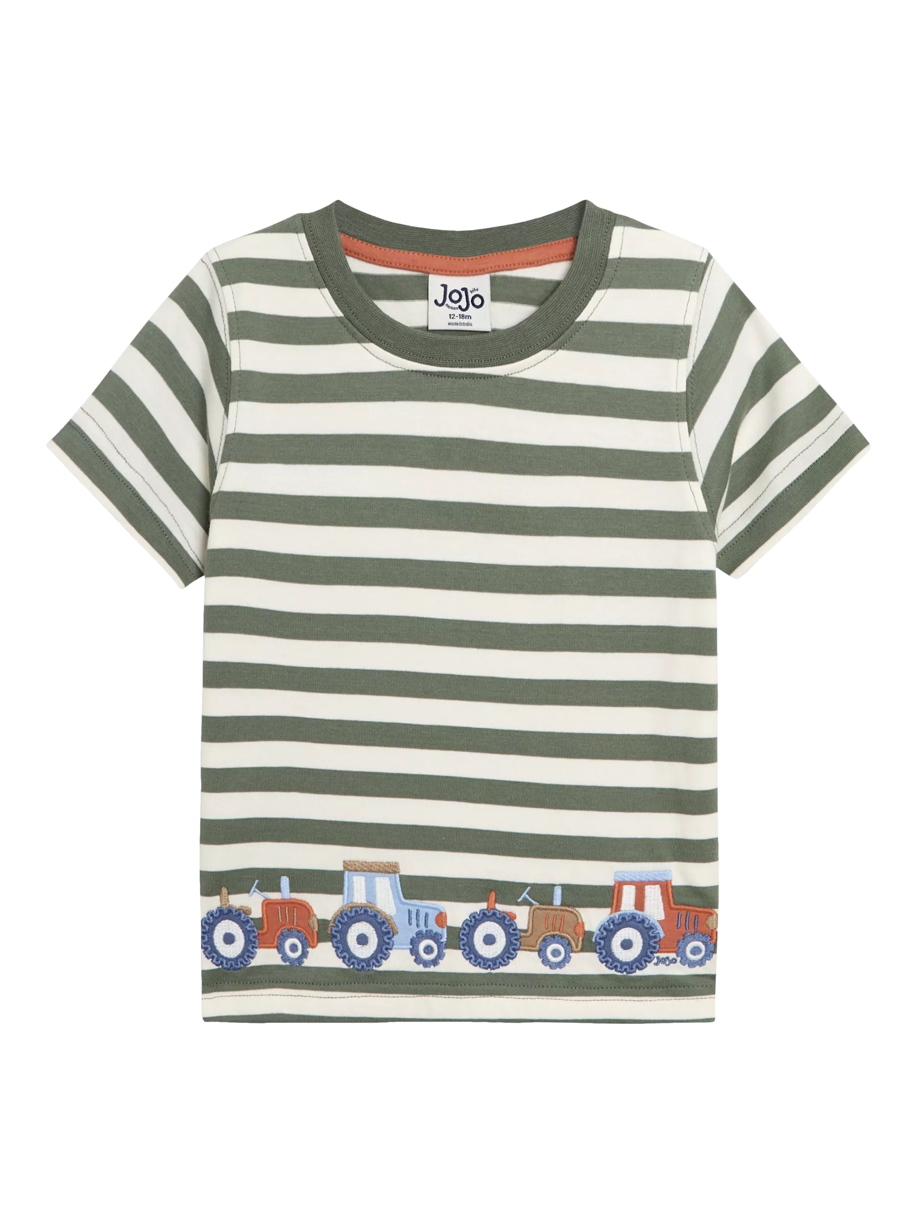 JoJo Maman BébéKids' Cotton Stripe Tractor Applique T-Shirt, Khaki, 6-12 months