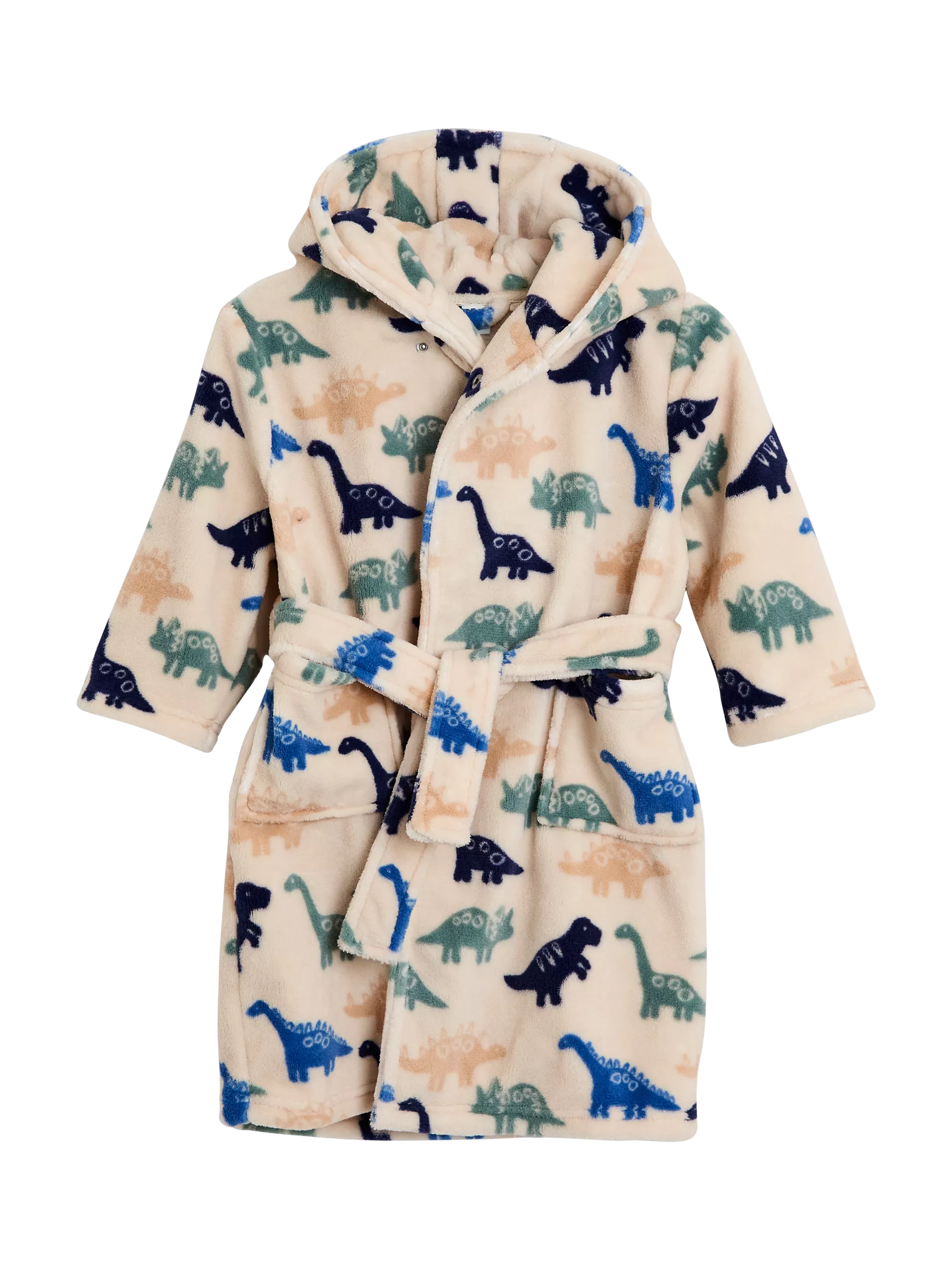 Wrap your little one in jurassic cosiness with this Dinosaur printed dressing gown. Made from soft, absorbent towelling fabric, it's perfect for post-bath cuddles and lazy mornings. The many different dinos add a roarsome twist, while the toasty hood, tie belt, and roomy pockets keep things comfy and practical. Whether they’re racing around the house pretending it’s a superhero cape or just winding down after a splashy bath, this robe is made for everyday magic.
