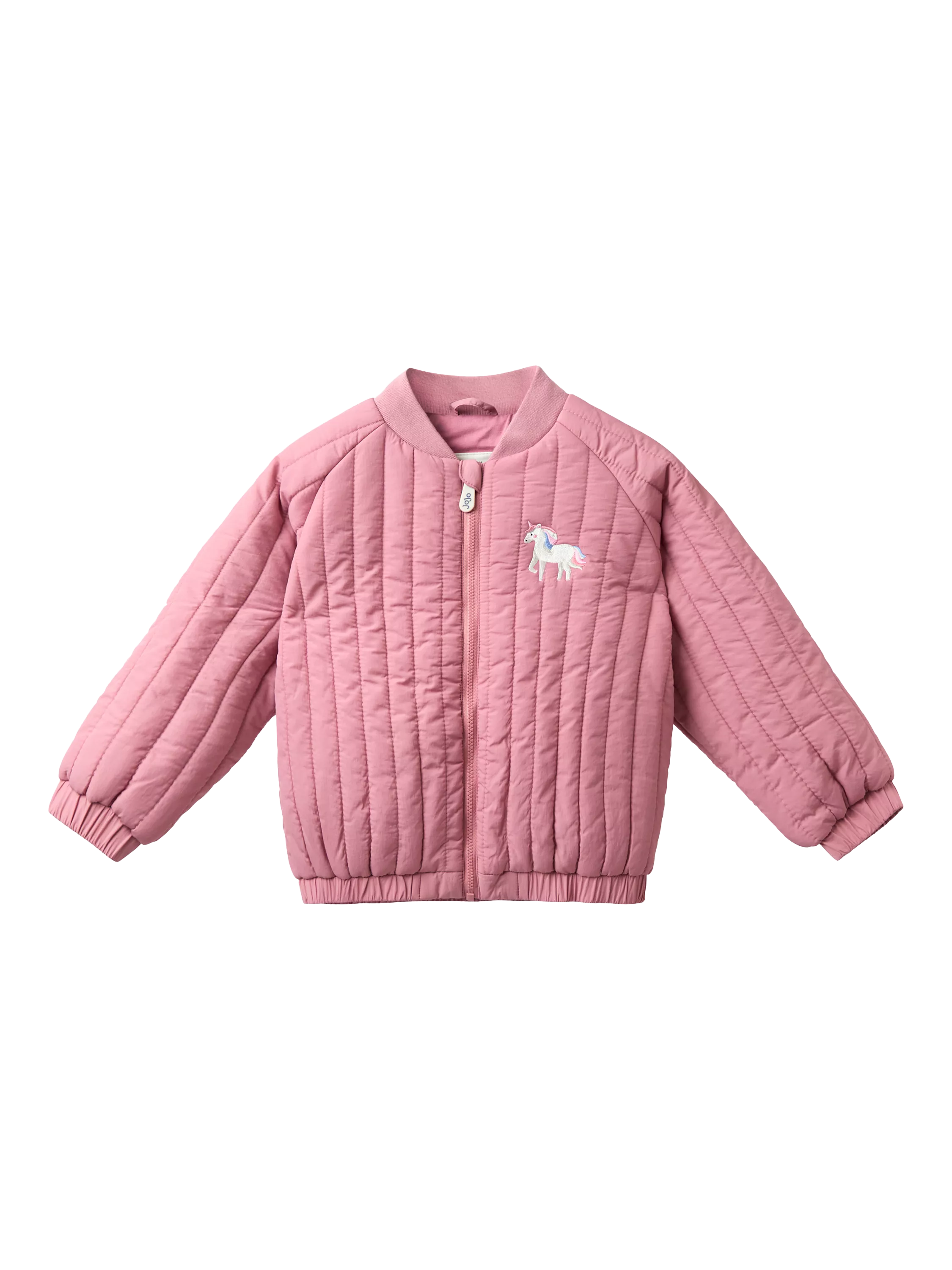 Add a dash of magic to their outdoor adventures with this bomber jacket. Made to layer, and designed with drizzle in mind, this jacket is a staple for any little trendsetters' autumn wardrobe. Features comfy quilting, cuffed hems, unicorn embroidered details on the front and back, and a zip closure.