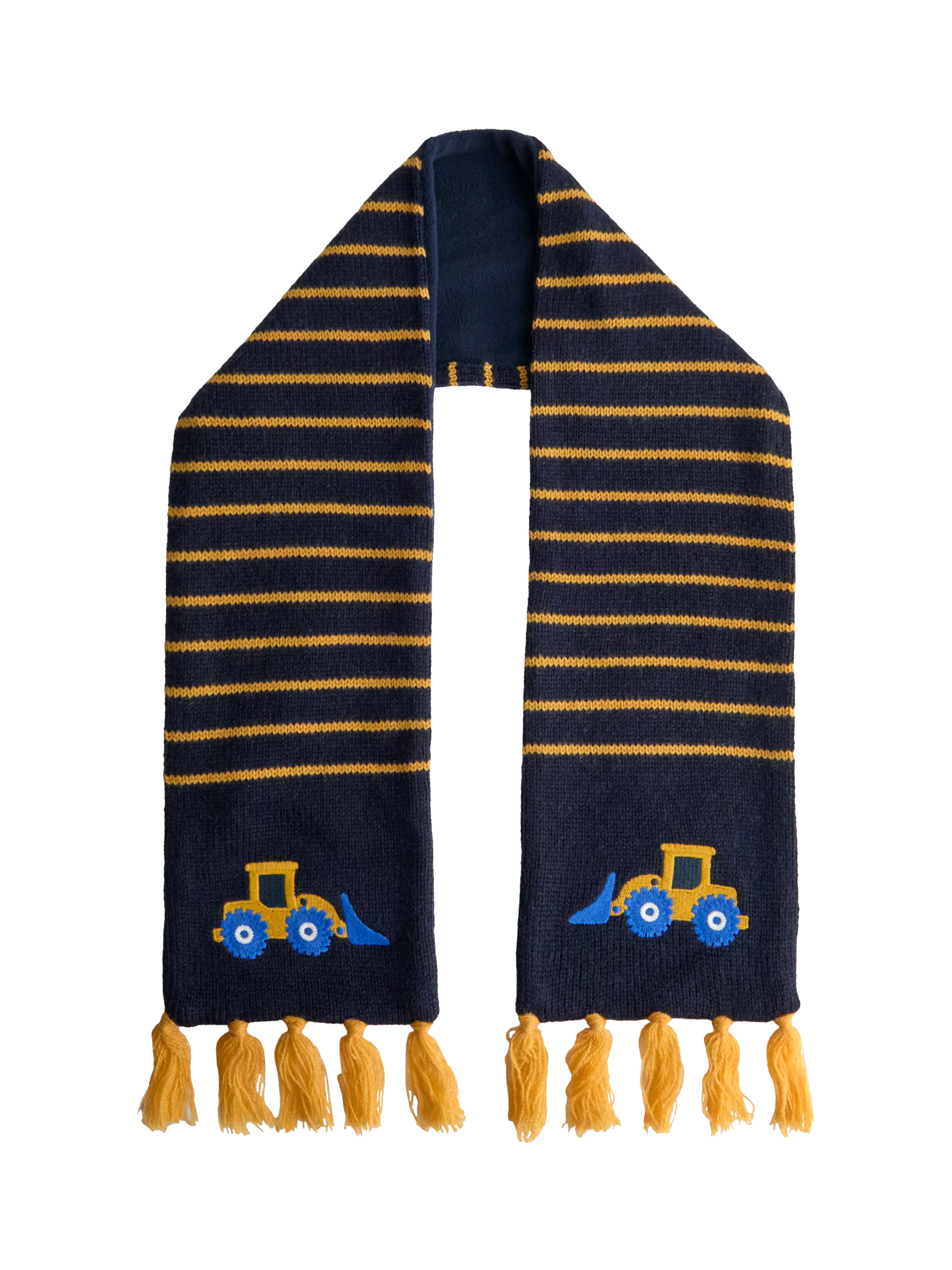With a tractor design, chunky knit texture and yellow stripes, this scarf is made from a wool blend and is complete with tassel trim.